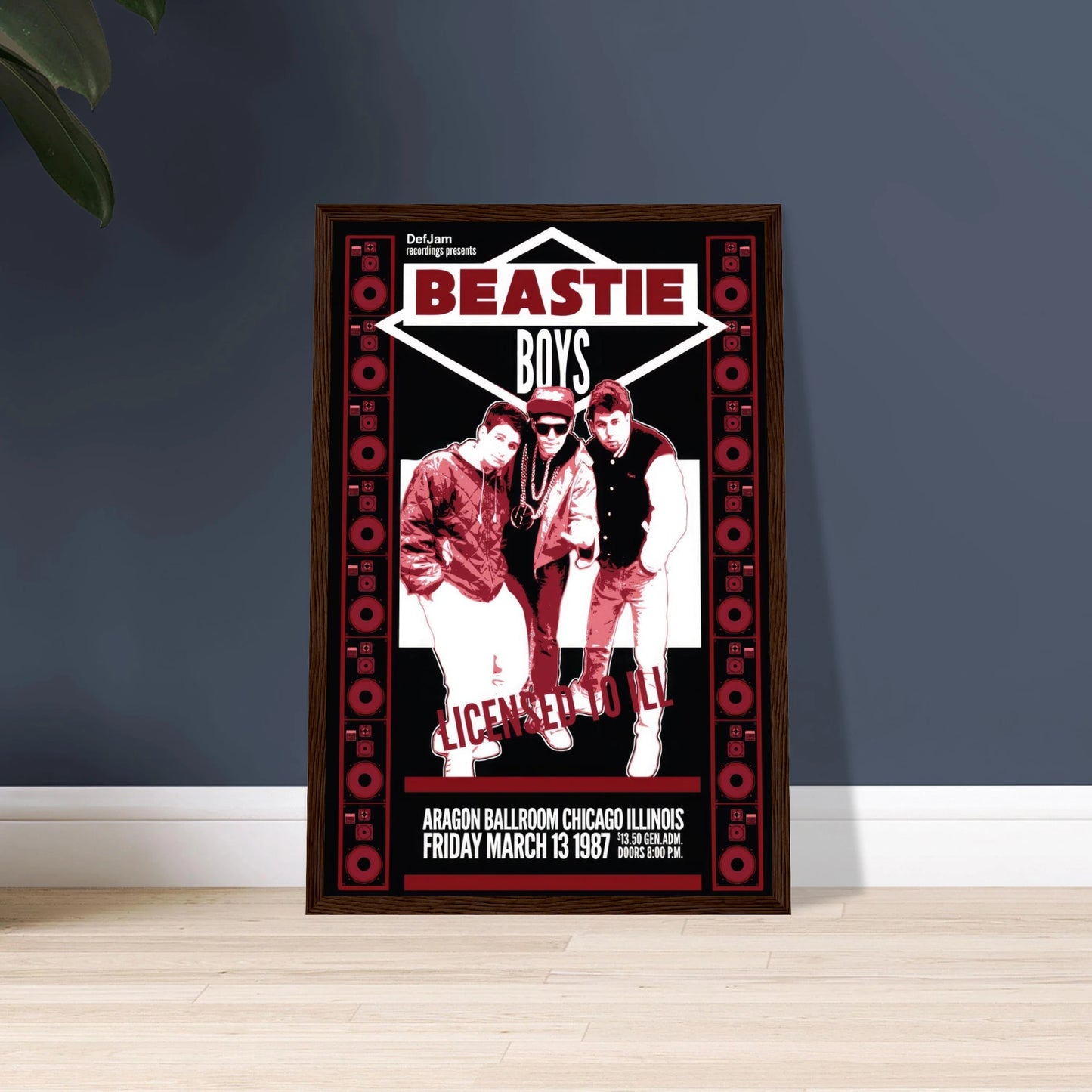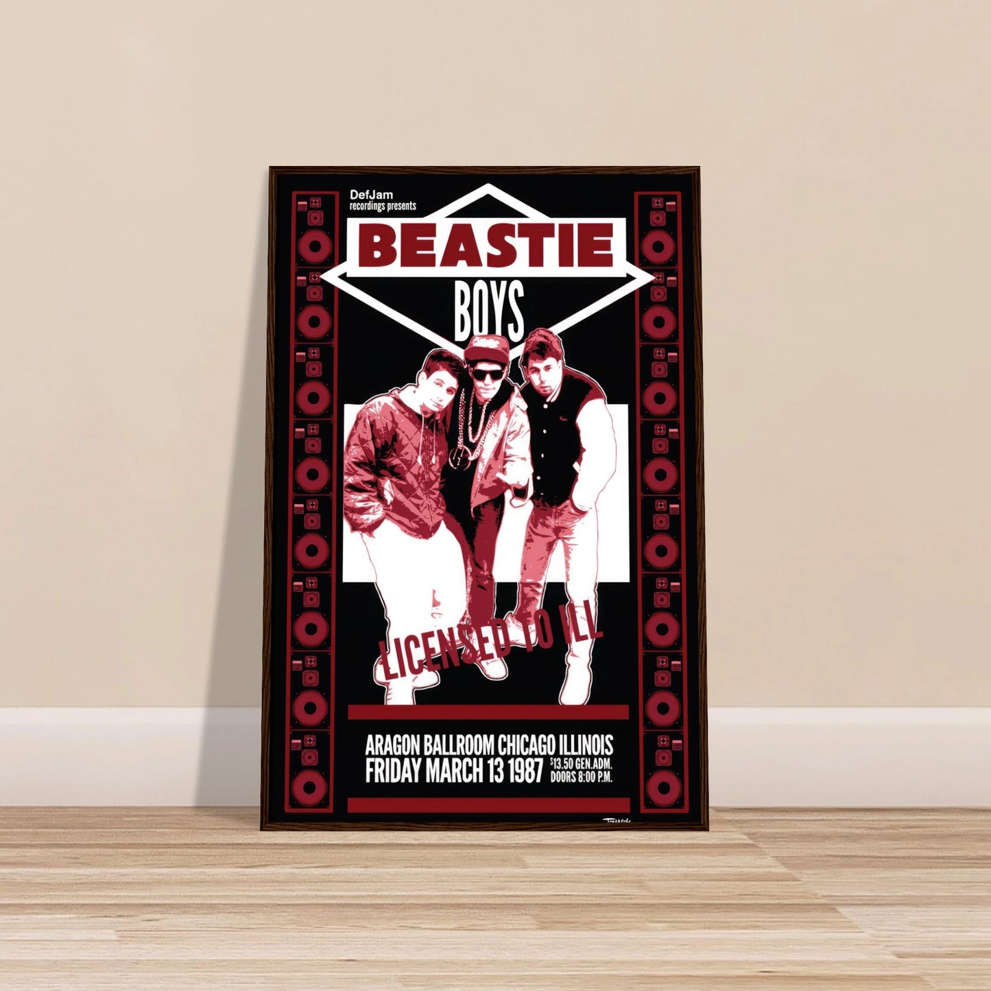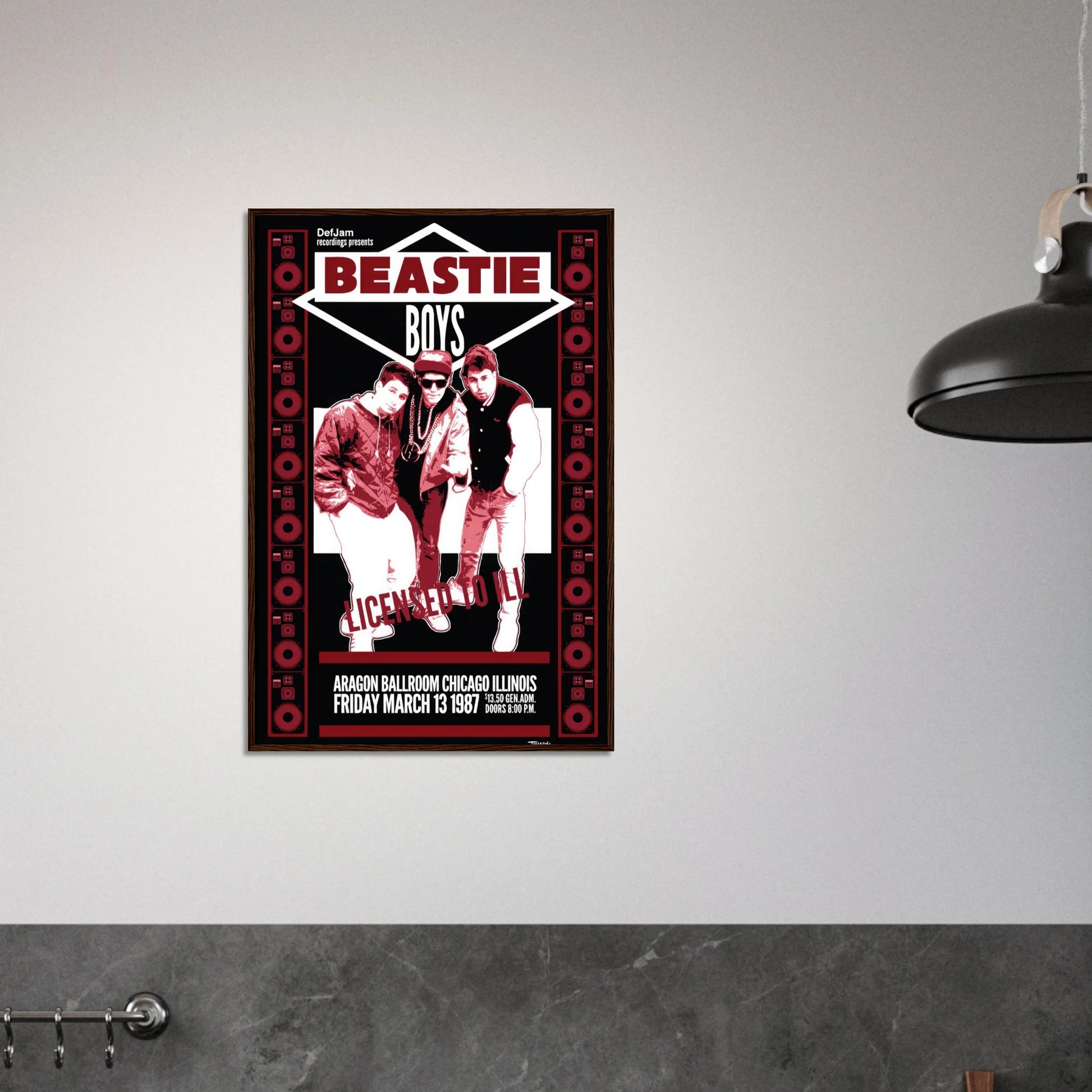 Get ready to fight for your right to party with this incredible retro-style poster for the Beastie Boys' groundbreaking "Licensed to Ill" tour. Commemorating their show at the legendary Aragon Ballroom in Chicago on Friday, March 13, 1987, this poster's striking red, white, and black design perfectly captures the raw, bratty energy of their debut. Featuring a classic shot of Mike D, MCA, and Ad-Rock framed by speaker stacks, it's a must-have for any fan of old-school hip-hop and the moment rap-rock exploded into the mainstream.