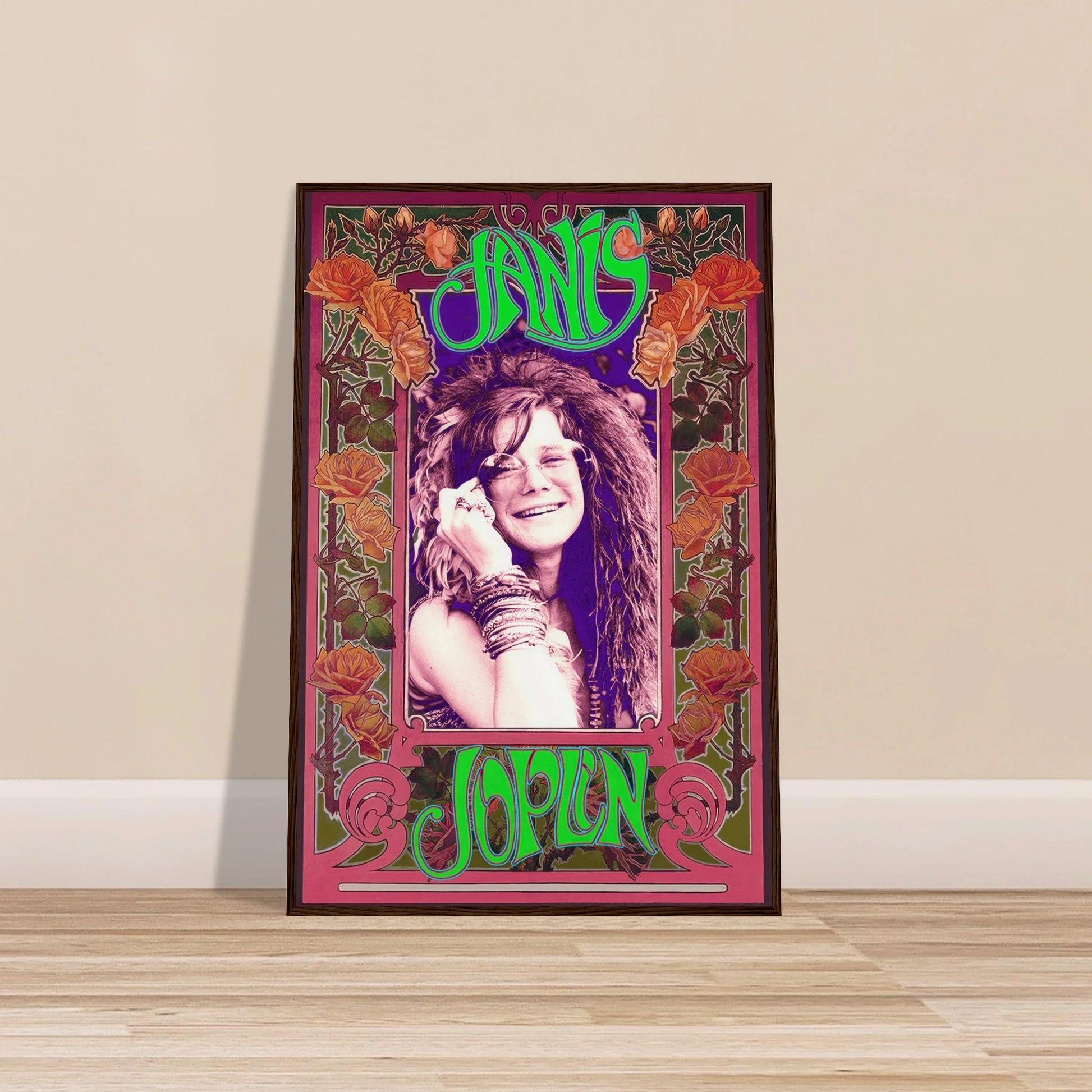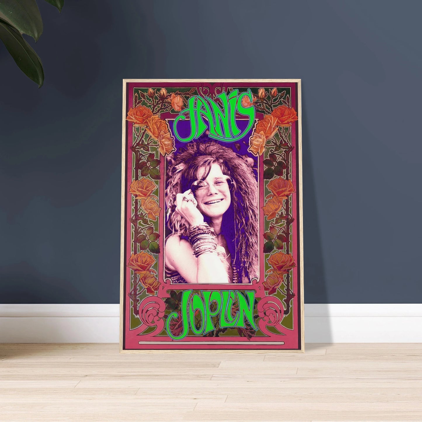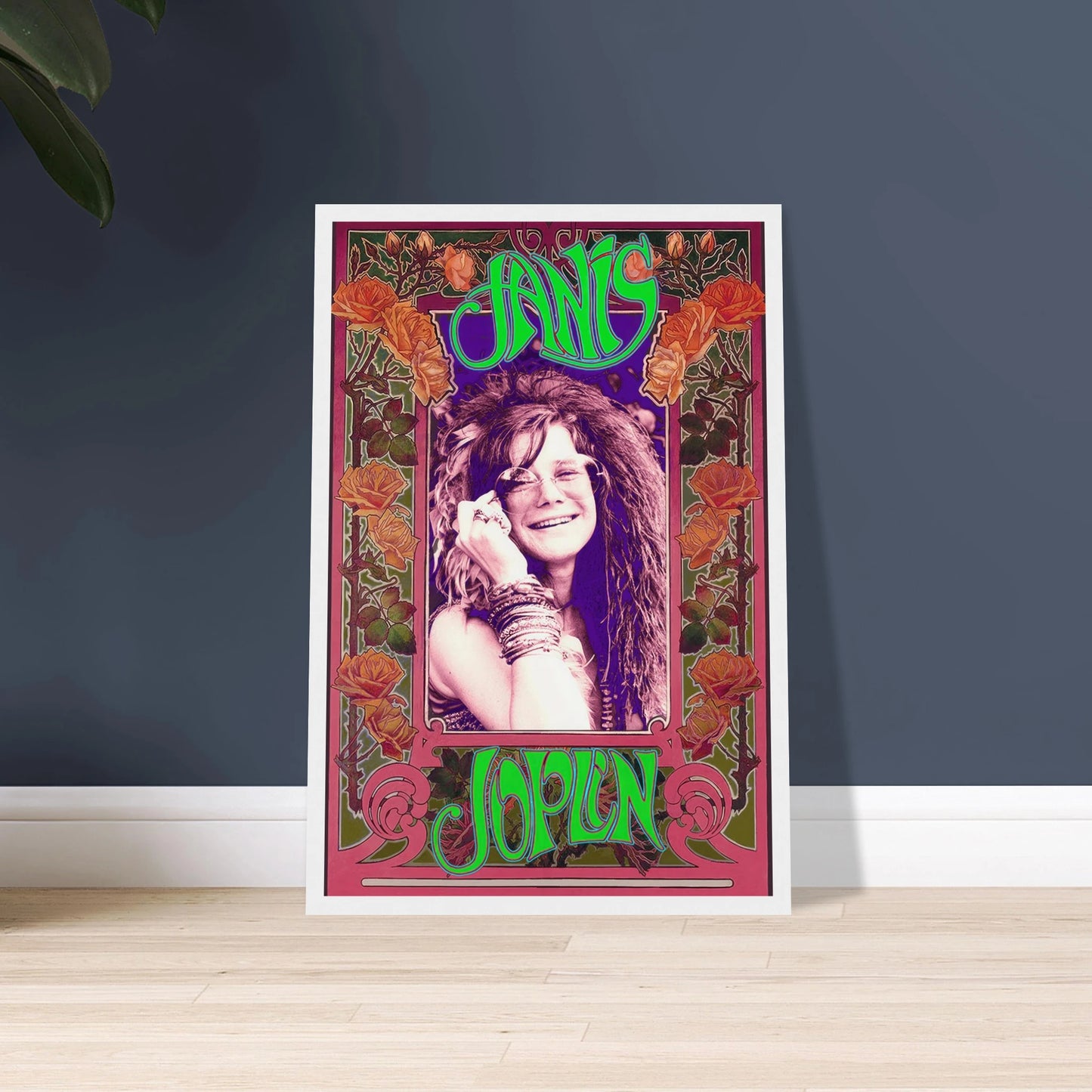 Capture the free-spirited essence of a rock and roll icon with this psychedelic tribute poster to Janis Joplin. Featuring a joyous portrait of the legendary singer, this piece is steeped in the Art Nouveau-revival style that defined the late 1960s. Framed by a cascade of roses and rendered in vibrant, groovy colors, the artwork celebrates Joplin's powerful presence and the "flower power" era she helped shape. It's a timeless piece for any fan of classic rock, 60s counterculture, and the unforgettable "Queen of Psychedelic Soul."