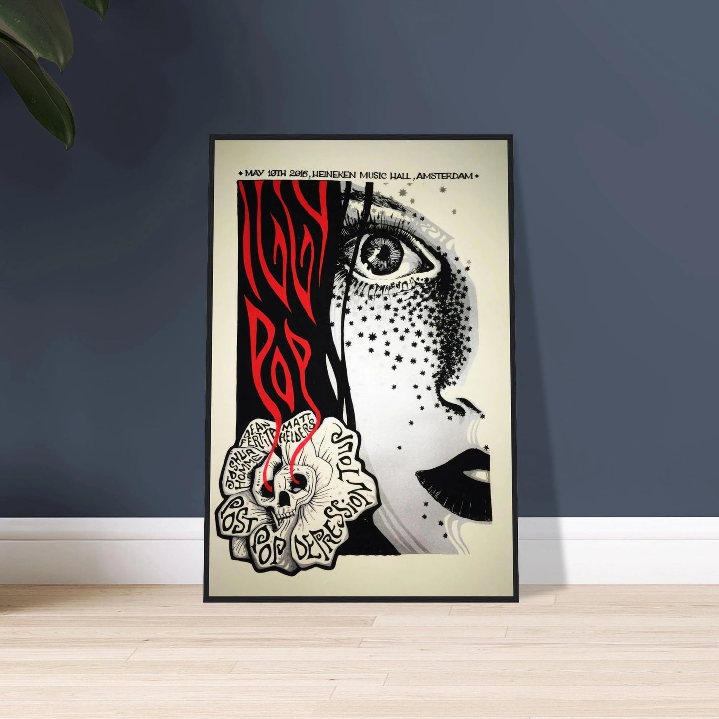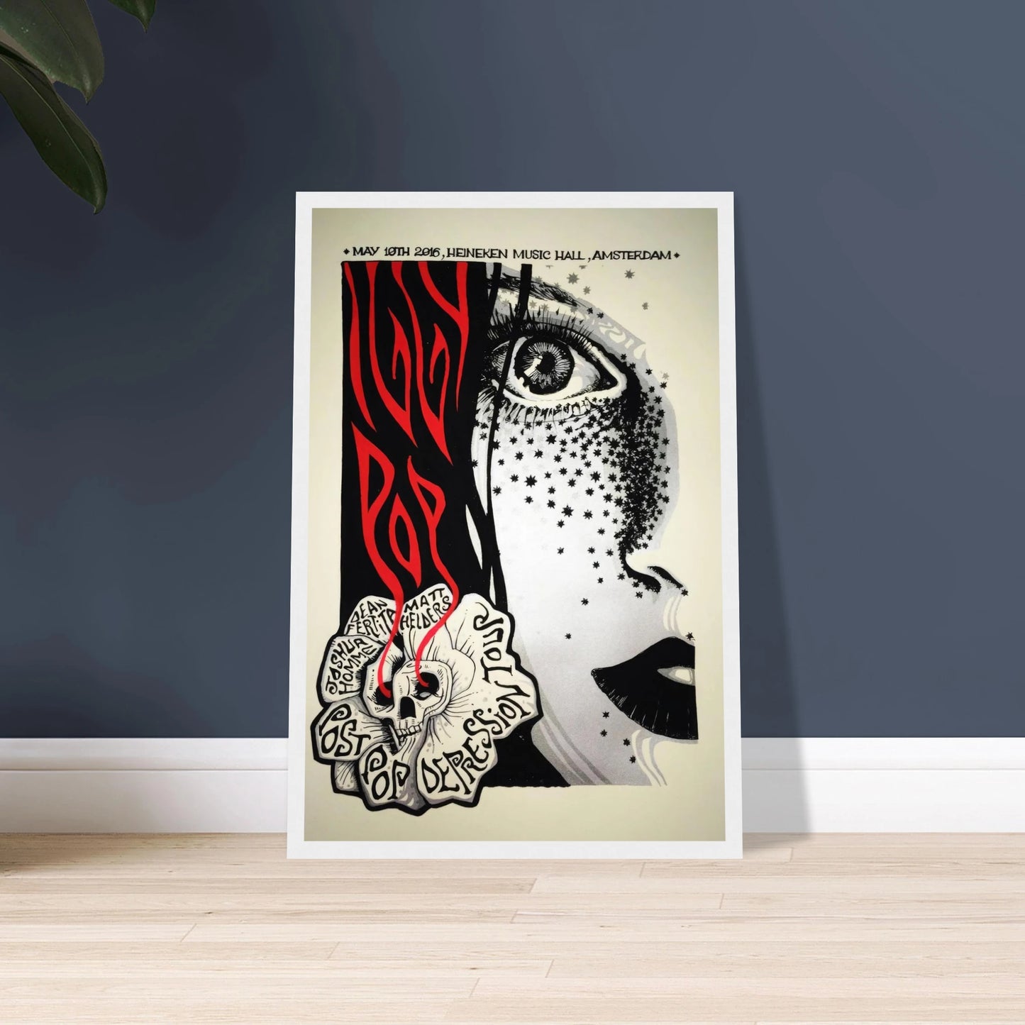 Capture a pivotal moment in Iggy Pop's legendary career with this stunning concert poster from his "Post Pop Depression" tour stop in Amsterdam. The show, held on May 10, 2016, at the Heineken Music Hall, featured a powerhouse backing band including Joshua Homme (Queens of the Stone Age) and Matt Helders (Arctic Monkeys). The poster's surreal, high-contrast artwork is a masterpiece of modern gig art, making it a must-have for any fan of the Godfather of Punk and his collaborators.