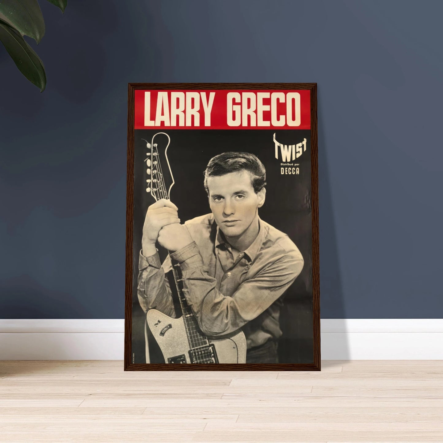 Step back to the heyday of the Twist craze with this rare and stylish promotional poster for French rocker Larry Greco. This early 1960s poster, distributed by Decca Records, features a classic black-and-white photograph of Greco with his electric guitar, embodying the cool confidence of the era's rock and roll stars. A fantastic piece of European music history for any collector of vintage music art or fan of the "yé-yé" movement.