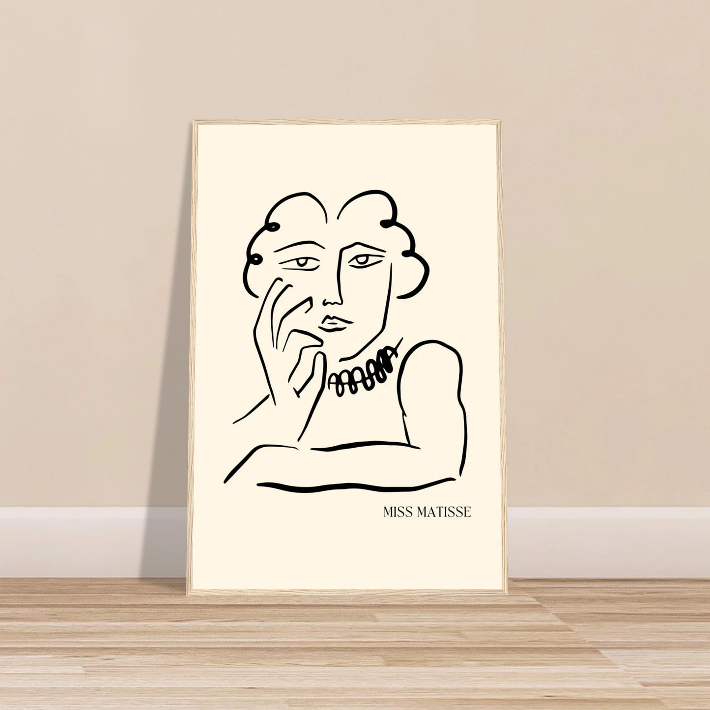 This is a contemporary minimalist art print titled "Miss Matisse," created as a direct homage to the iconic line drawings of the 20th-century French master, Henri Matisse. The artwork features a portrait of a woman in a thoughtful pose, rendered with a single, fluid black line against a warm, off-white background. The piece beautifully captures the essence of Matisse's style—an extreme simplification of form that conveys a maximum of grace and emotion with an absolute economy of means.