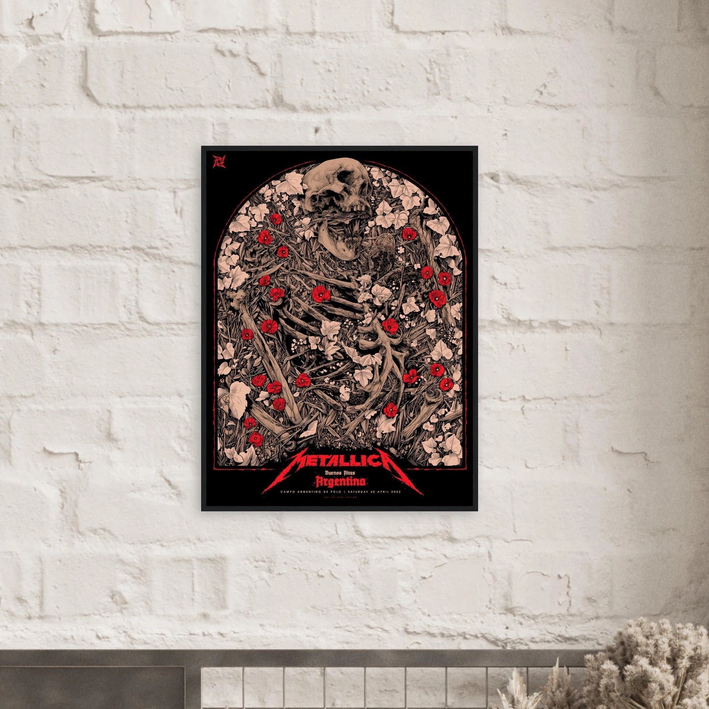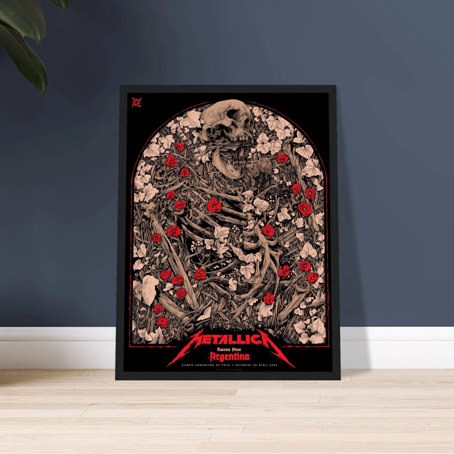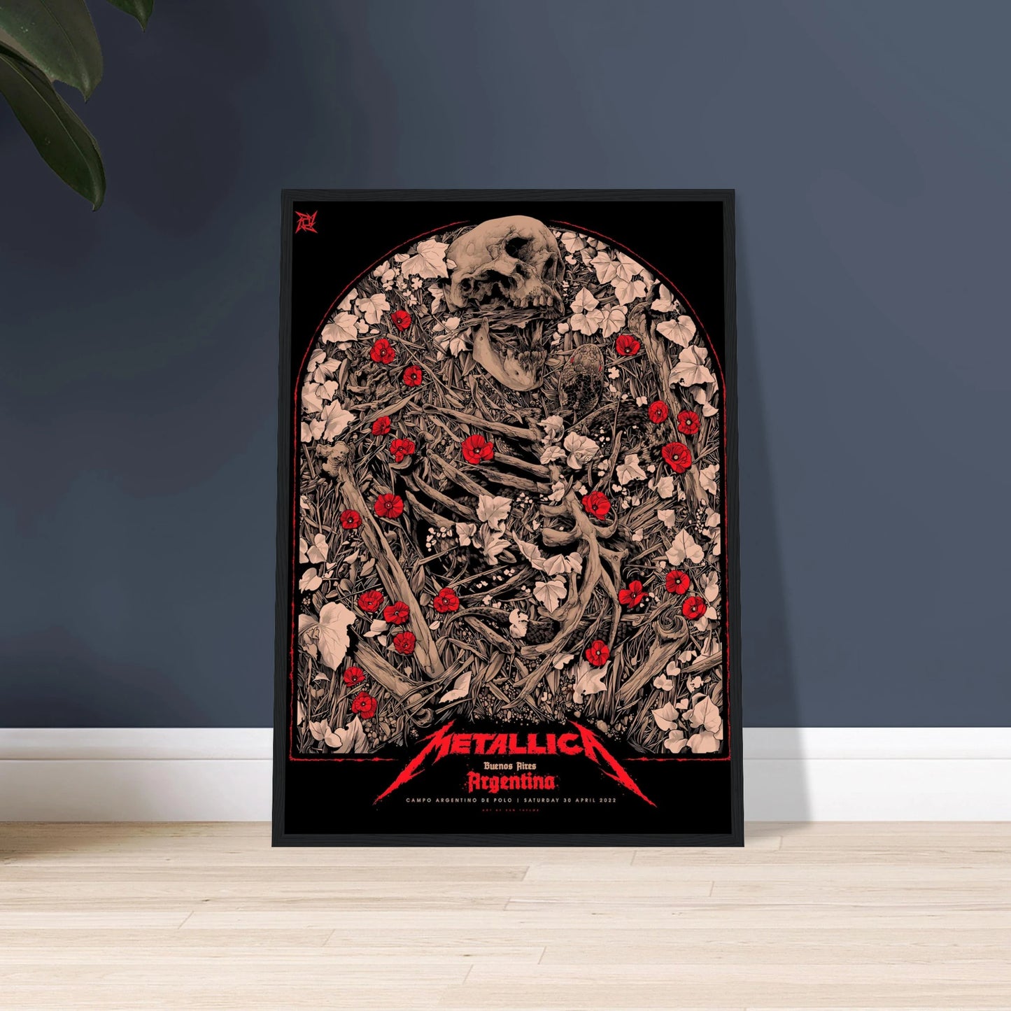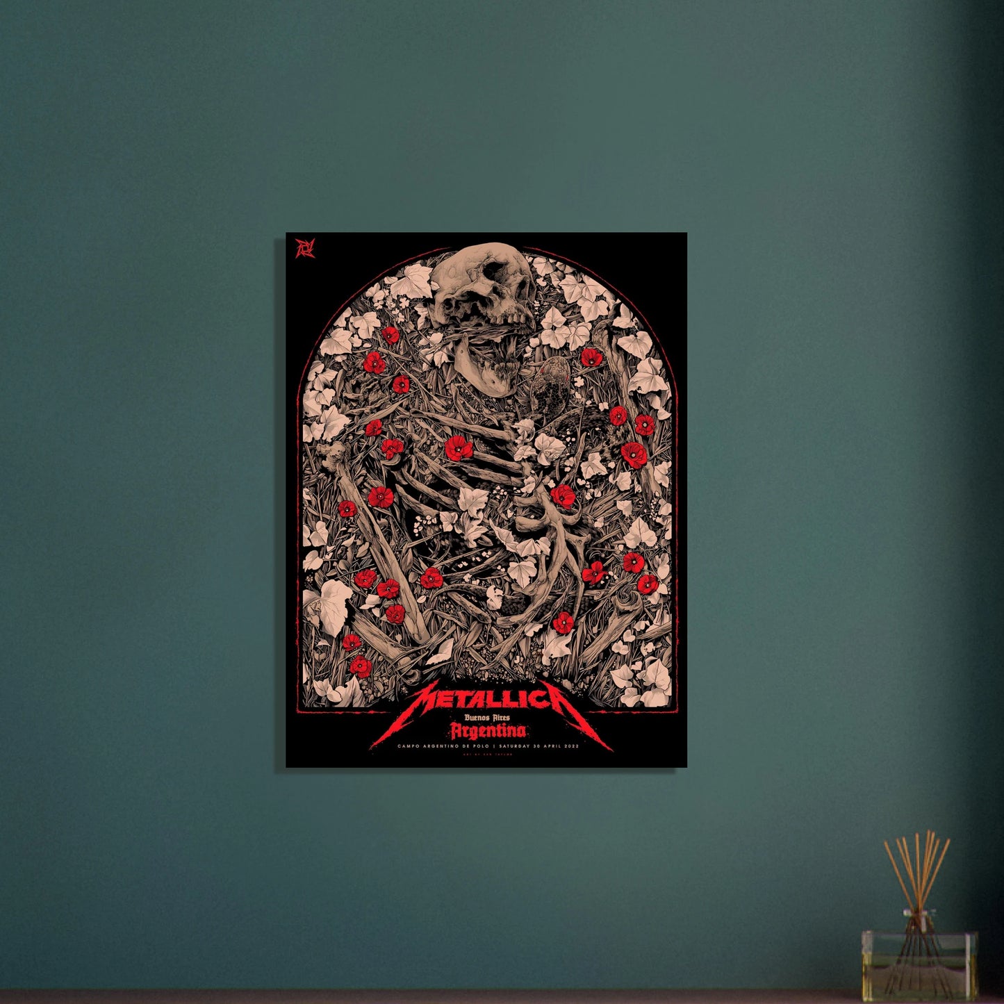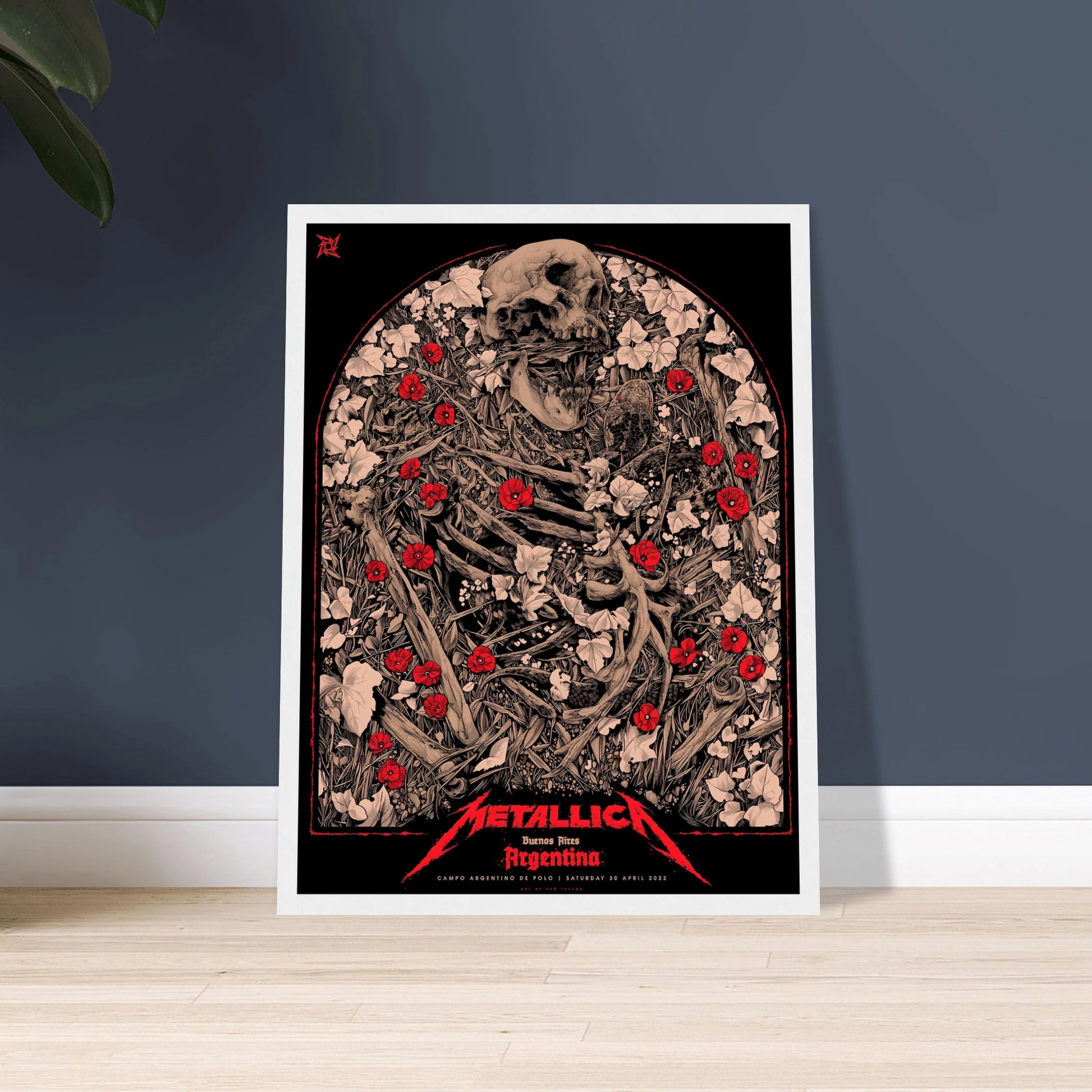 Commemorate Metallica's monumental show in Buenos Aires with this breathtaking poster from their April 30, 2022 concert. Designed by acclaimed artist Ken Taylor, the artwork features a hauntingly beautiful image of a skeleton reclaimed by nature, entwined with vines and adorned with vibrant red poppies. The intricate detail and powerful gothic imagery make this a stunning piece of art that transcends typical concert memorabilia. A must-have for any Metallica collector or connoisseur of modern rock poster art.