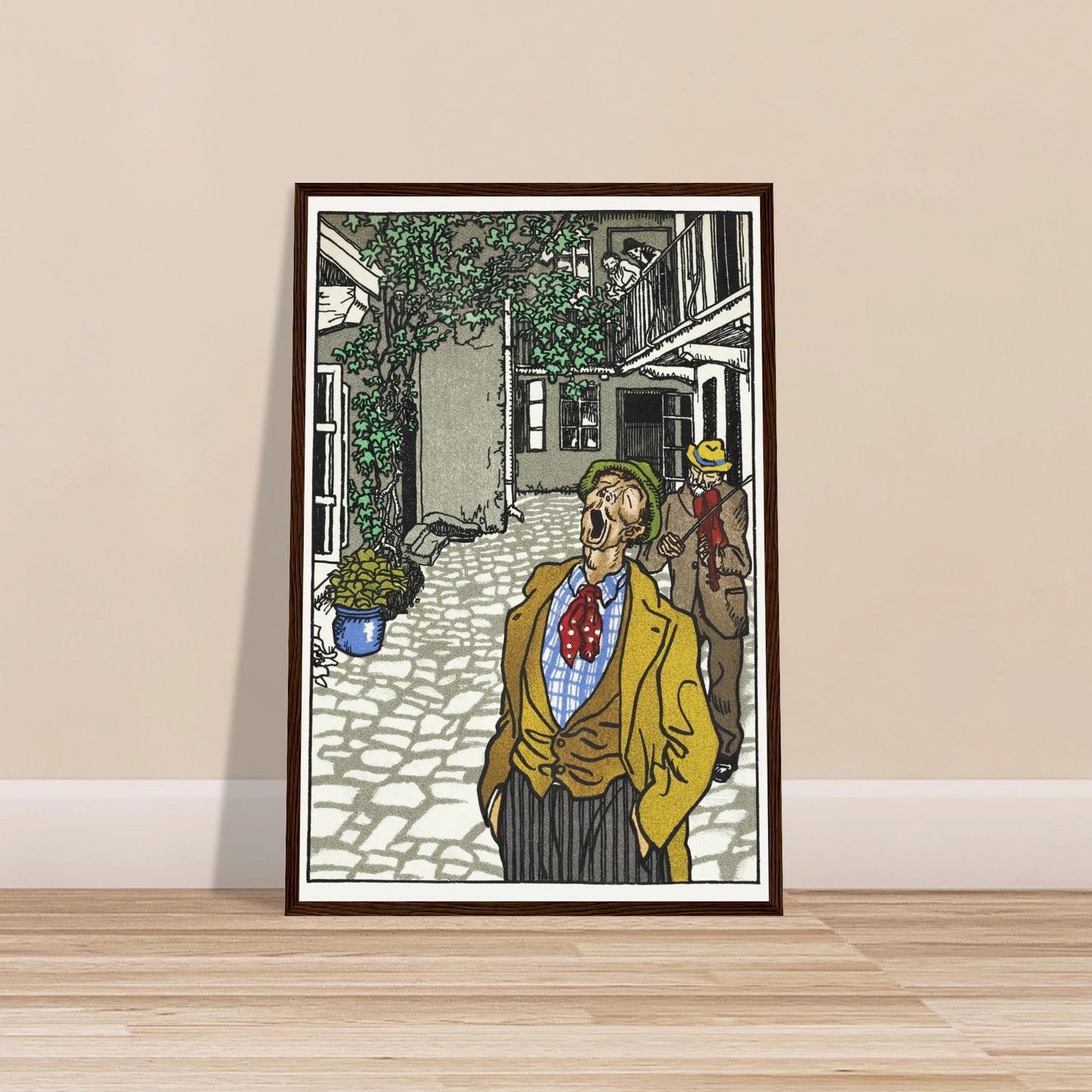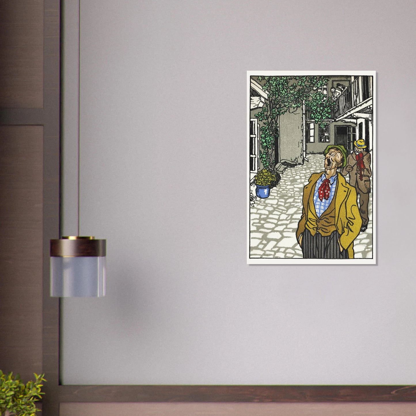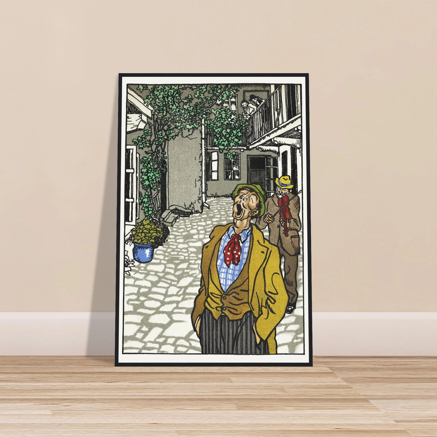 This is a witty and expressive 1911 print titled Naturally Gifted Singer by the Austrian artist Moriz Jung, a key member of the celebrated Wiener Werkstätte (Vienna Workshop). The artwork captures a lively scene in a classic Viennese courtyard, where a street singer is giving a passionate, open-mouthed performance. Jung's signature style, with its bold lines, expressive caricature, and patterned details, vividly captures a humorous and authentic slice of early 20th-century urban life, observed with a keen and compassionate eye.