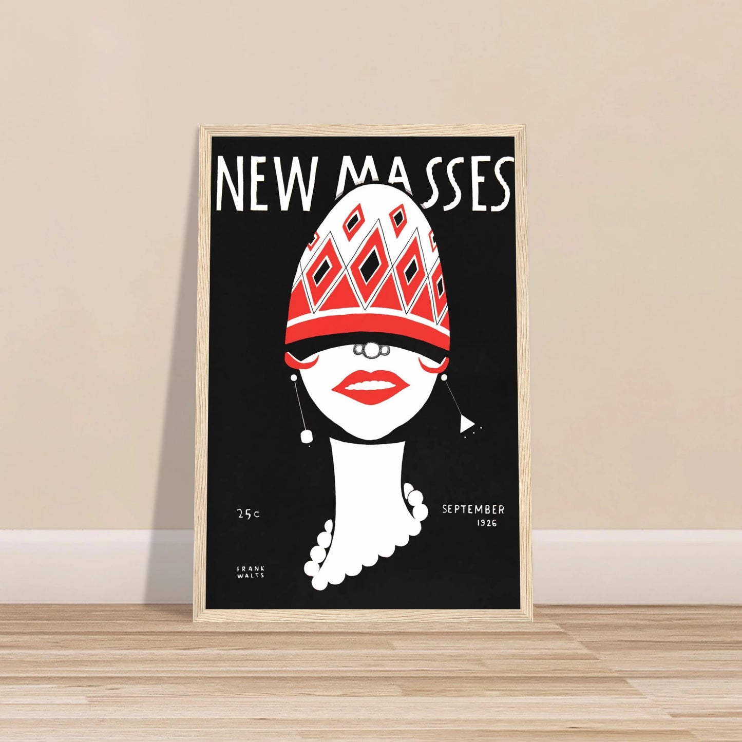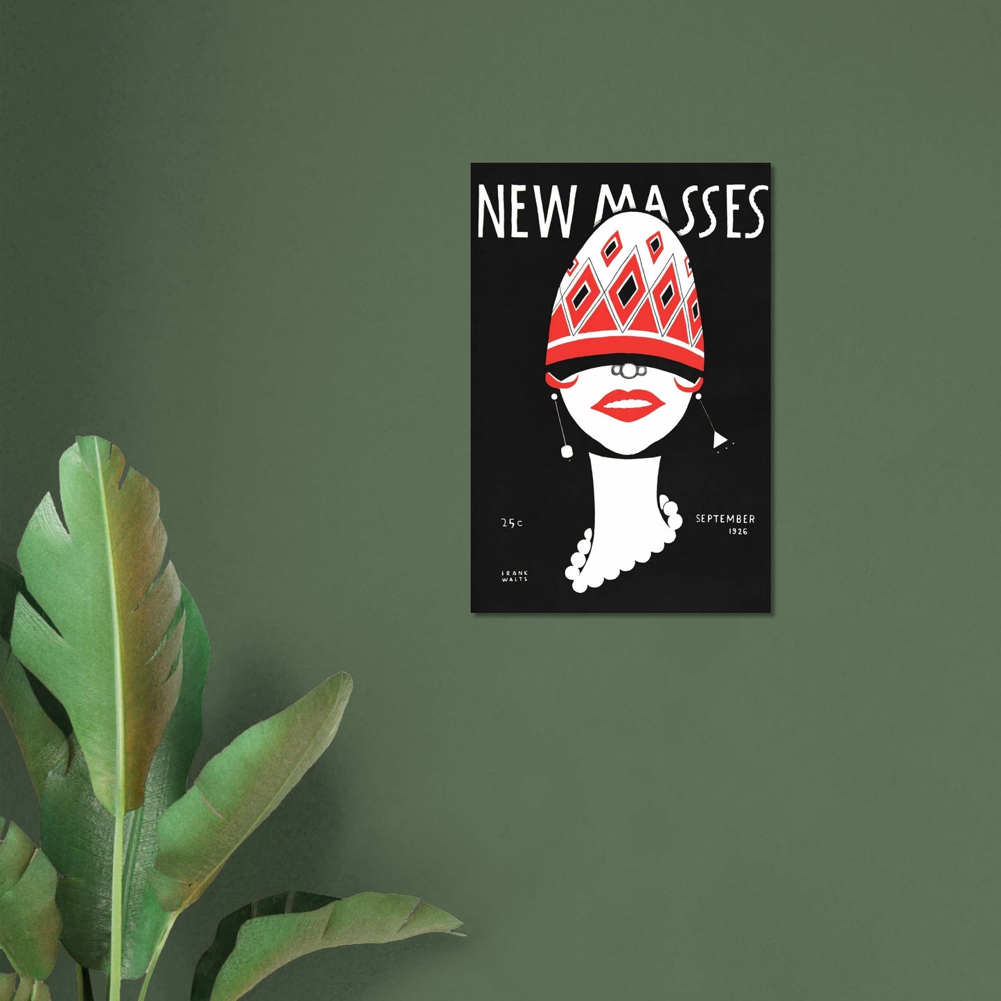 This is the bold and stylish cover of the September 1926 issue of New Masses magazine, designed by the artist Frank Walts. The artwork is a quintessential example of the Art Deco style of the Roaring Twenties, featuring a graphic portrait of a modern "flapper." Her face is rendered in stark white against a black background, with her eyes mysteriously obscured by a fashionable cloche hat decorated with a vibrant red and white geometric pattern. The image masterfully captures the sophisticated, avant-garde, and glamorous spirit of the Jazz Age.