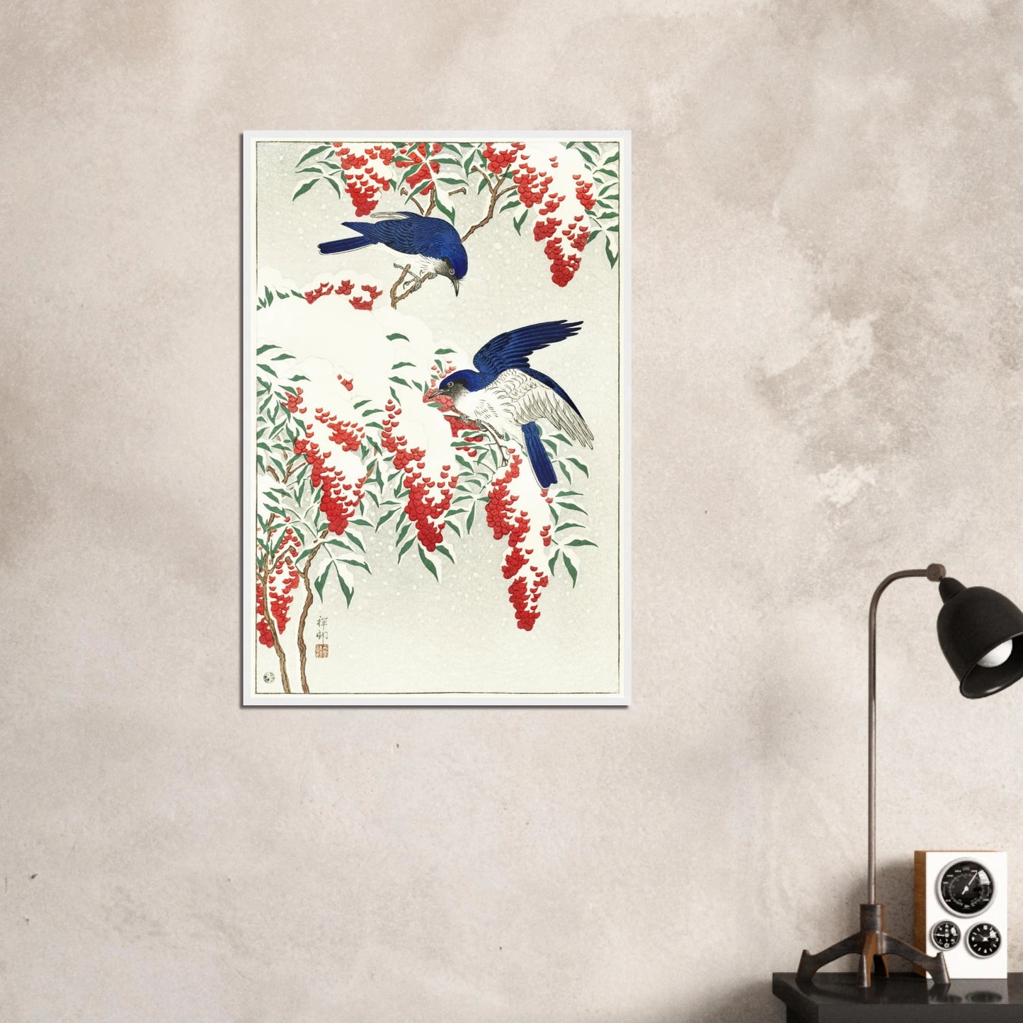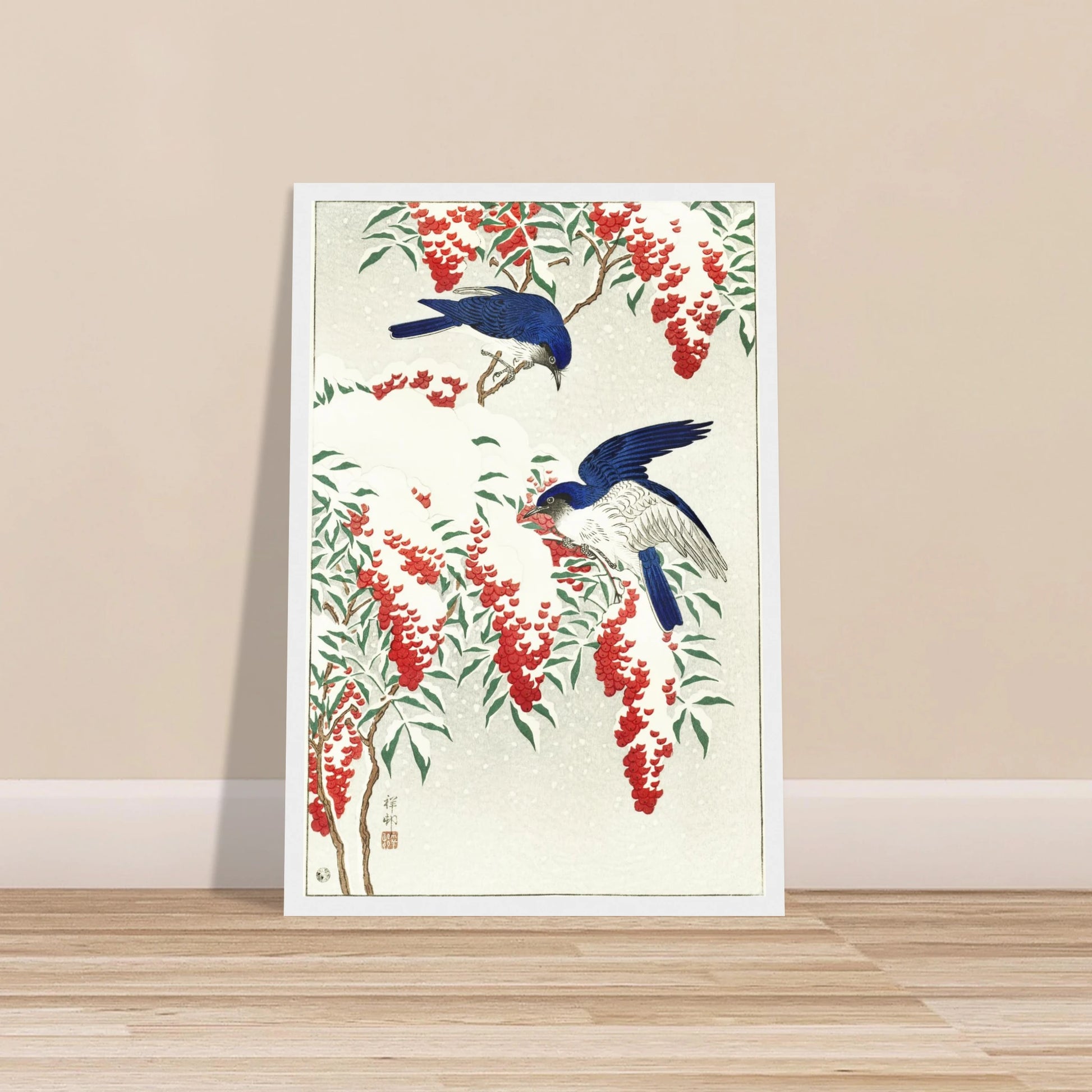 This is a Japanese woodblock print by the artist Ohara Koson (1877–1945). The artwork, a classic example of the kacho-e (bird-and-flower pictures) genre, depicts a tranquil winter scene. Two Blue-and-white Flycatchers are perched on the branches of a nandina bush, which is laden with snow. The vibrant red berries and the birds' deep blue feathers create a stunning visual contrast against the soft white of the snow. One bird is actively feeding on a berry, adding a moment of life and delicacy to the serene atmosphere.