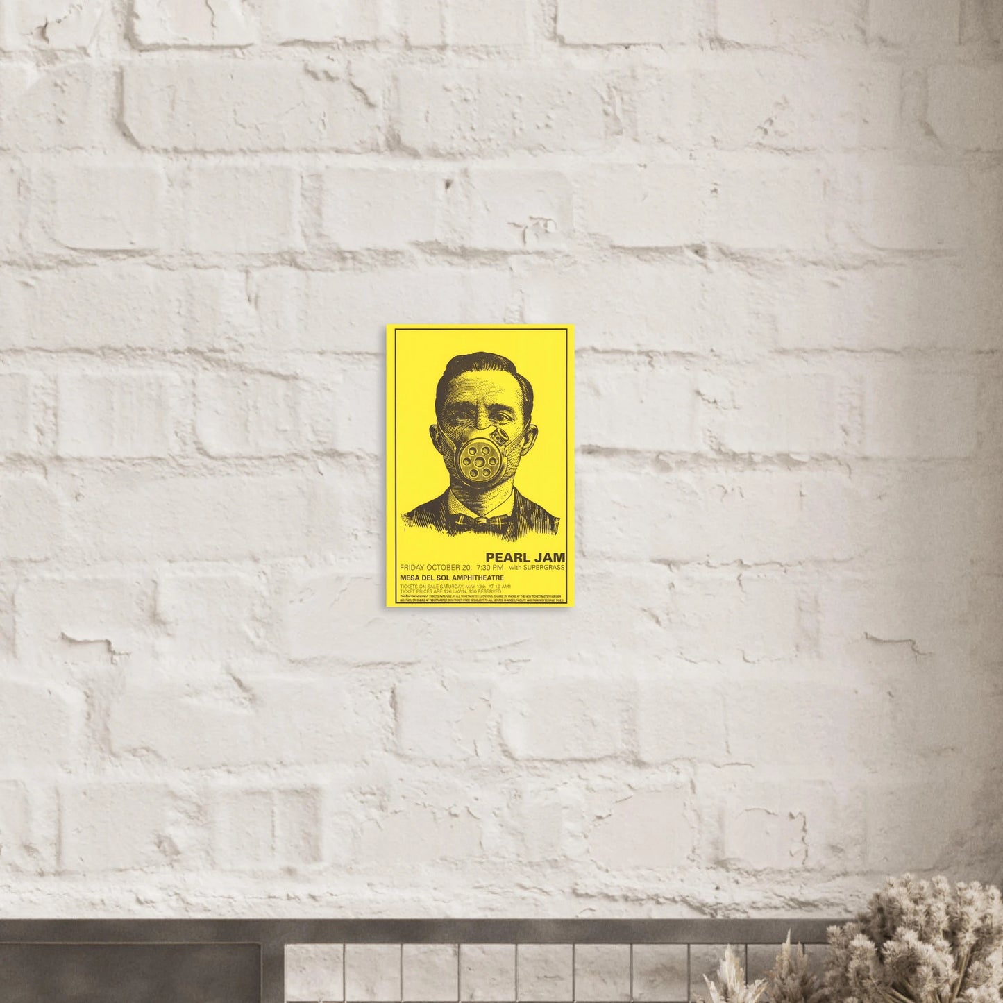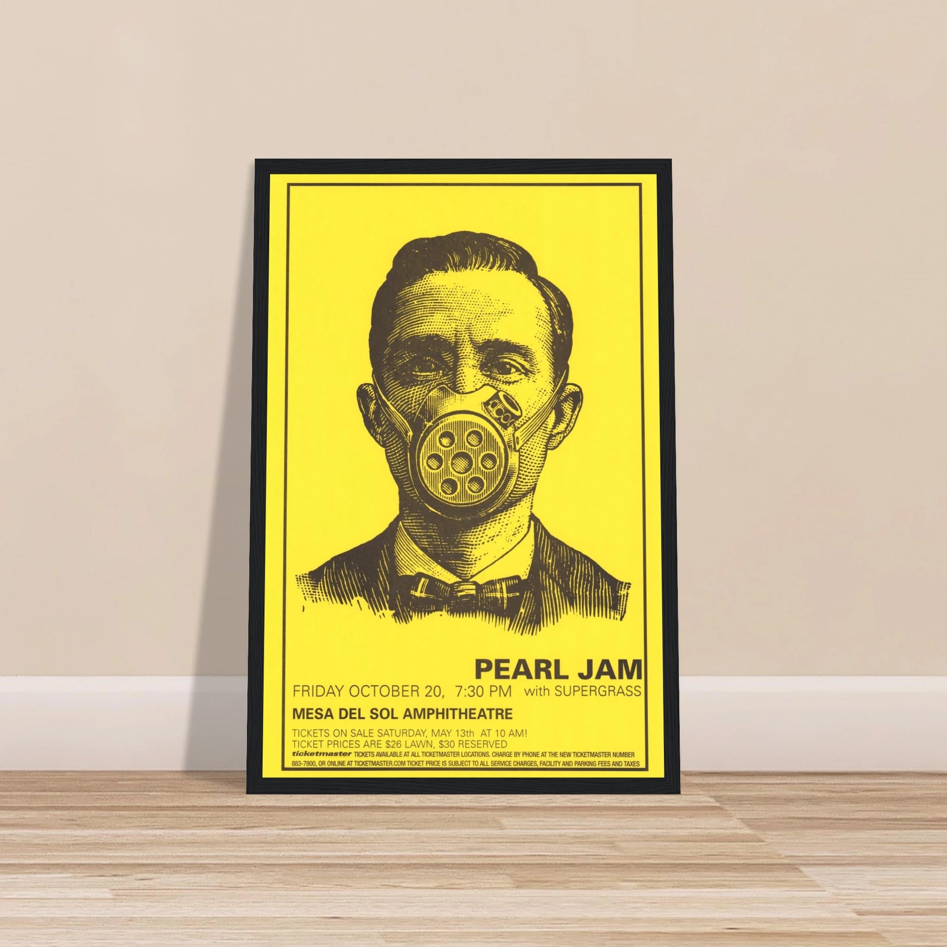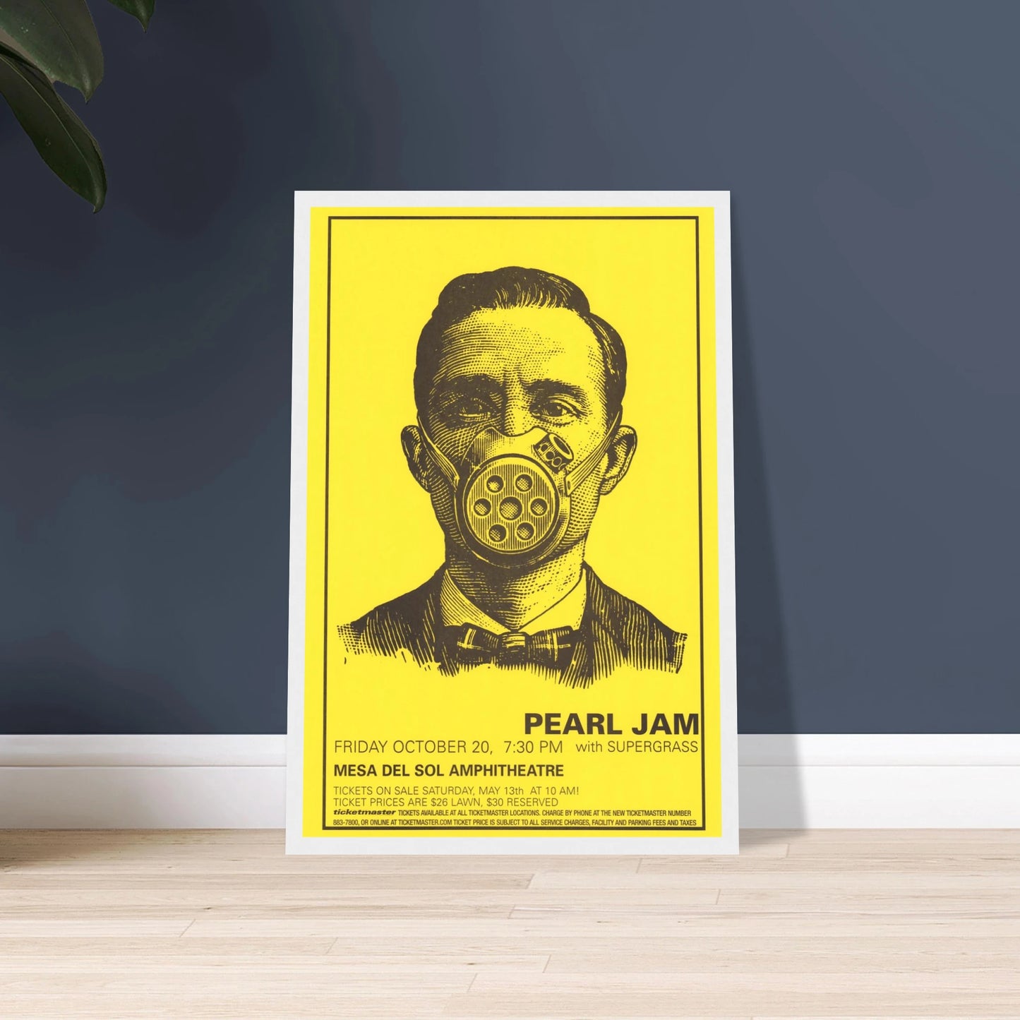 Capture a piece of alternative rock history with this iconic "gas mask" poster from Pearl Jam's 2000 concert in Albuquerque, New Mexico. The striking, minimalist design commemorates the band's performance at the Mesa Del Sol Amphitheatre on October 20, 2000, with Britpop stars Supergrass as support. This poster is a classic example of Pearl Jam's use of thought-provoking art and a must-have for any serious collector.