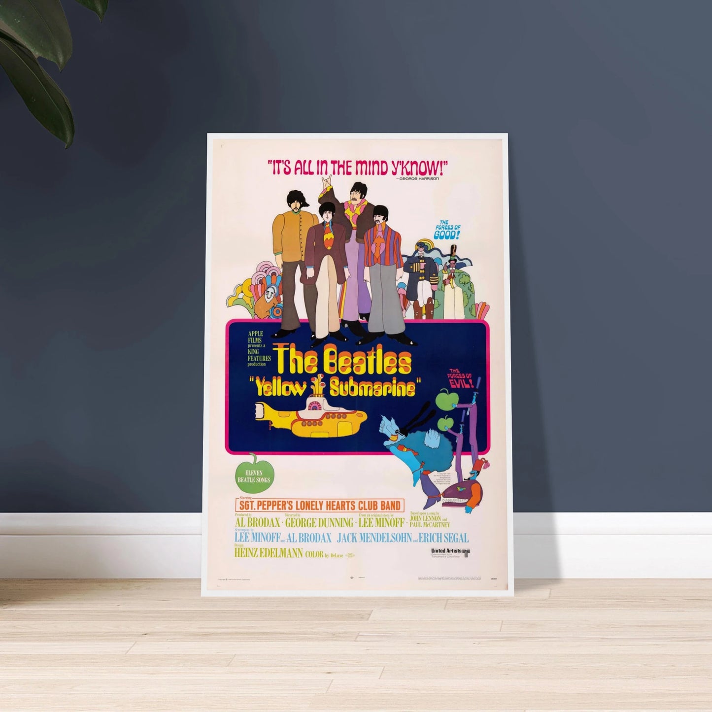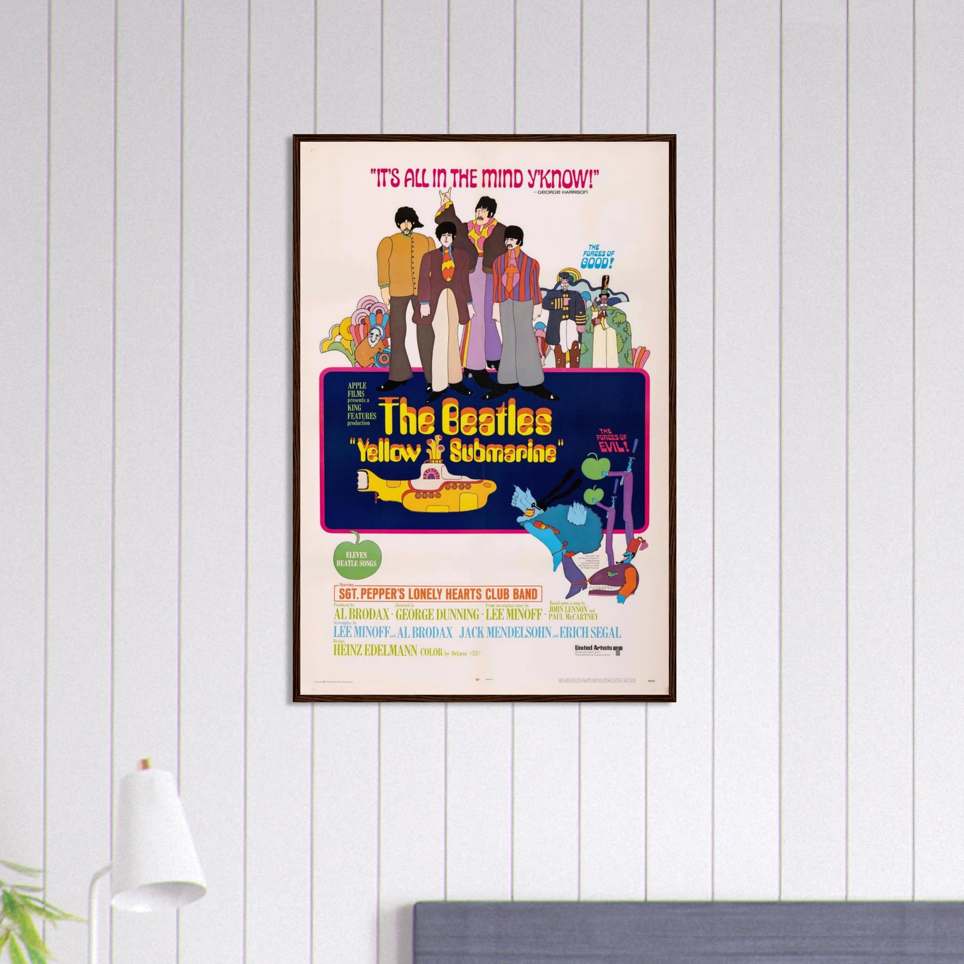 All aboard for a trip to Pepperland! This is a classic vintage movie poster for The Beatles' animated masterpiece, "Yellow Submarine." Featuring the groundbreaking and surreal artwork of Heinz Edelmann, this poster is a burst of psychedelic color and imagination. It showcases the animated Fab Four, the magical submarine, and the menacing Blue Meanies, all under a classic quote from George Harrison: "It's all in the mind y'know!". This is a quintessential piece of 1960s pop art and a must-have for any Beatles fan or collector of classic film memorabilia.