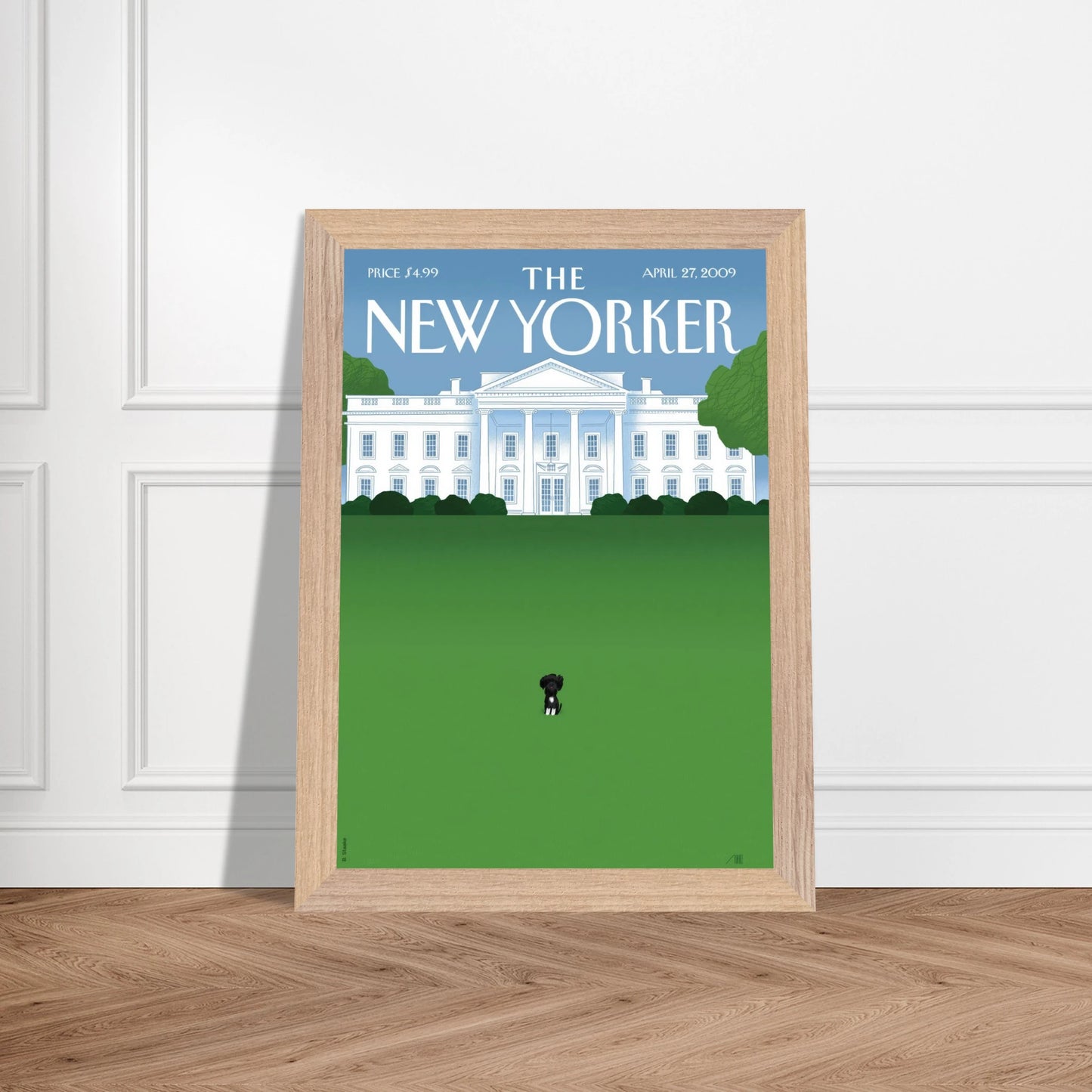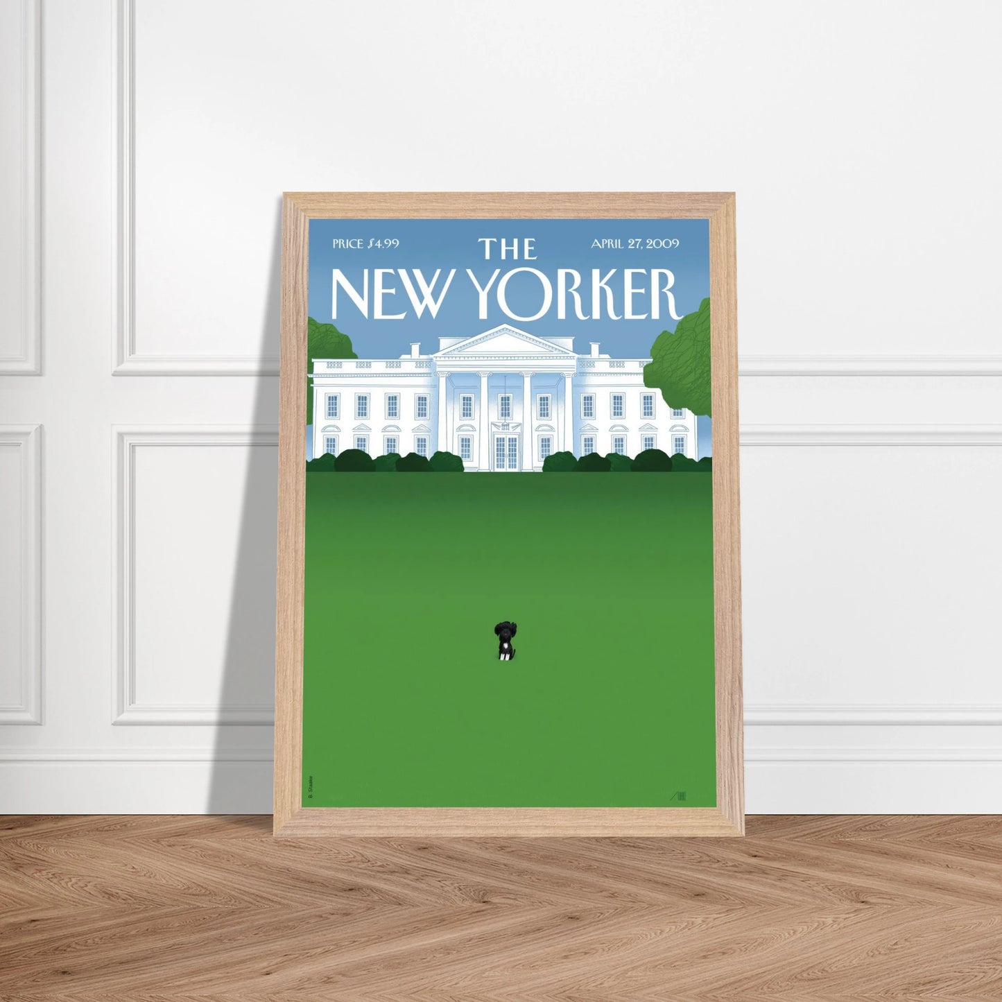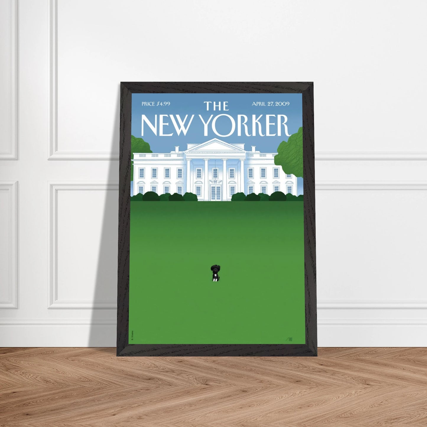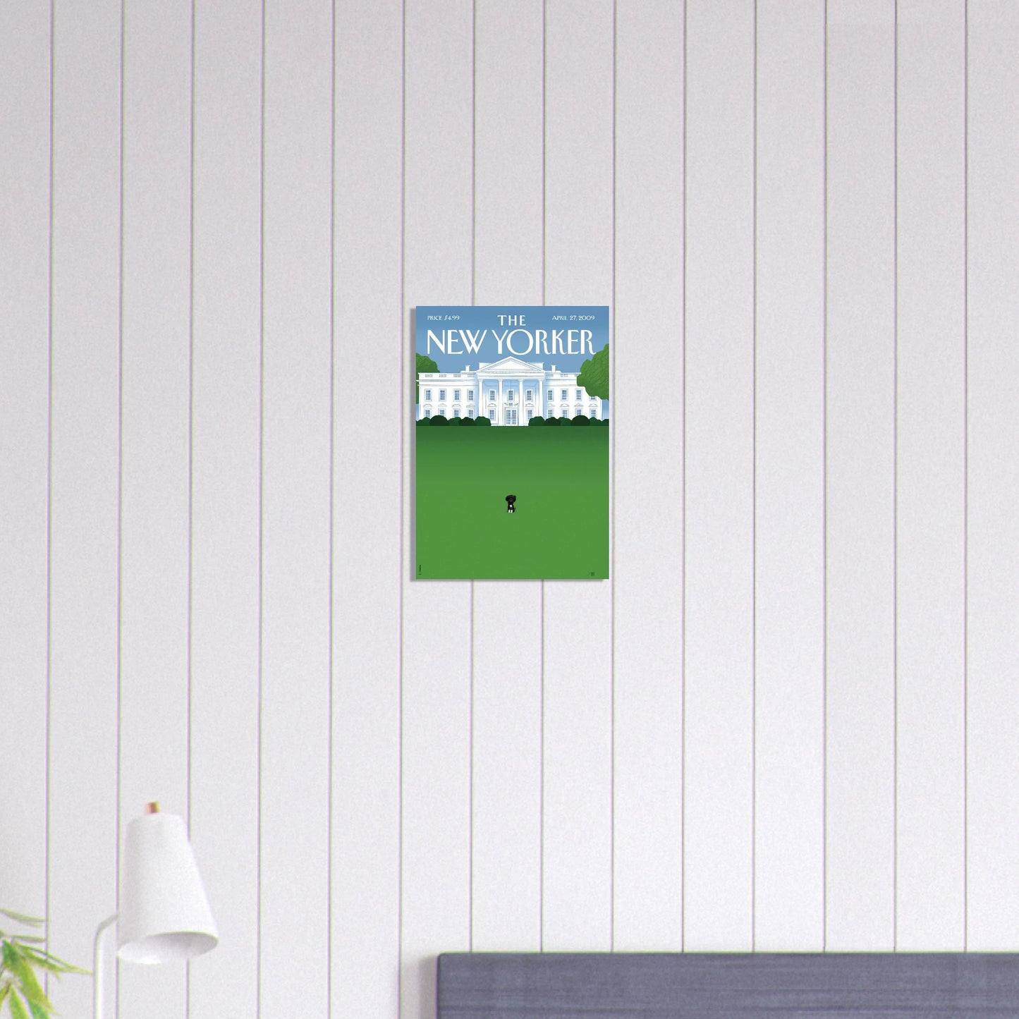 This cover for the April 27, 2009, issue of The New Yorker, titled "First Dog," was created by artist Barry Blitt. The illustration features a small puppy, Bo, the newly acquired Portuguese Water Dog of the Obama family, sitting by himself in the middle of the immense, perfectly manicured South Lawn of the White House, which looms in the background.