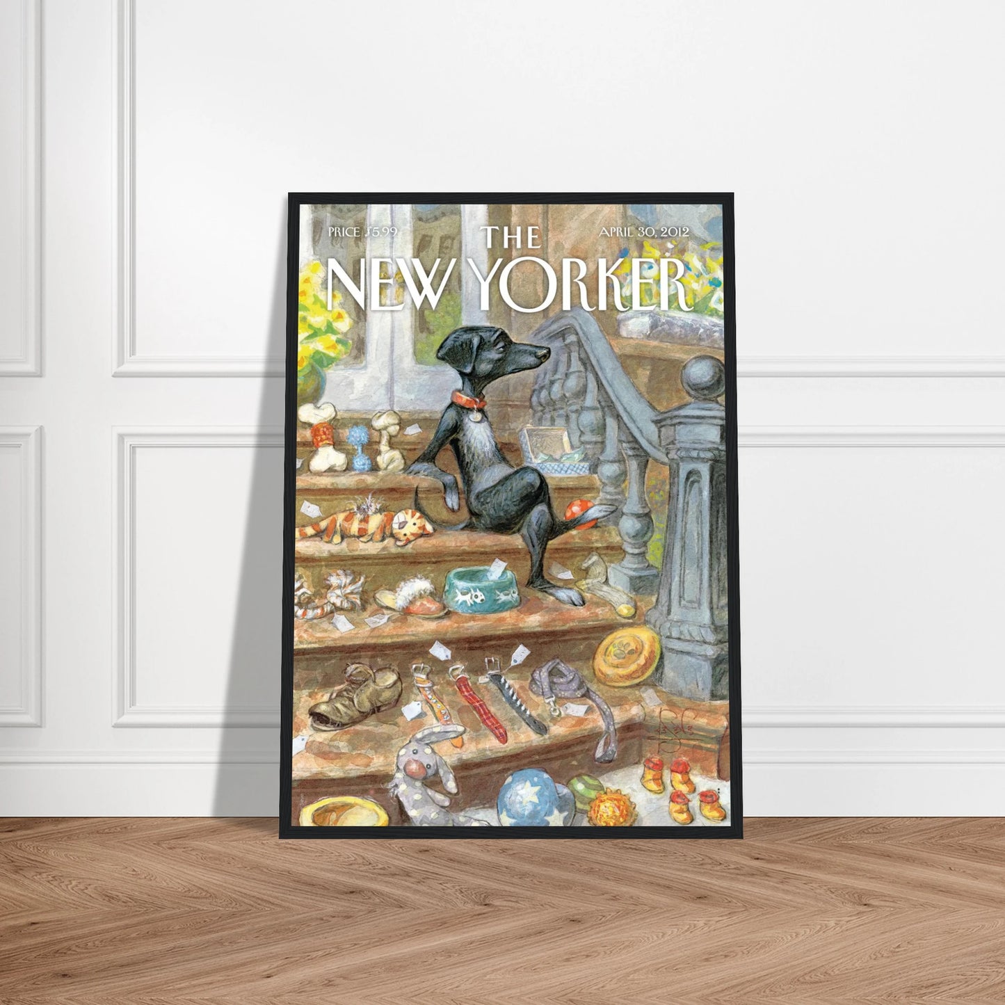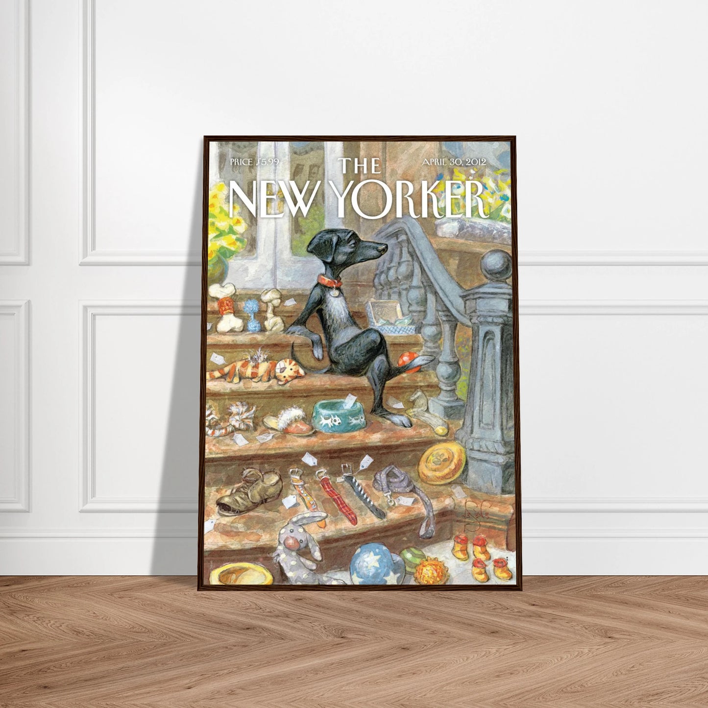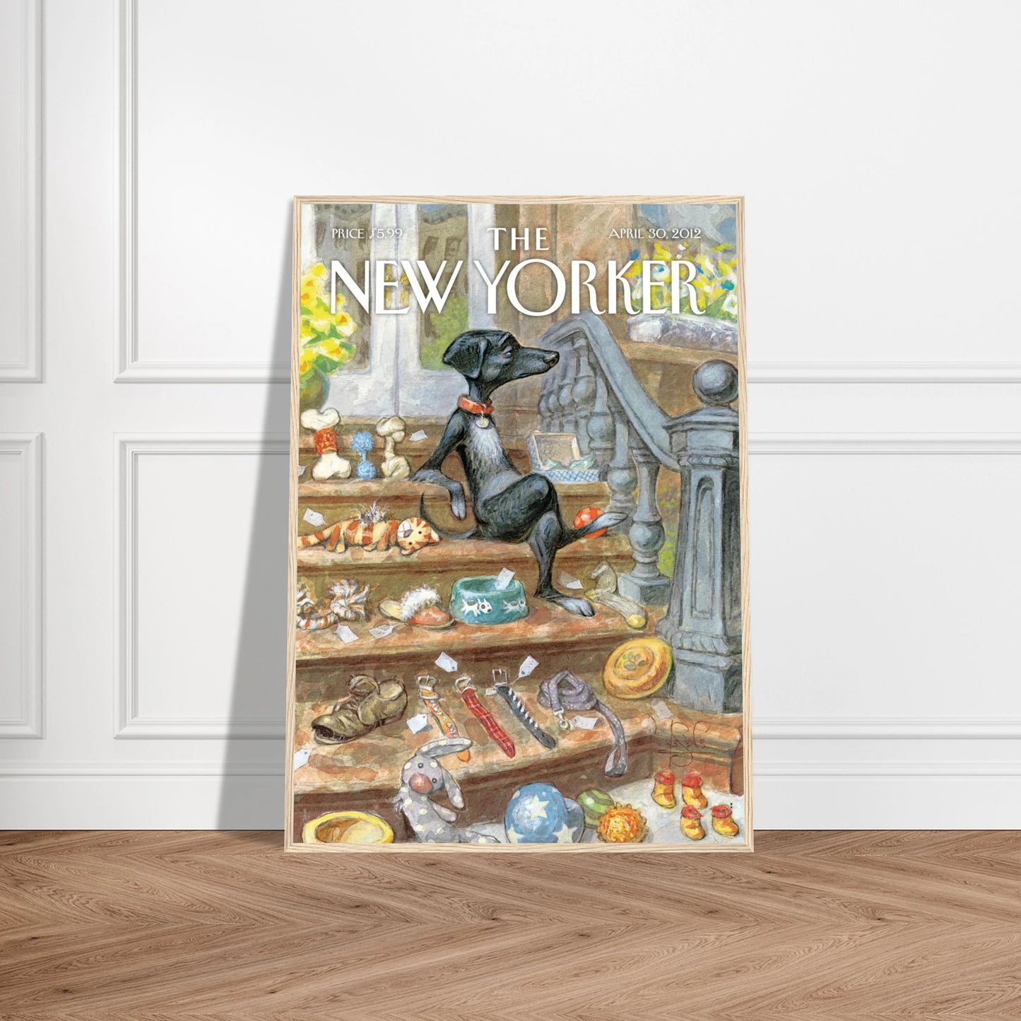 This delightful New Yorker cover from April 30, 2012, features a proud black dog lounging on the stoop, surrounded by a playful “yard sale” of dog accessories—chew toys, collars, slippers, bones, and bowls, all laid out with price tags. The pup sits regally, as if overseeing a royal boutique of canine treasures. It’s whimsical, sweet, and full of details dog lovers will adore.