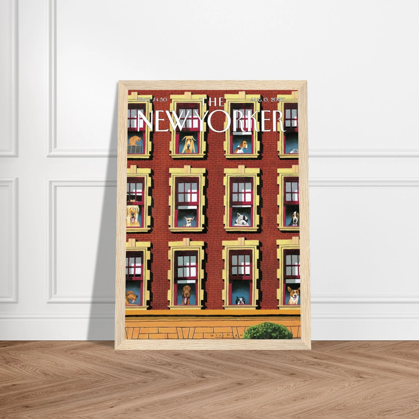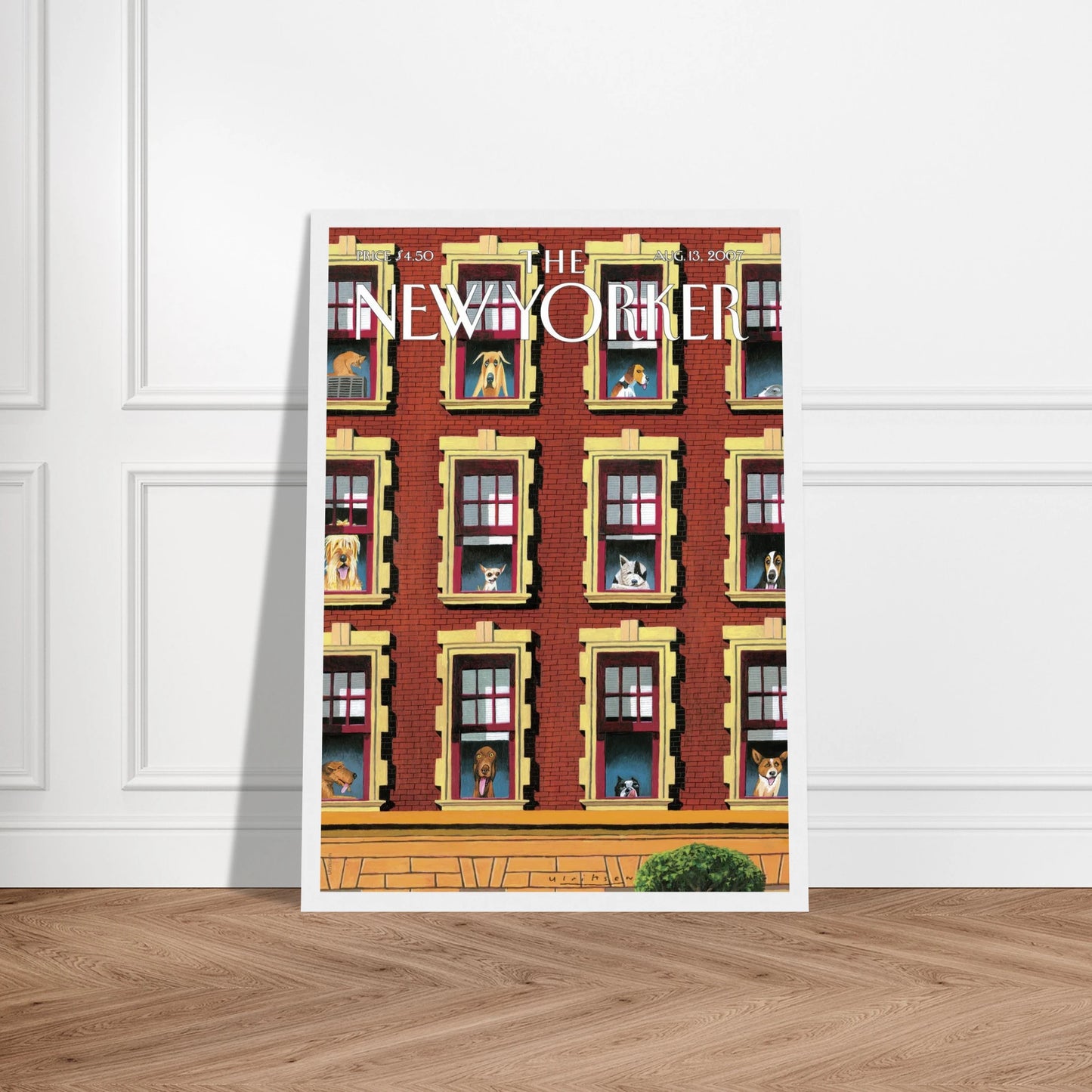 This New Yorker cover from August 13, 2007, is a treat for dog lovers and city dwellers alike. It shows a classic brick apartment building with dozens of curious canine faces peeking out from the windows. Each dog, from a shaggy mutt to a dignified basset hound, seems to be keeping watch over the street below—some patient, some playful, all with personality.
