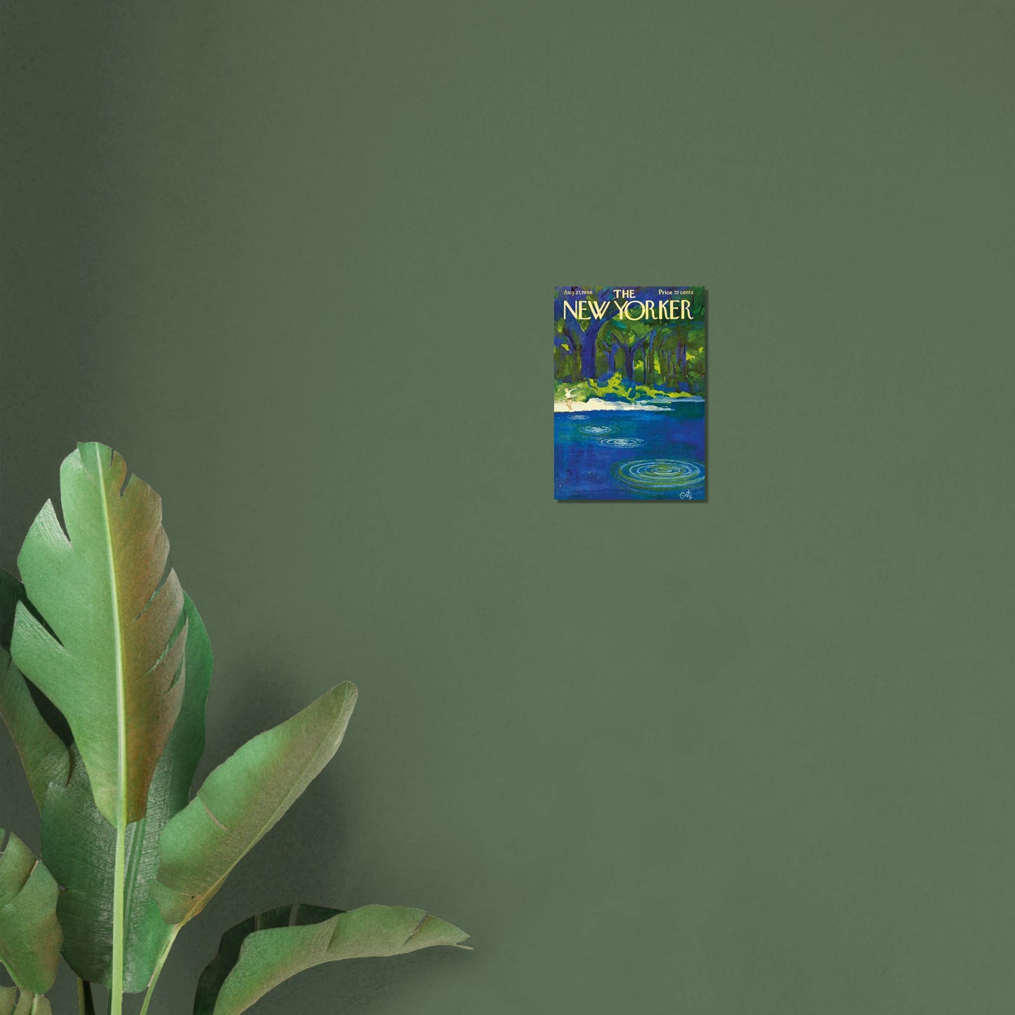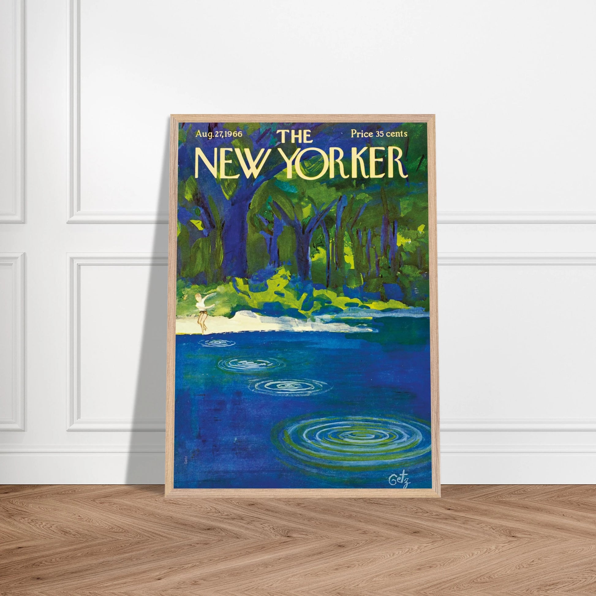 This cover of The New Yorker from August 27, 1966, illustrates a timeless summer pastime. In the artwork by prolific cover artist Arthur Getz, a figure stands on a pale shore, having just skipped a stone across a calm body of water. Concentric ripples expand across the deep blue surface, drawing the eye from the small figure towards the lush, painterly forest in the background. The scene perfectly captures the feeling of a peaceful, idyllic day spent in nature.
