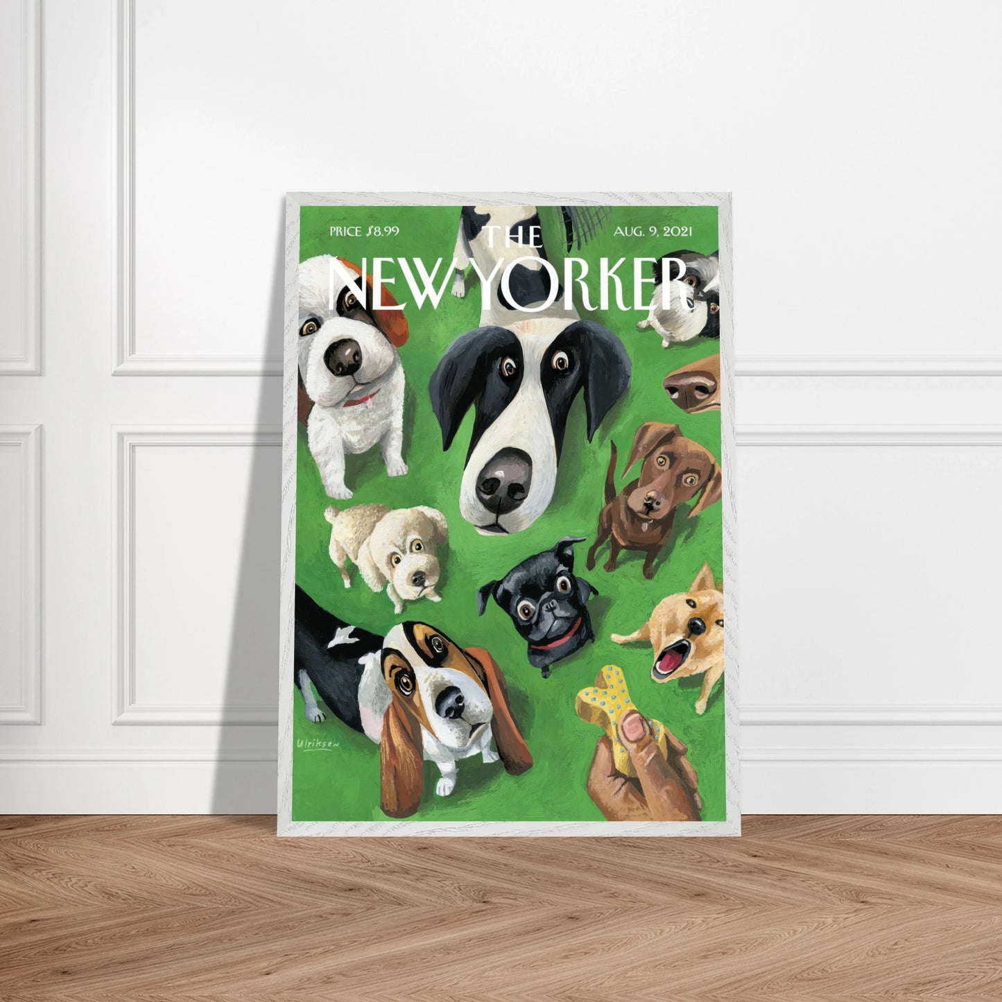 Titled "Summer Treat," this cover by artist Mark Ulriksen captures a delightful summer moment from a dog's perspective. A variety of eager and focused dogs, rendered in Ulriksen's characteristic painterly style, look upward with anticipation at a squeaky toy held by a human hand.