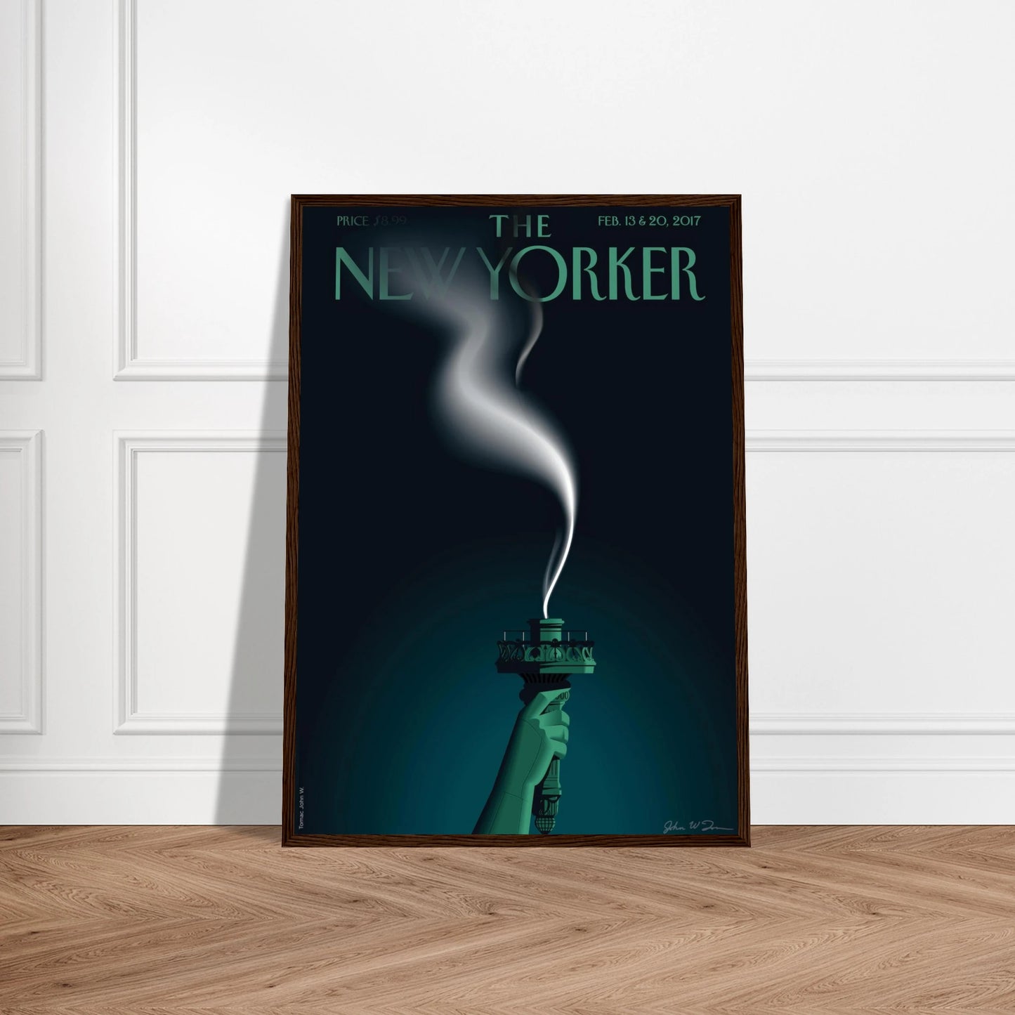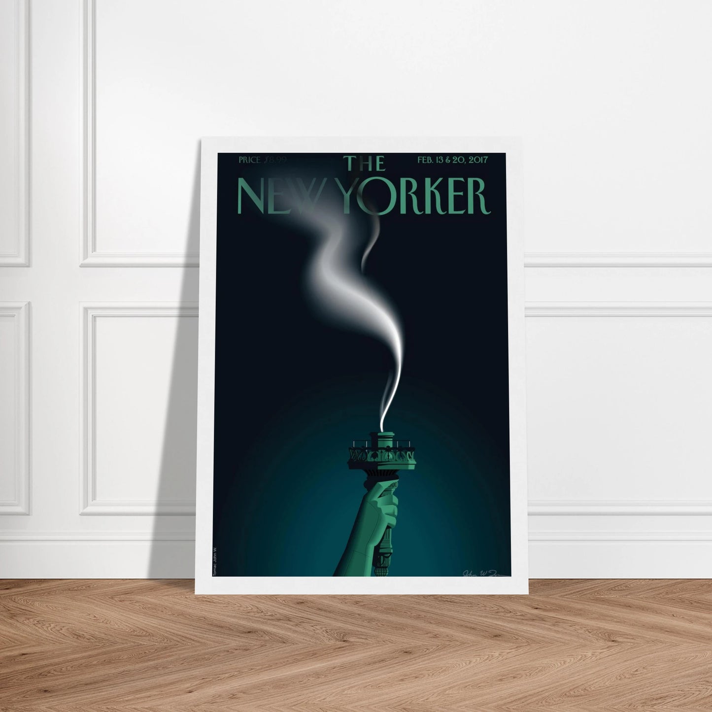 Make a bold statement with this minimalist yet haunting New Yorker cover by John W. Tomac, first published on February 13 & 20, 2017. Featuring the extinguished flame of the Statue of Liberty's torch trailing into a wisp of smoke, this artwork captures a powerful moment of reflection. A compelling piece of modern political art, ideal for lovers of symbolism, liberty, and sleek contemporary design.