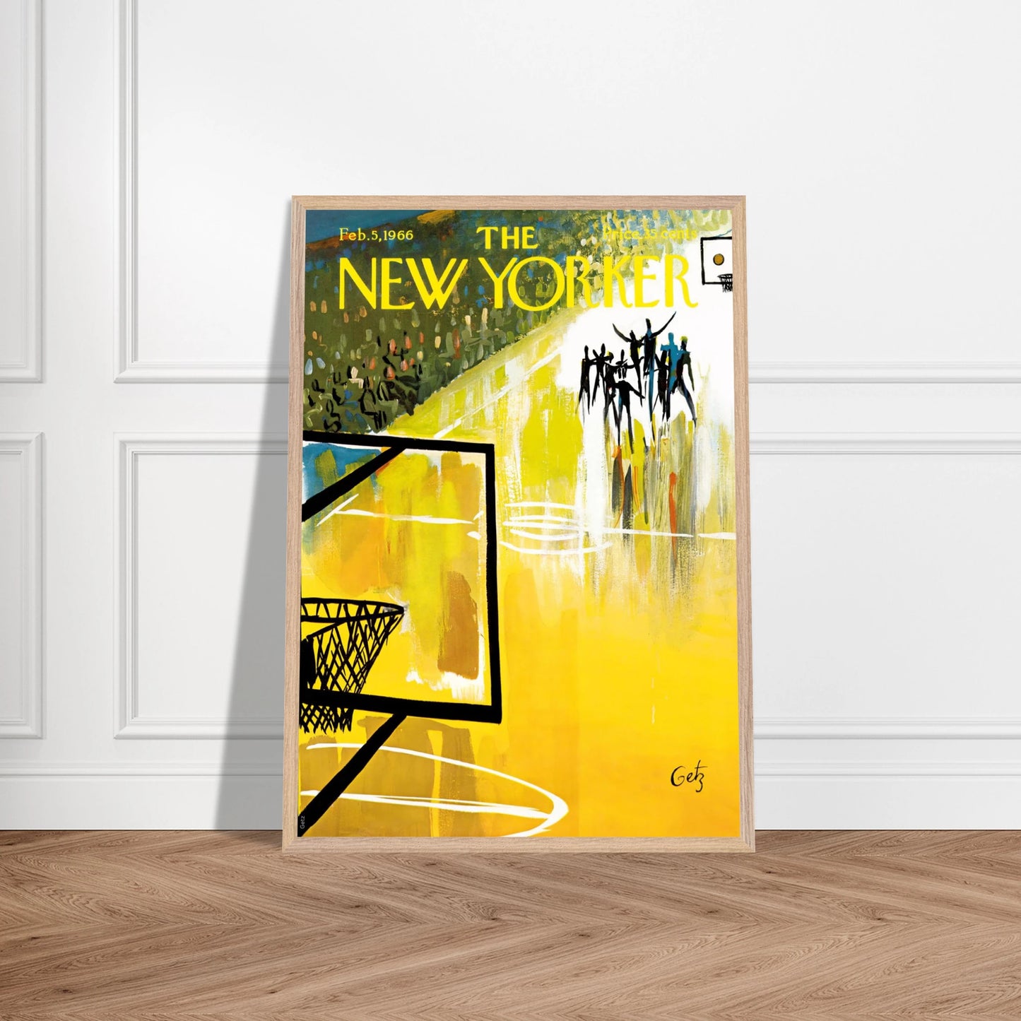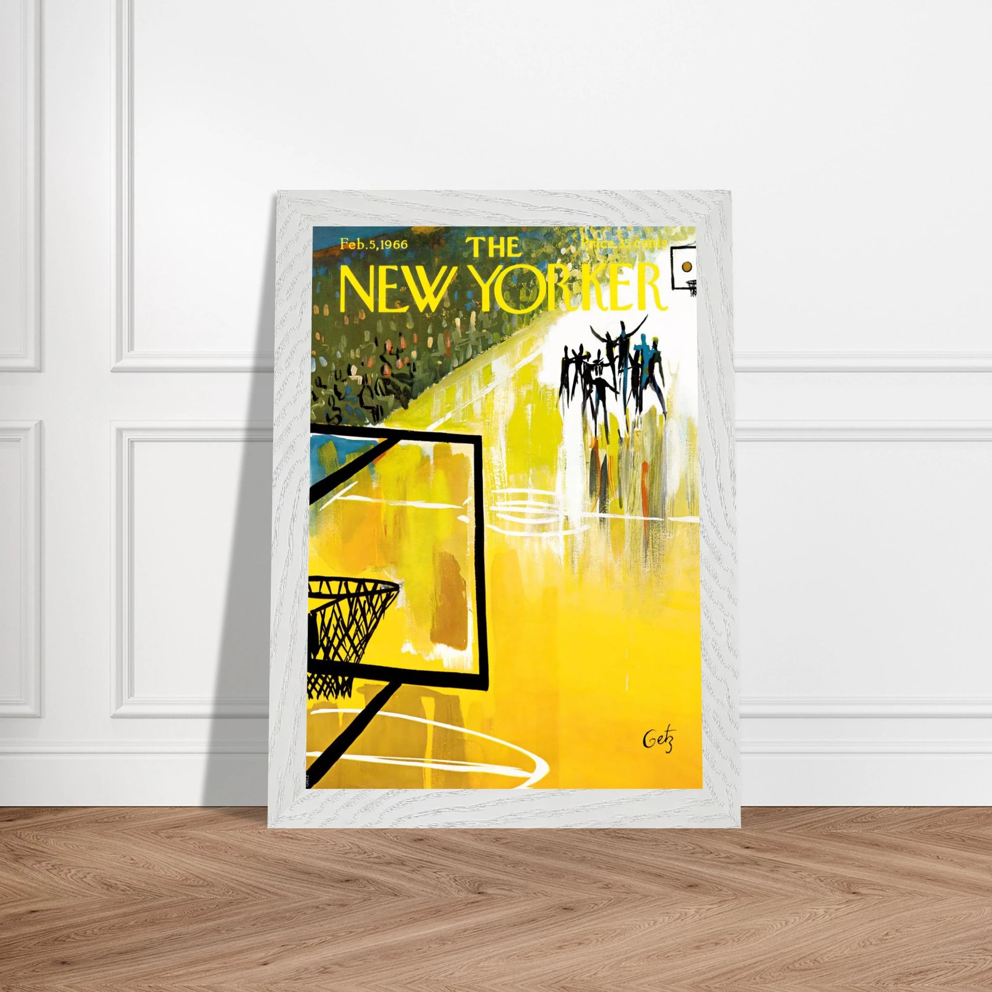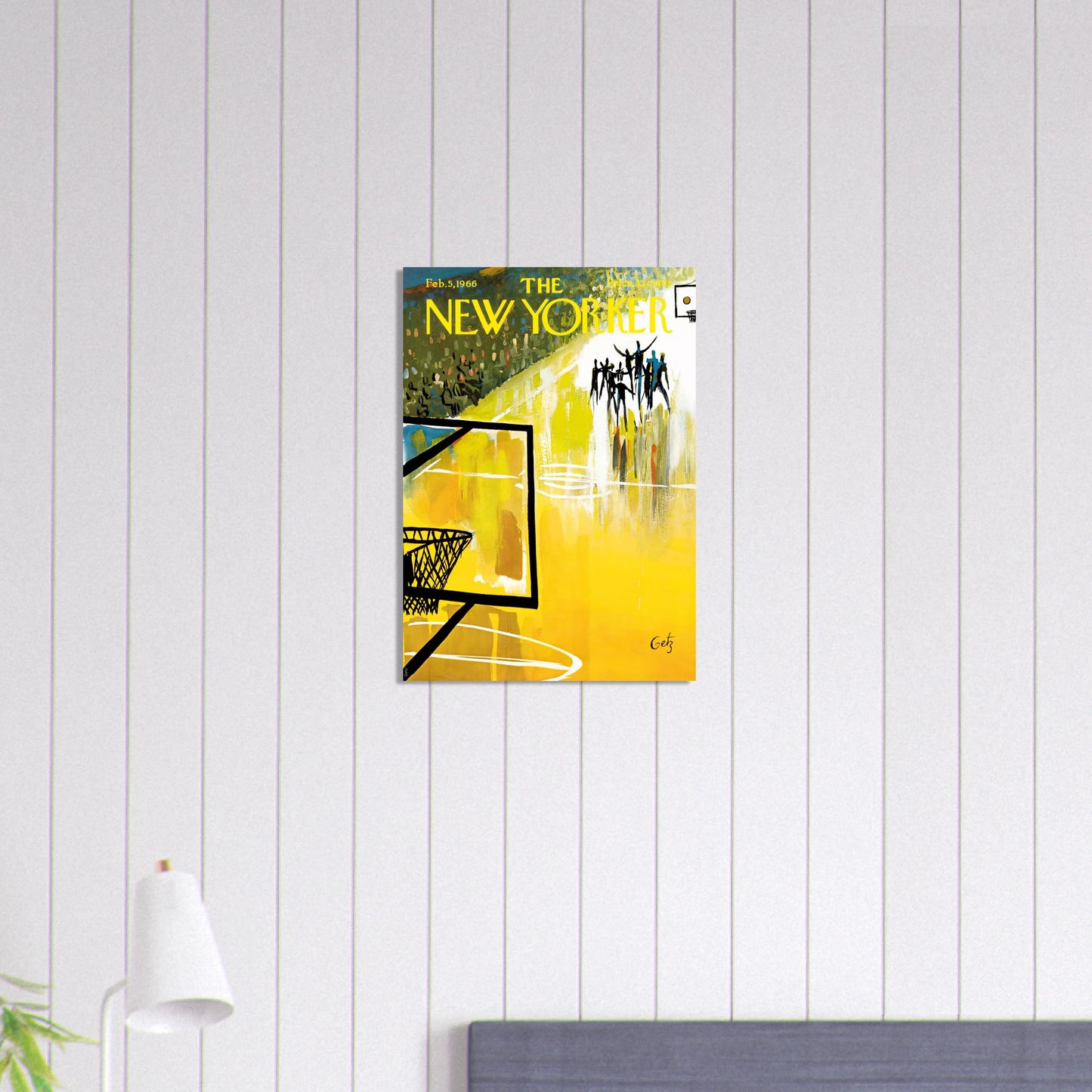 The artwork is notable for its abstract and expressionistic style. Getz uses fluid, energetic brushwork and a minimalist approach to convey the speed and intensity of the game rather than focusing on realistic detail. The players are reduced to dynamic, calligraphic silhouettes, their elongated forms conveying a sense of jumping and reaching. The composition is highly effective; by placing the viewer behind the basket, Getz creates an immersive experience, as if we are right on the court, looking up at the pivotal moment of a play. The dominant, brilliant yellow palette evokes the heat and glare of the arena lights, infusing the entire scene with an electric energy. It’s a masterful example of using abstraction to capture the pure feeling and kinetic excitement of a live sporting event.