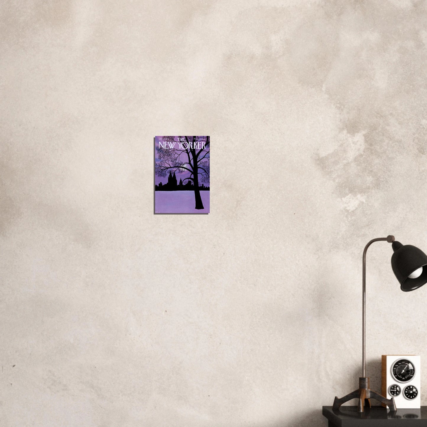 The cover presents a serene and atmospheric winter scene at twilight. In the foreground, the dark silhouette of a large, bare tree stands against a deep purple and lavender sky. A blanket of snow covers the ground, and in the distance, the iconic silhouetted skyline of New York's Central Park West, including the twin towers of the San Remo apartment building, is visible under a full moon.