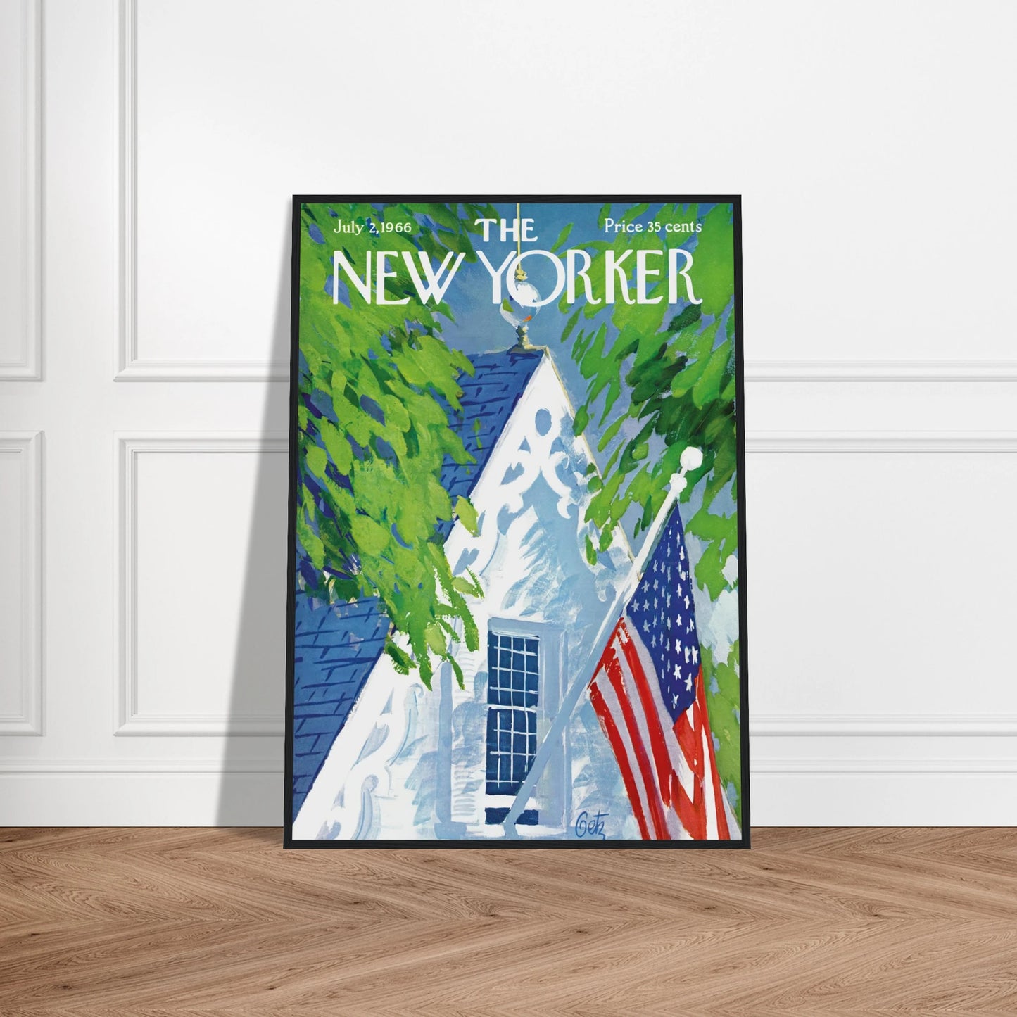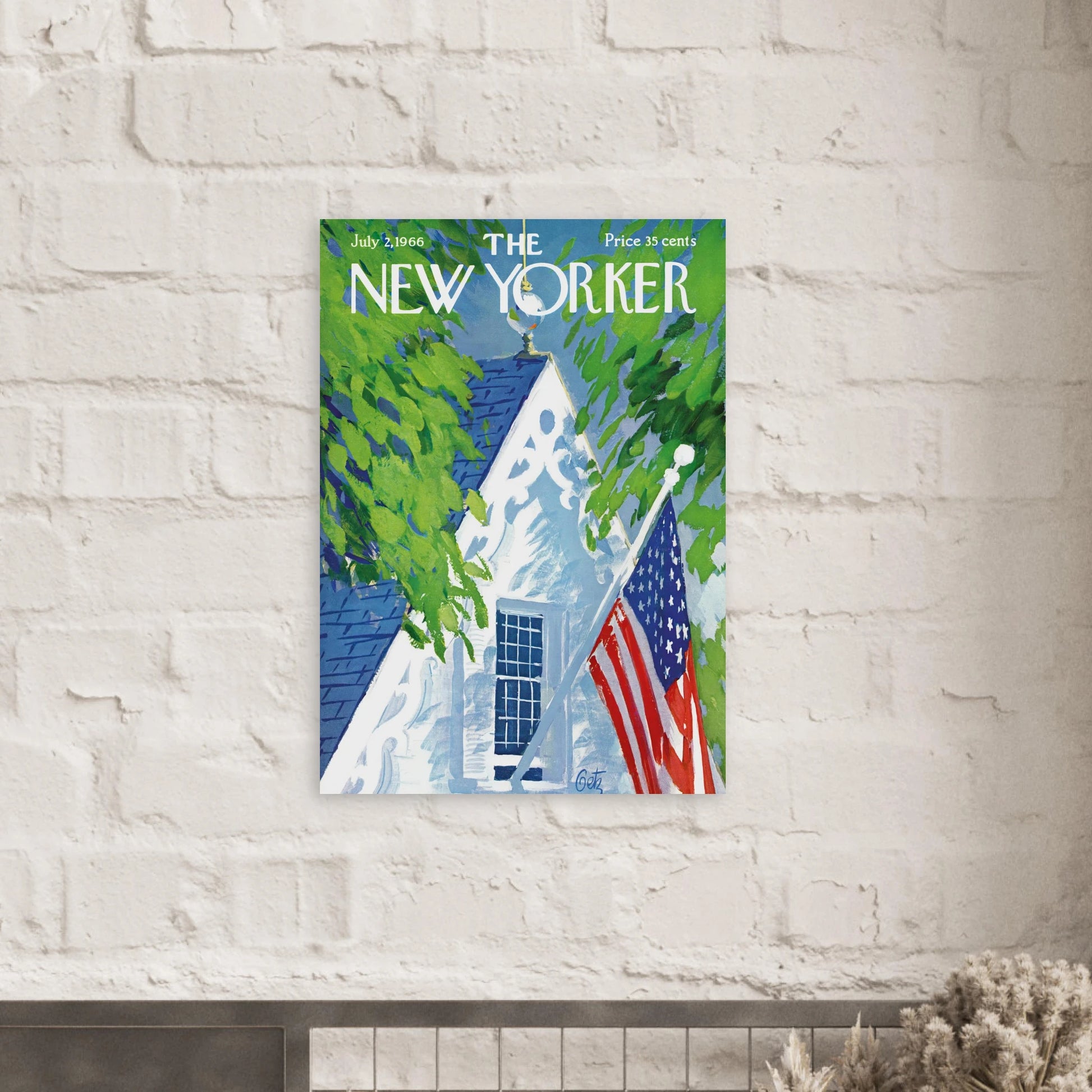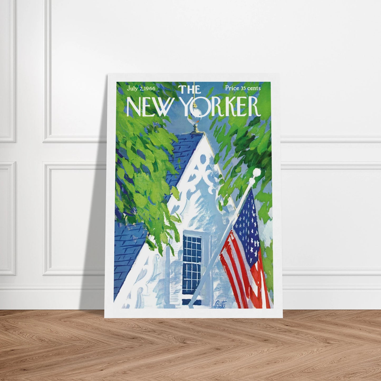 Celebrate classic Americana with this vintage New Yorker cover from July 2, 1966, illustrated by Arthur Getz. Featuring a charming white-trimmed house nestled in green foliage with an American flag proudly waving, this artwork captures the essence of small-town summers. Perfect wall art for Independence Day lovers, patriotic decor enthusiasts, and fans of vintage magazine covers. Printed in high resolution—ideal for home, office, or gallery walls.