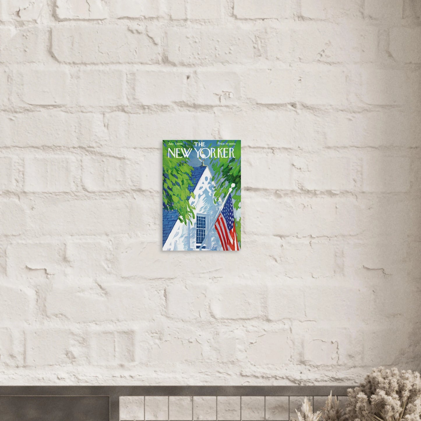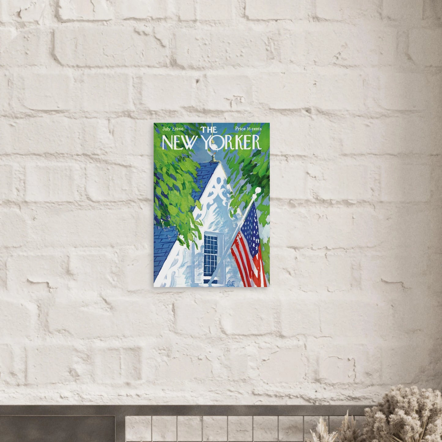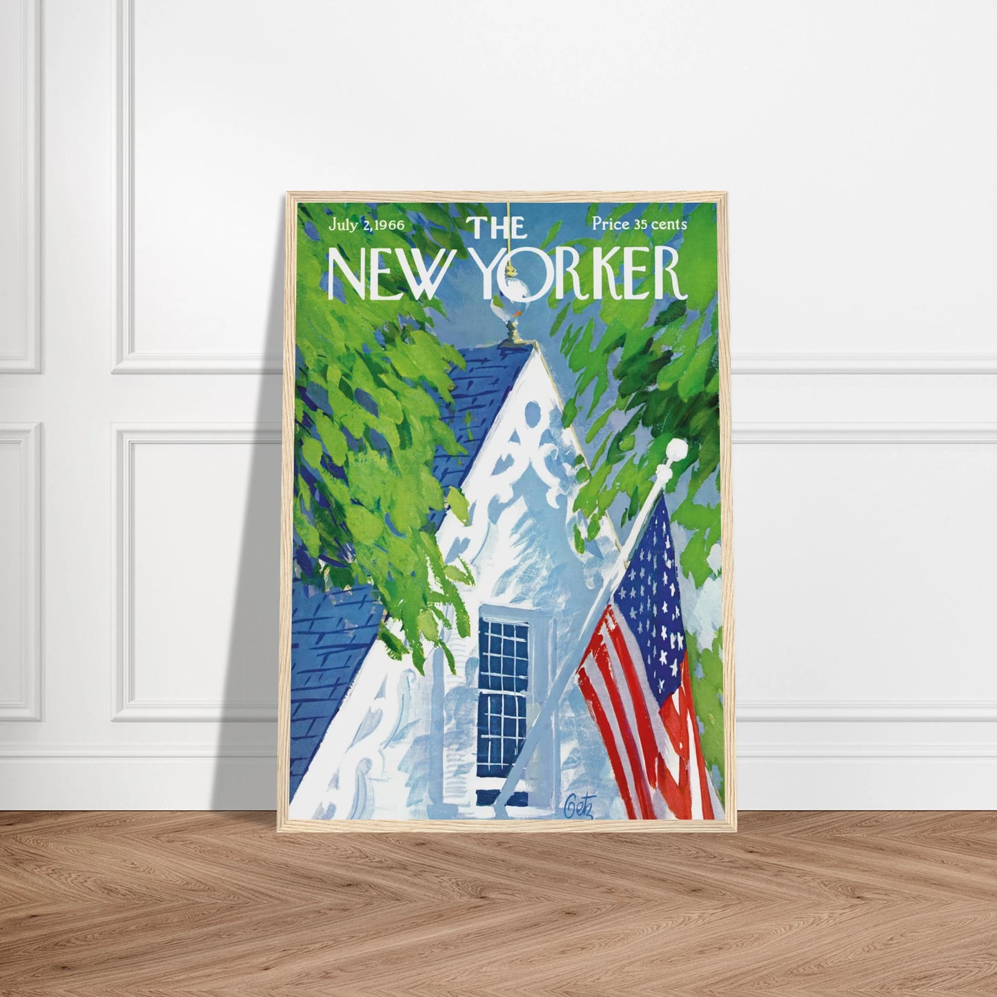 Celebrate classic Americana with this vintage New Yorker cover from July 2, 1966, illustrated by Arthur Getz. Featuring a charming white-trimmed house nestled in green foliage with an American flag proudly waving, this artwork captures the essence of small-town summers. Perfect wall art for Independence Day lovers, patriotic decor enthusiasts, and fans of vintage magazine covers. Printed in high resolution—ideal for home, office, or gallery walls.
