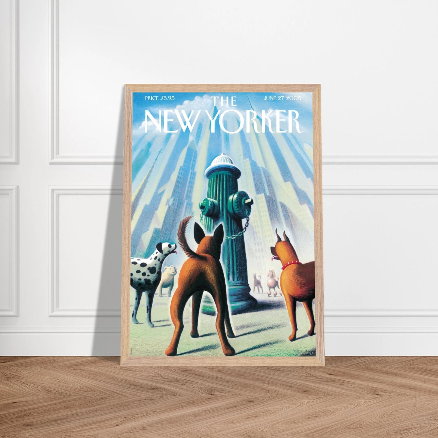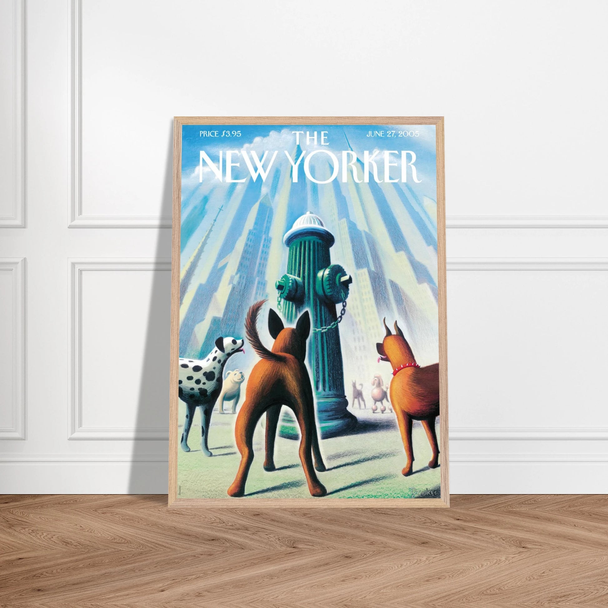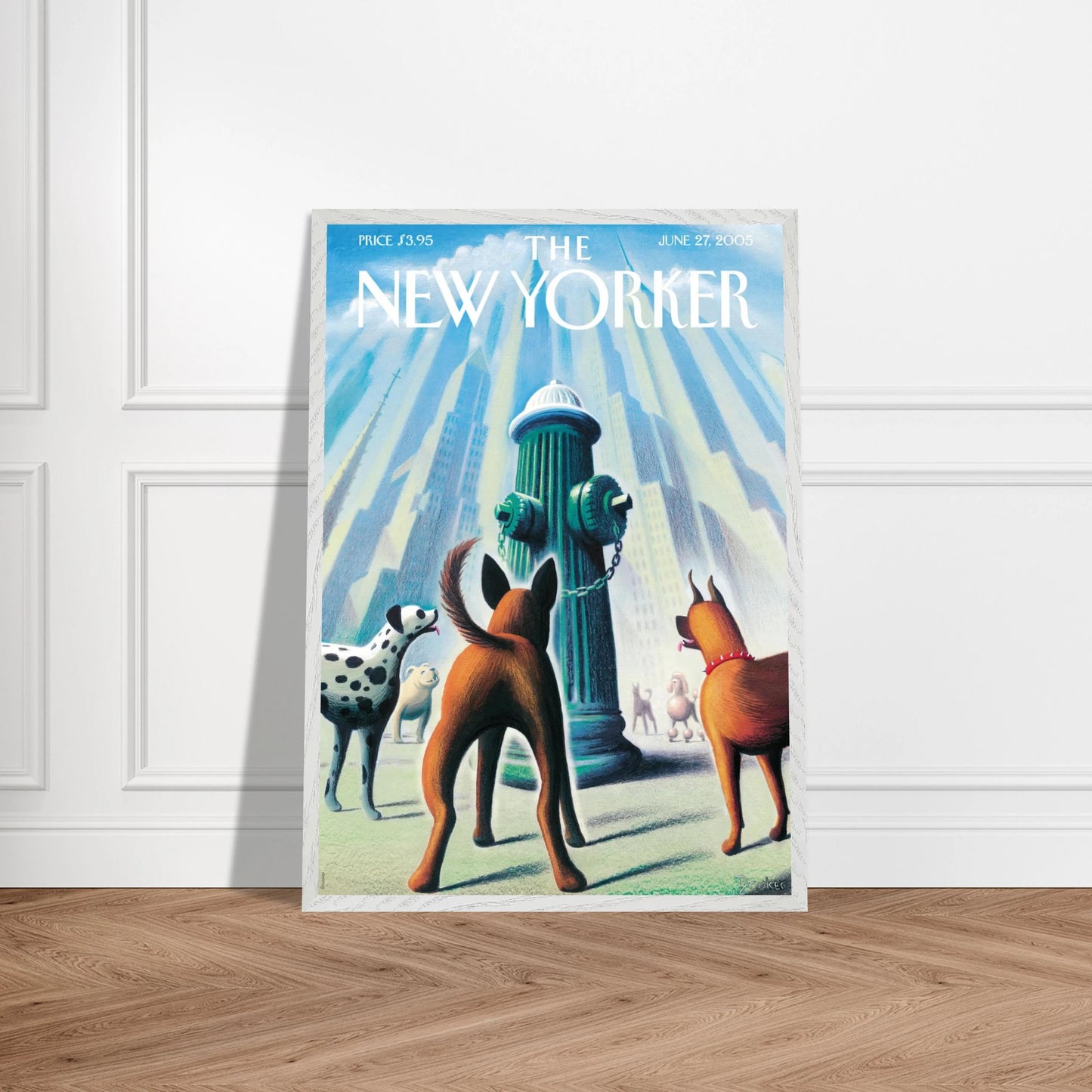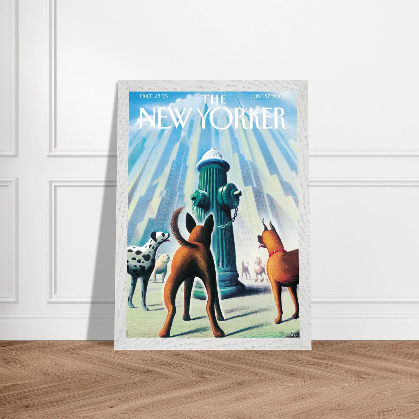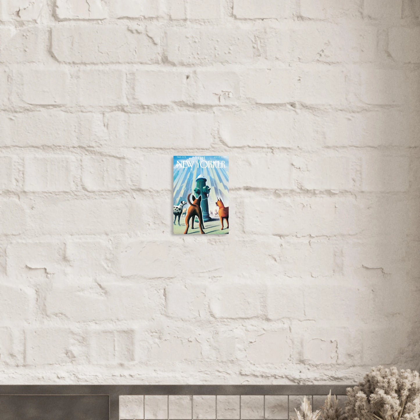 "Dog's Eye View" is a brilliant execution of a simple, clever concept: how do dogs perceive the city? Drooker humorously elevates the mundane fire hydrant—an object of supreme importance in the canine world—to the status of an awe-inspiring monument. He employs techniques typically used for heroic or divine subjects, such as the low-angle perspective and the celestial rays of light, to create a scene of mock-heroic worship. The artwork is a funny and insightful commentary on perspective, reminding the viewer that the same urban environment is experienced in vastly different ways by its various inhabitants. It’s a masterful blend of social observation and visual wit.