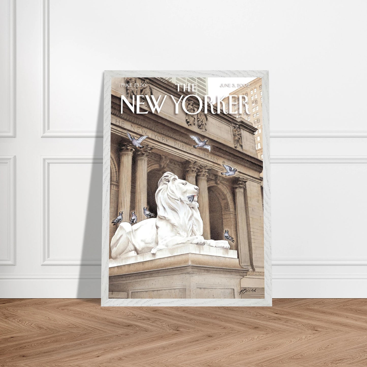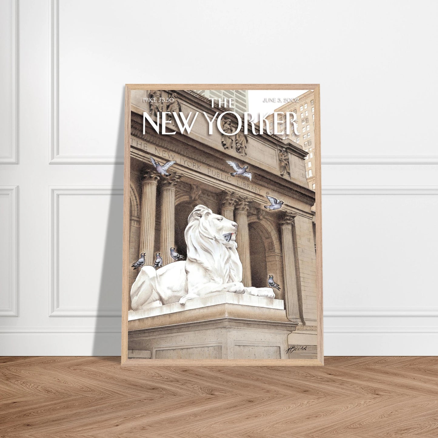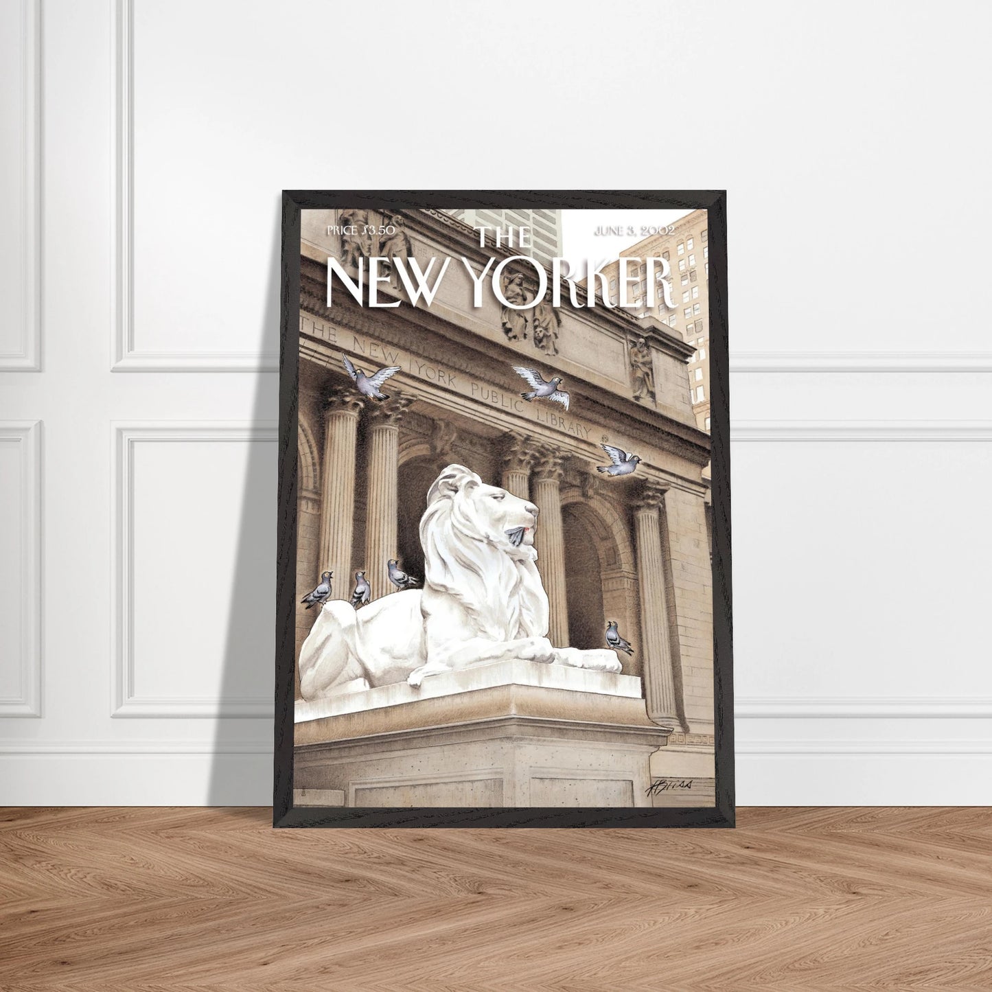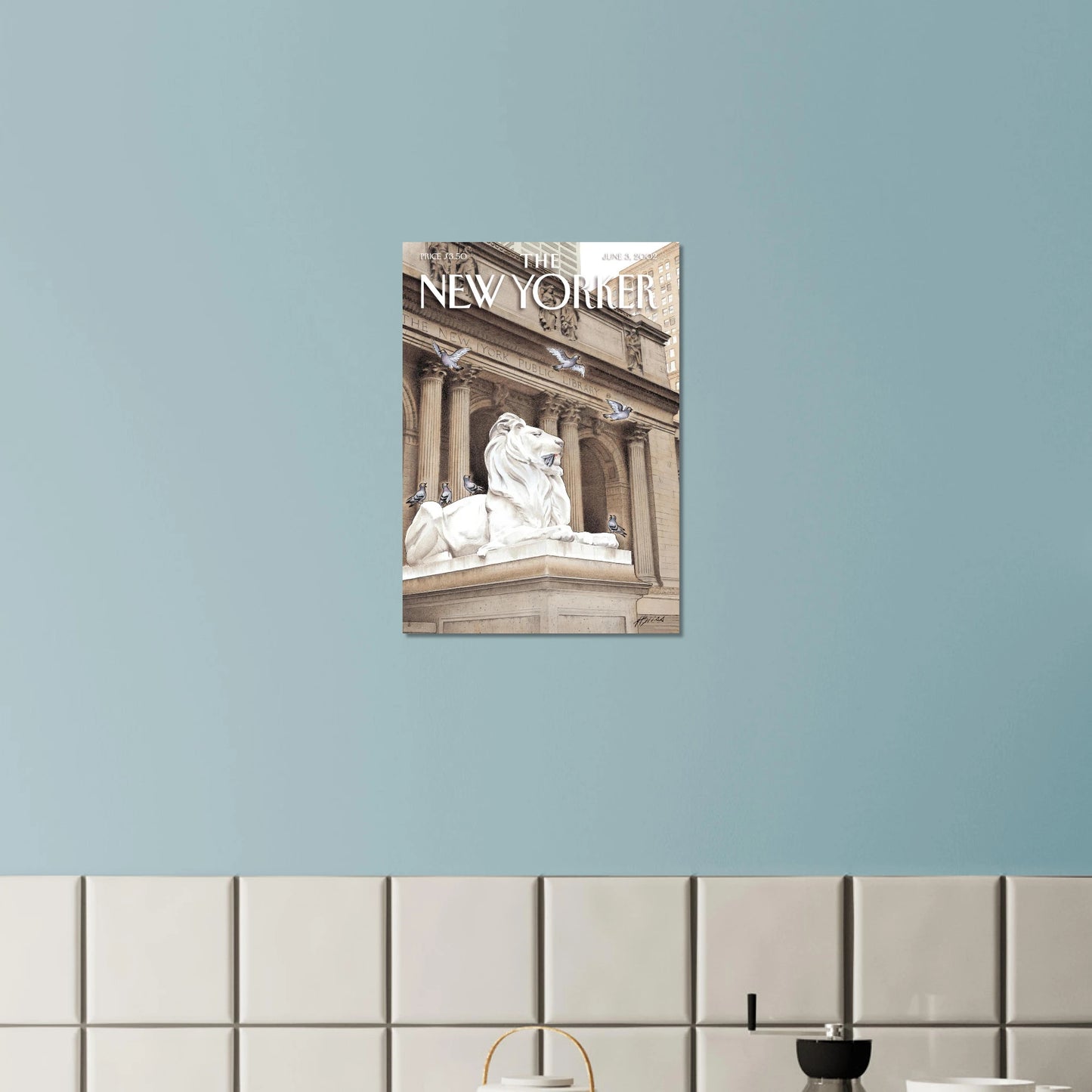 This cover for the June 3, 2002, issue of The New Yorker, titled "Patience," is by artist Harry Bliss. The illustration features one of the iconic marble lions that famously guards the entrance to the New York Public Library. While several pigeons are perched innocently on and around the statue, a single, tiny red feather stuck to the lion's lip humorously implies that its patience with its avian companions has finally worn out.