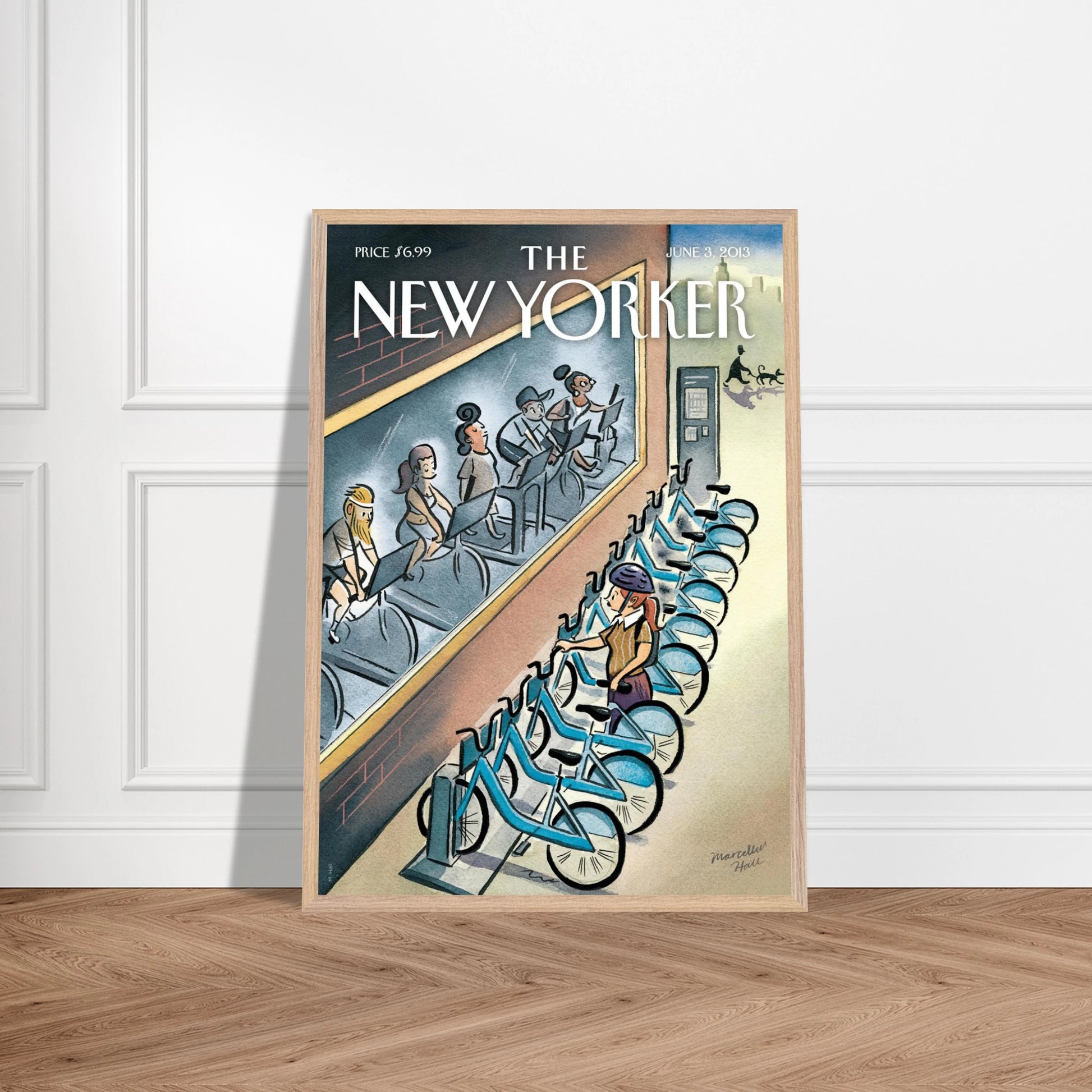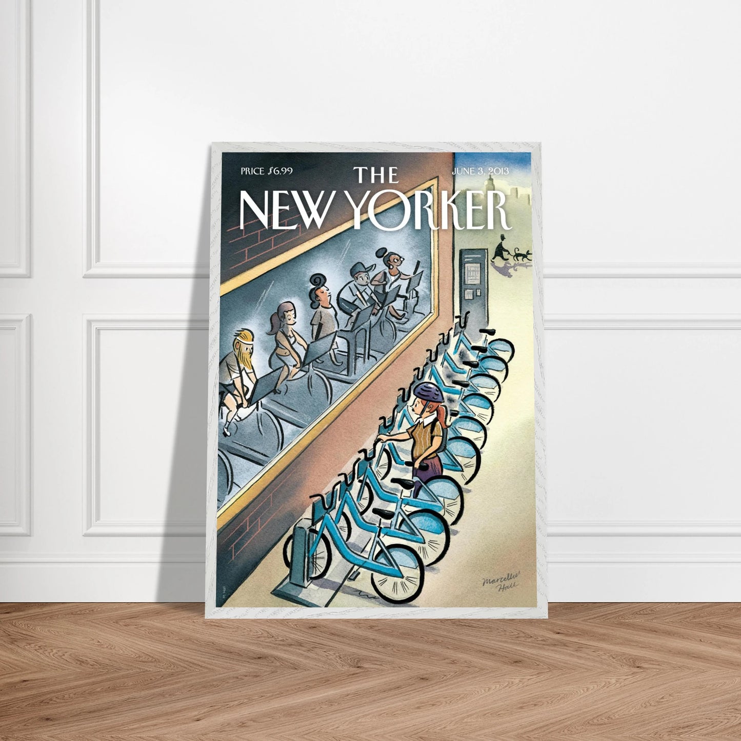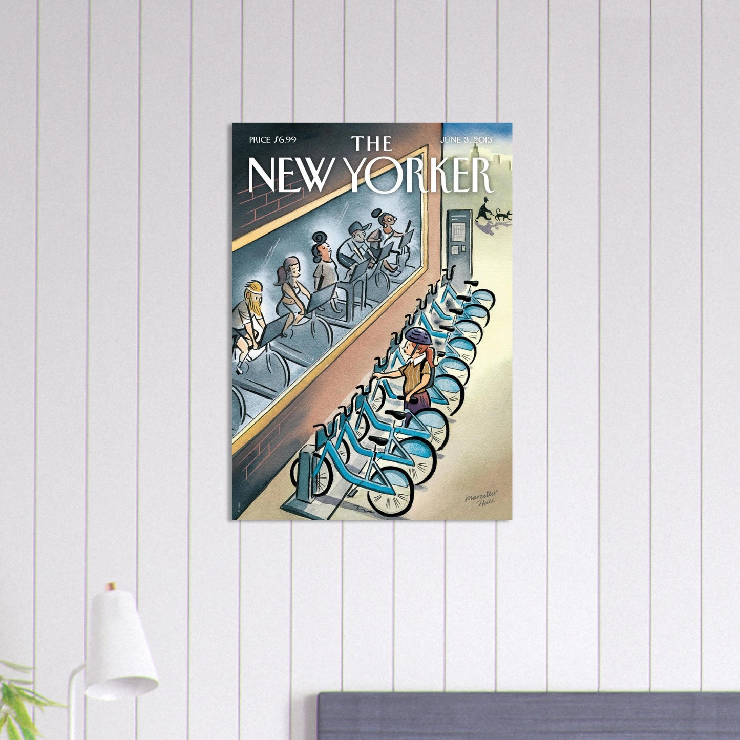 This cover for the June 3, 2013, issue of The New Yorker, titled "Urban Cycles," is by artist Marcellus Hall. The illustration captures a quintessential New York scene, showing a woman in a helmet about to use a bicycle from a newly installed public bike-share station. In the large window behind her, a spin class is in full swing, with people energetically pedaling on stationary bikes.
