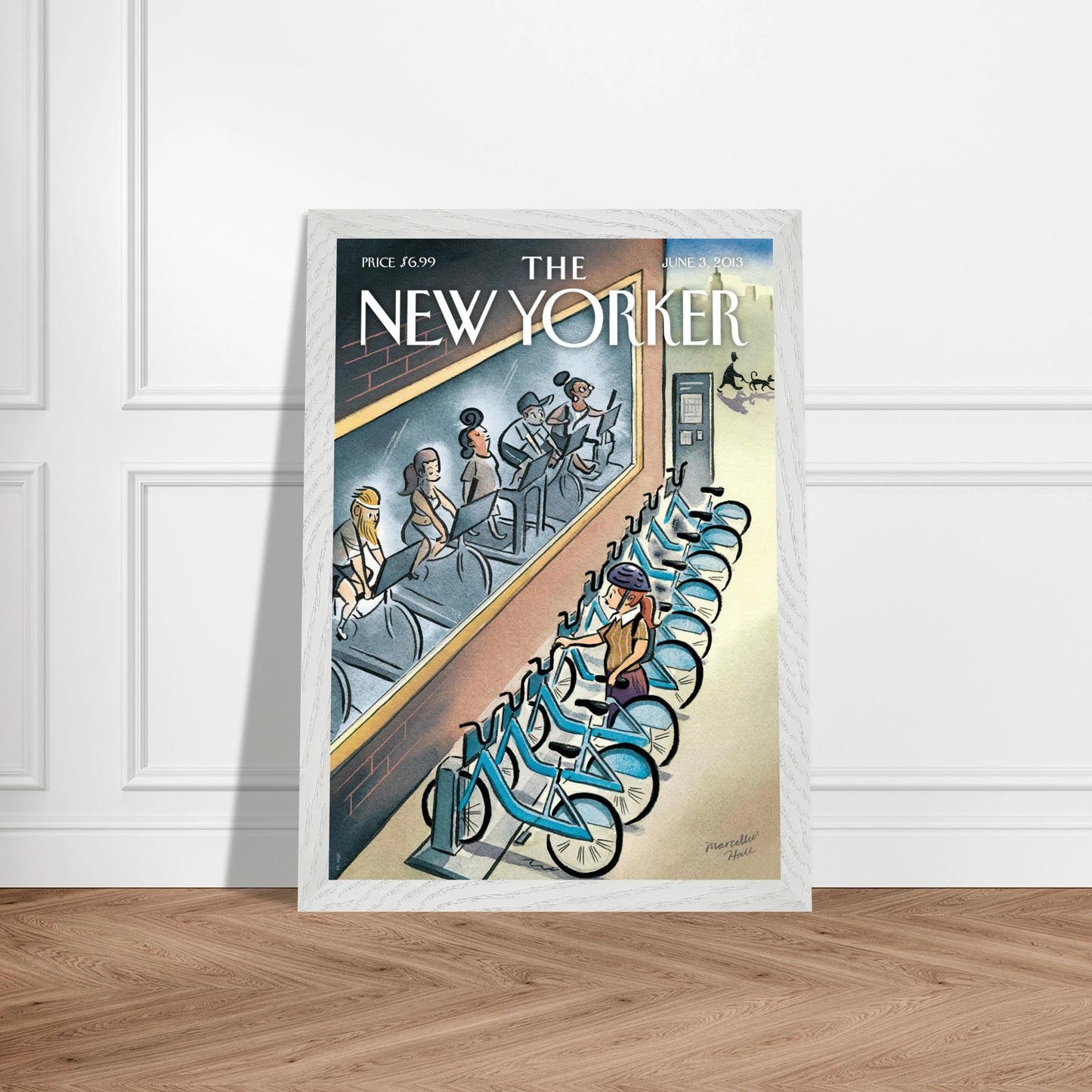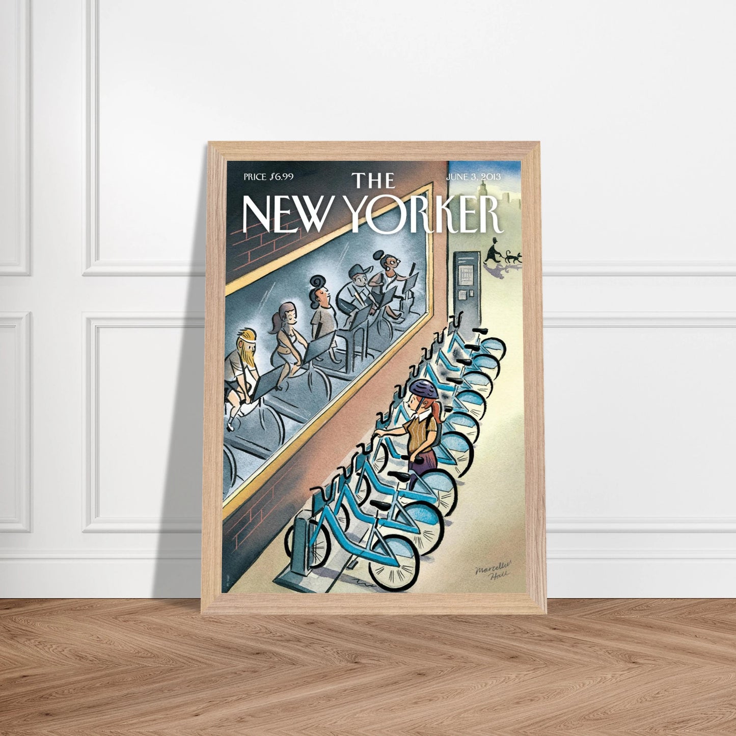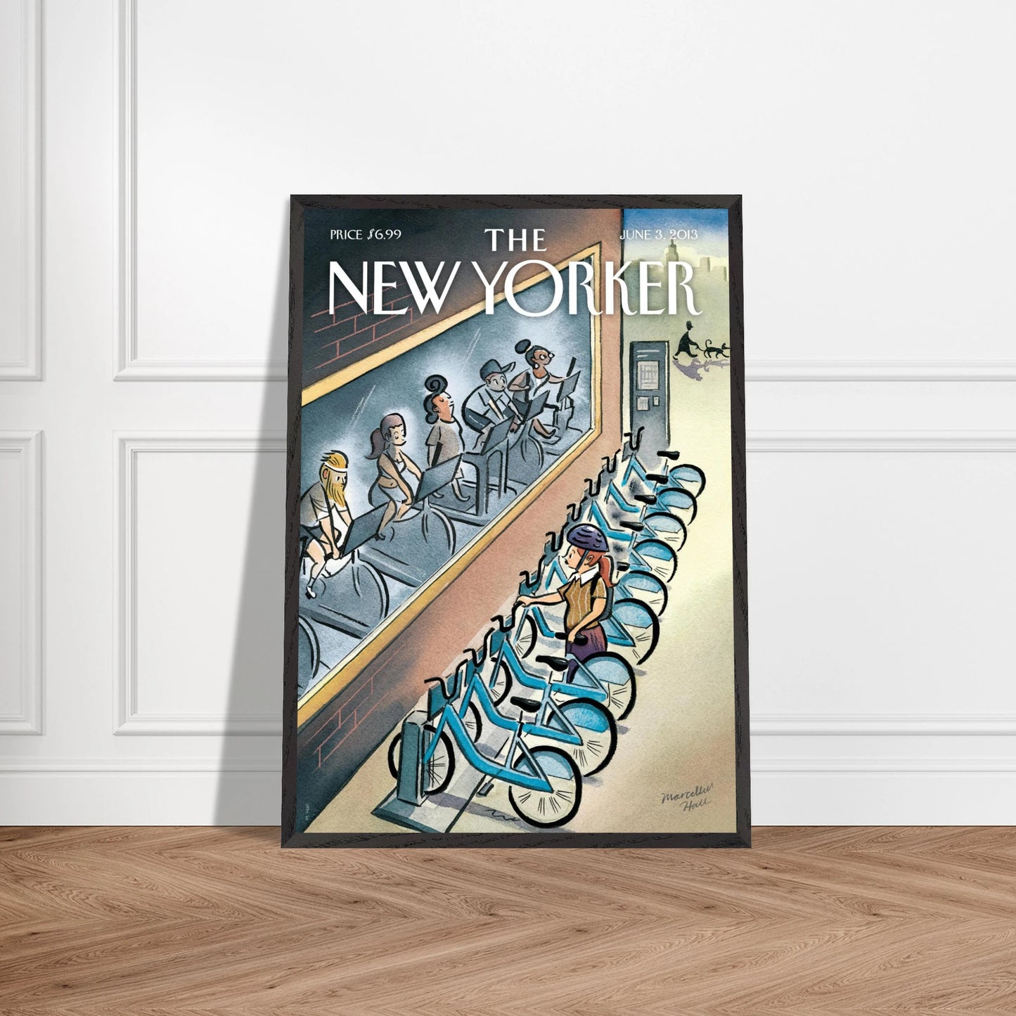 This cover for the June 3, 2013, issue of The New Yorker, titled "Urban Cycles," is by artist Marcellus Hall. The illustration captures a quintessential New York scene, showing a woman in a helmet about to use a bicycle from a newly installed public bike-share station. In the large window behind her, a spin class is in full swing, with people energetically pedaling on stationary bikes.