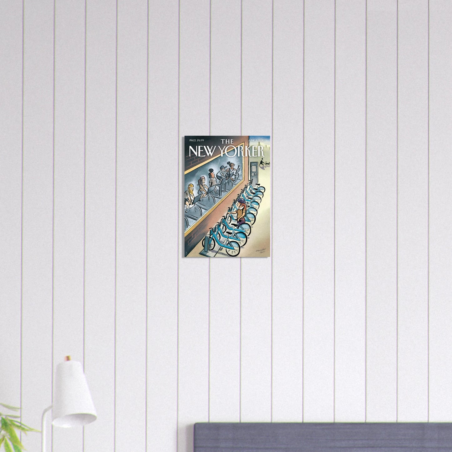 "Urban Cycles" is a witty and timely piece of social commentary, published just a week after New York City's Citi Bike program launched. The artist, Marcellus Hall, masterfully uses juxtaposition to create a gentle but perceptive critique of modern urban life. The cover highlights the irony of people inside a gym paying to simulate an activity—cycling—that is simultaneously happening outside as a form of practical, purposeful transportation. The title itself is a clever pun, referring to both the literal bicycles and the various "cycles" of work and leisure that define city living. It’s a sharp, observational snapshot of a city embracing a new way to move, while wryly noting the paradoxes of contemporary exercise.