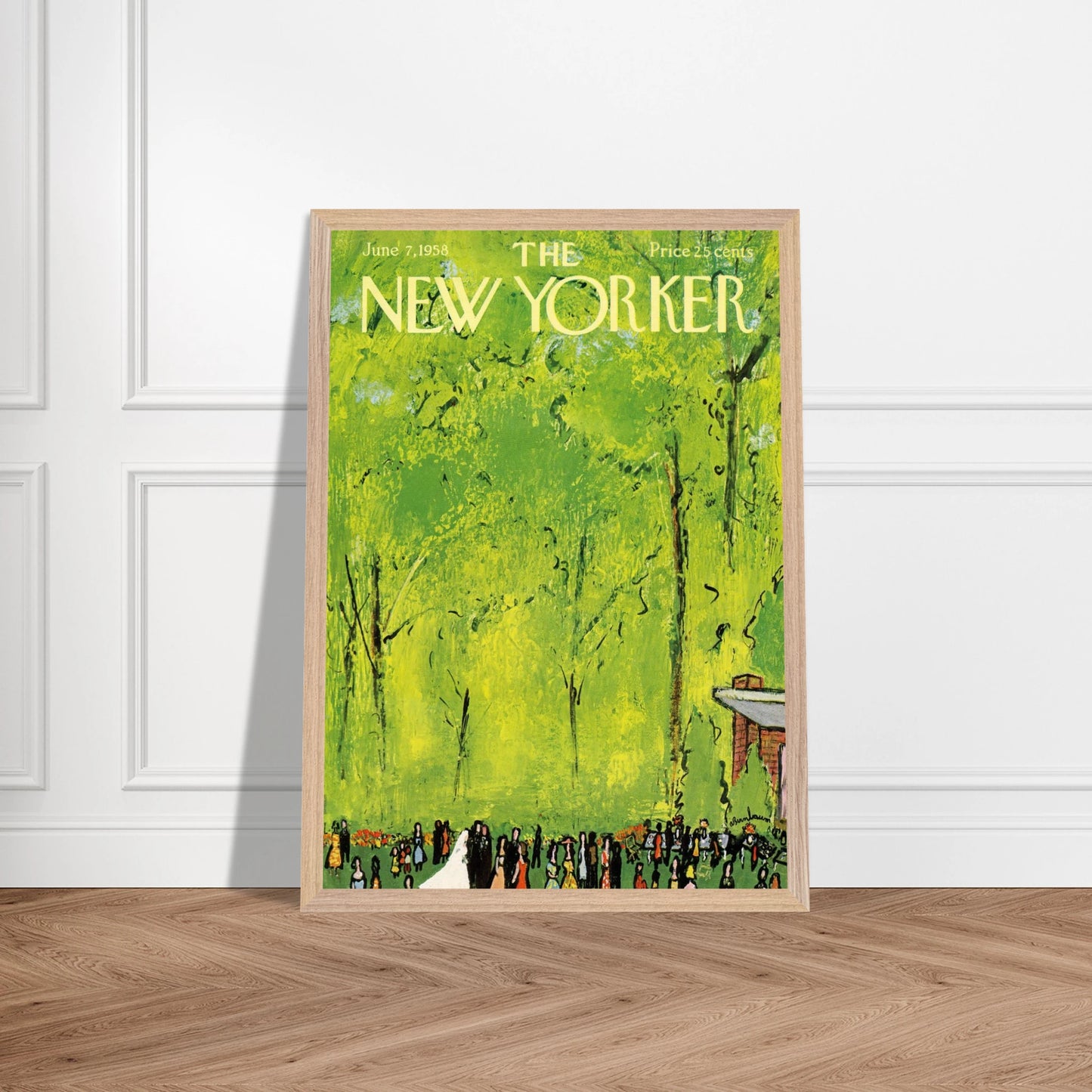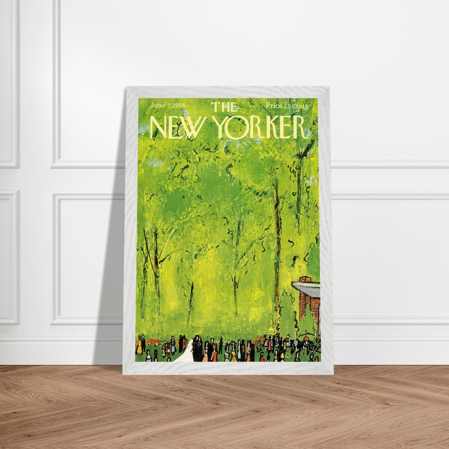 The most striking artistic choice is the use of scale. By minimizing the human figures and dedicating the vast majority of the canvas to the lush, almost abstract rendering of the foliage, Alajalov emphasizes the majesty of nature in early summer. The human event, though central to the narrative, becomes a small part of a much larger, overwhelming natural beauty. The loose, energetic brushwork and the intense, almost monochromatic green palette create a powerful sense of a warm, sun-dappled day. The cover beautifully captures the idyllic and celebratory feeling of a classic June event, enveloped by the fresh, vibrant life of the season.