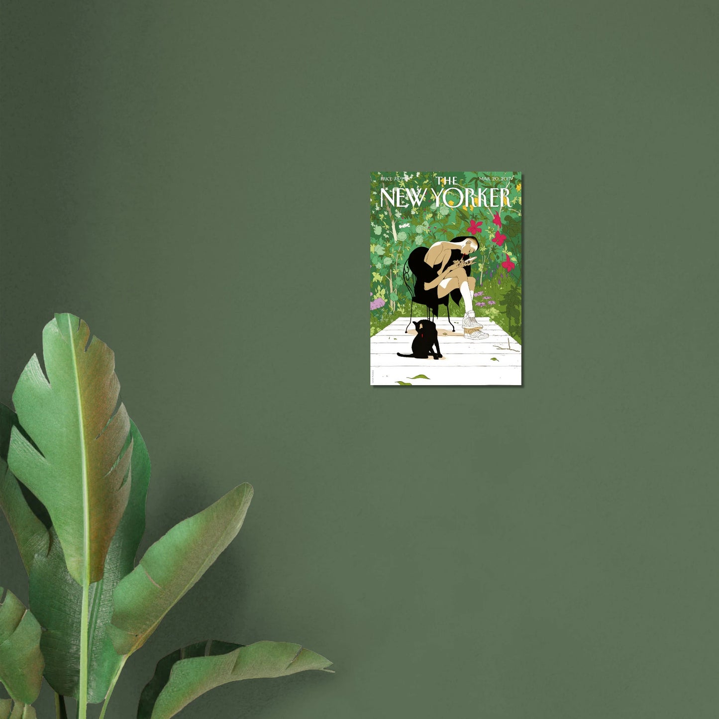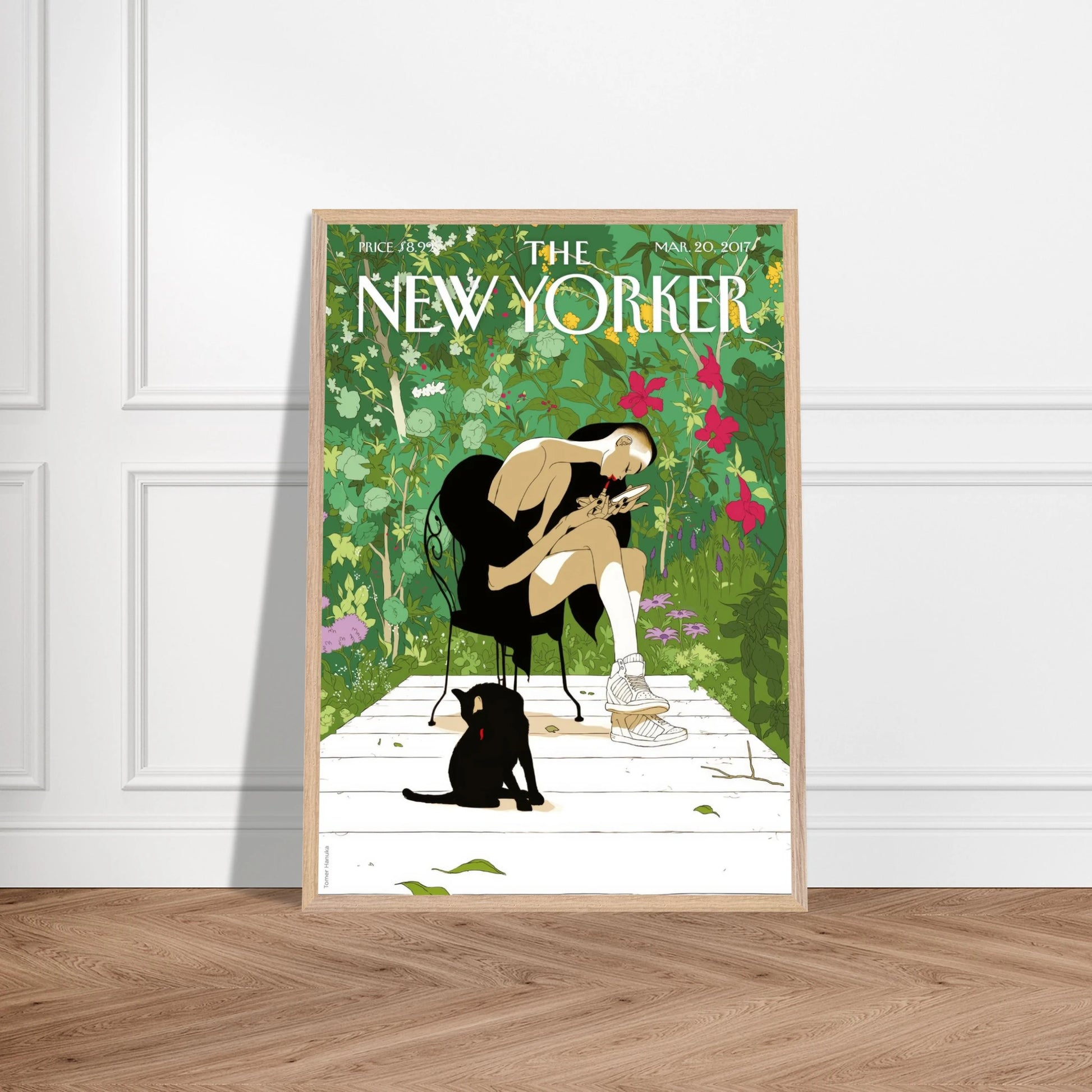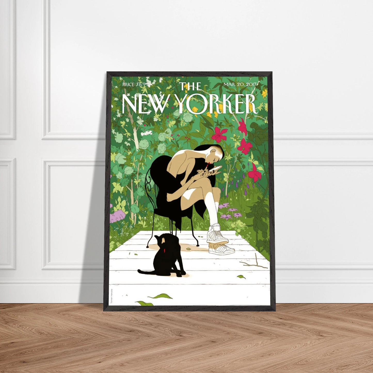 The cover depicts a stylized woman sitting on a black chair on a white wooden deck, surrounded by a lush and wild garden teeming with green foliage and colorful flowers. She is focused on applying lipstick while looking into a compact mirror. A black cat with a small red tag sits at her feet, looking out at the viewer. The scene is a mix of classic and contemporary, with the woman's elegant pose and dress contrasting with her modern, stacked white sneakers.