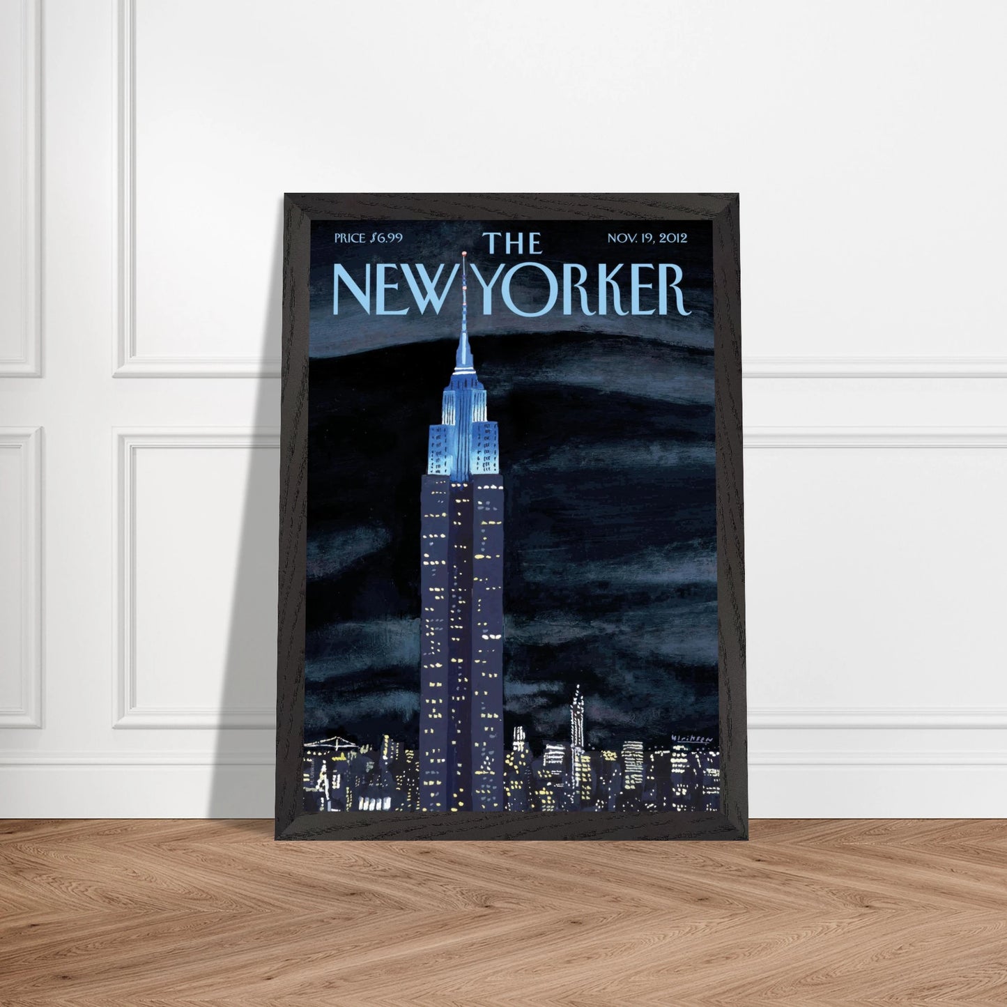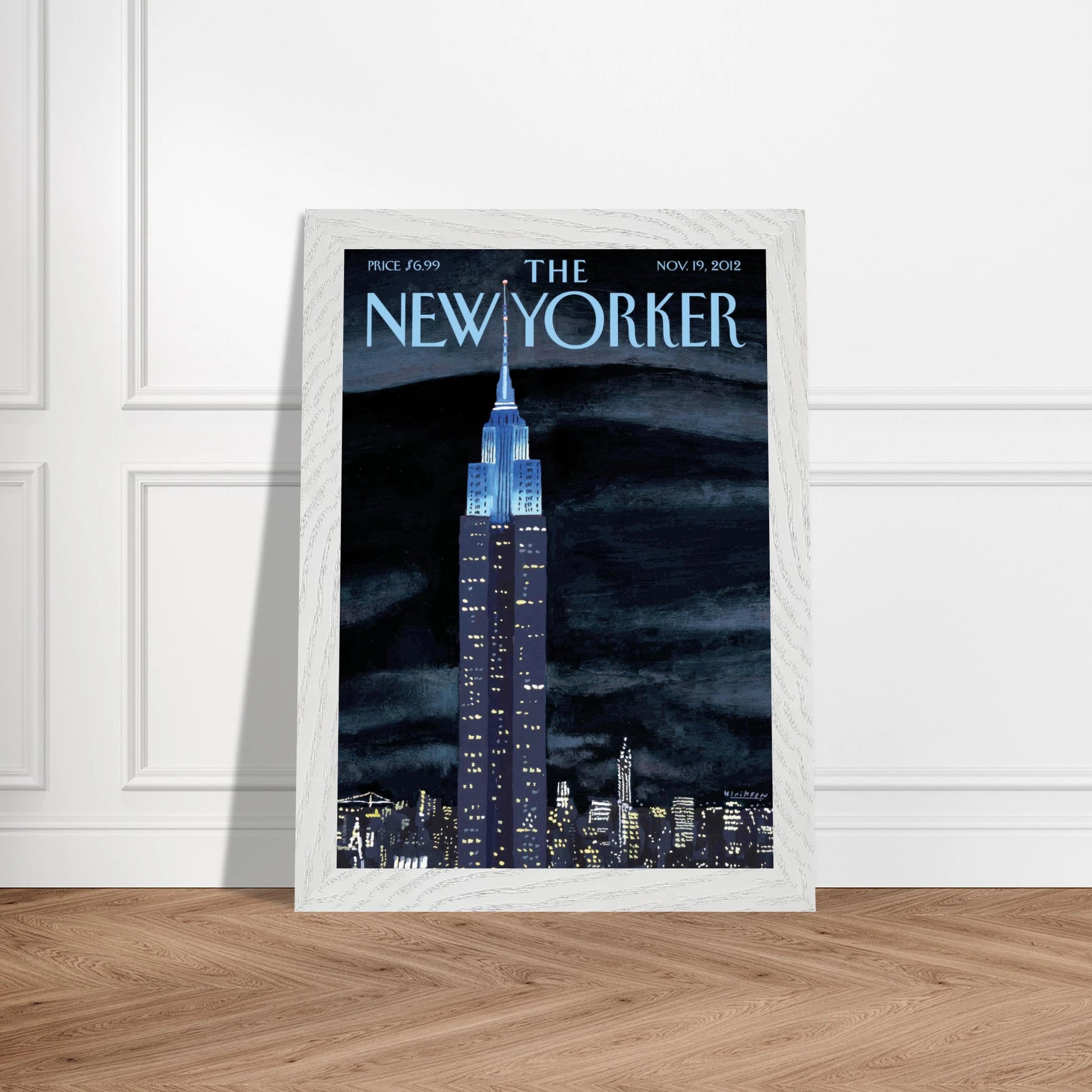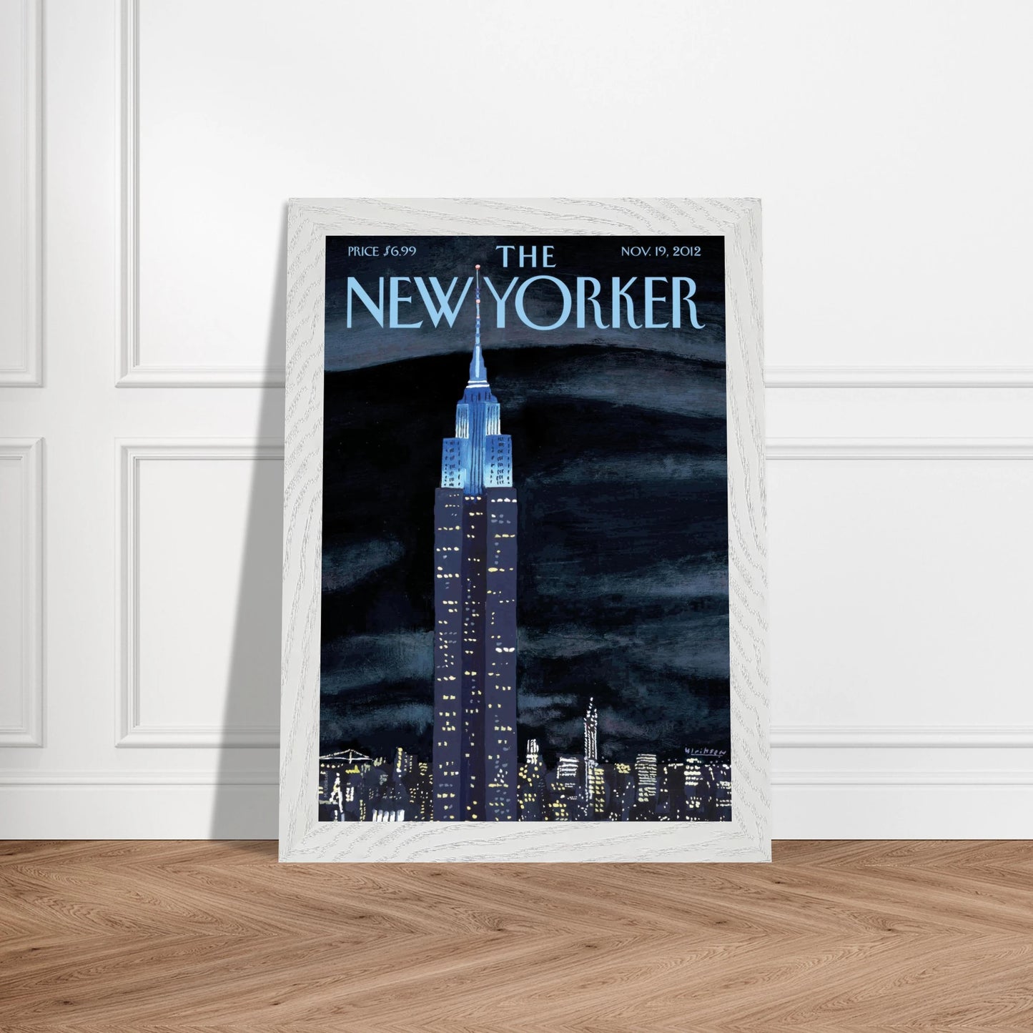 This cover for the November 19, 2012, issue of The New Yorker is titled "Rhapsody in Blue" and was created by artist Mark Ulriksen. The painting depicts the New York City skyline in the aftermath of Hurricane Sandy, which had struck the city just weeks earlier. It powerfully illustrates the resulting blackout, showing the Empire State Building and parts of Midtown illuminated against a dark, moody sky, while Lower Manhattan is almost entirely plunged into darkness.