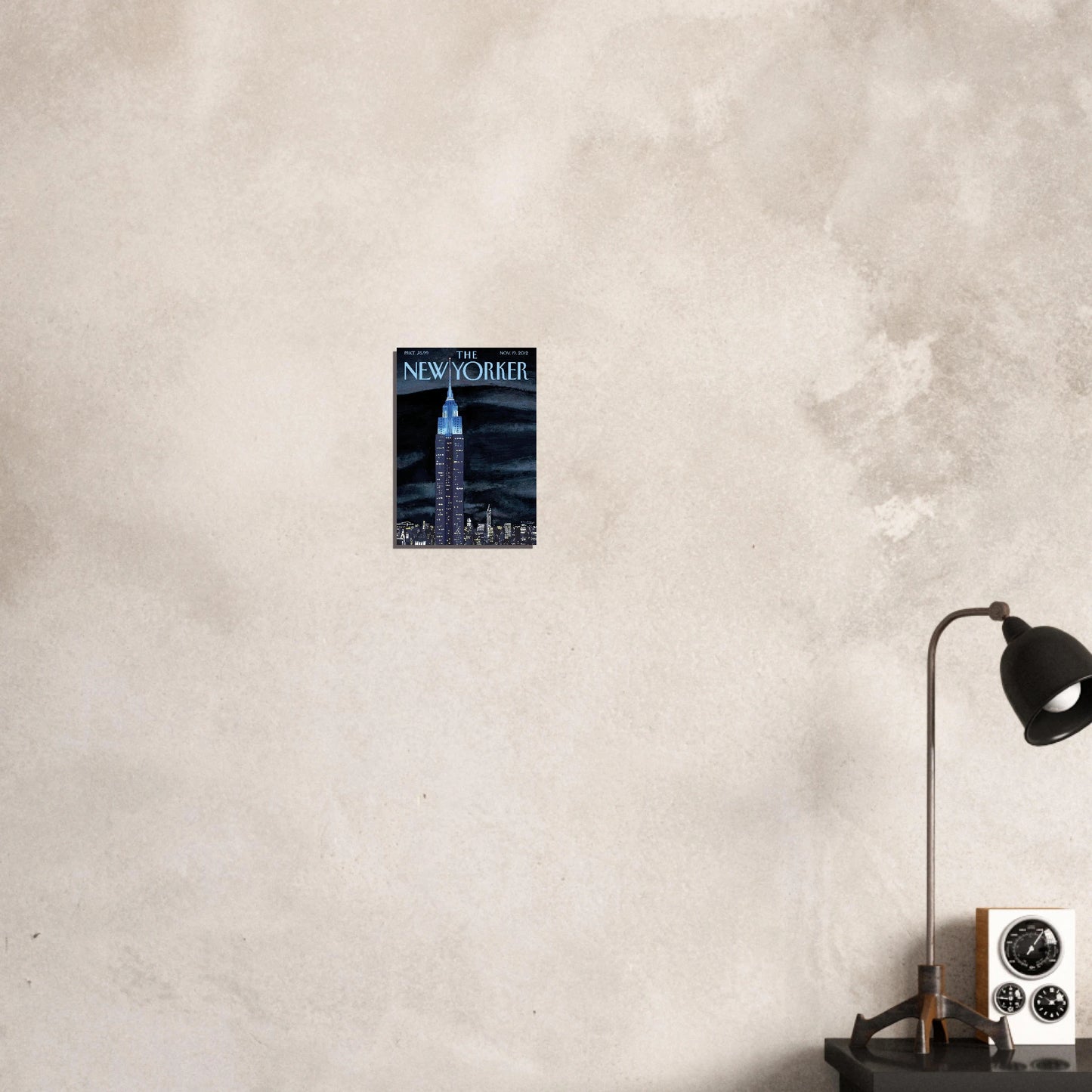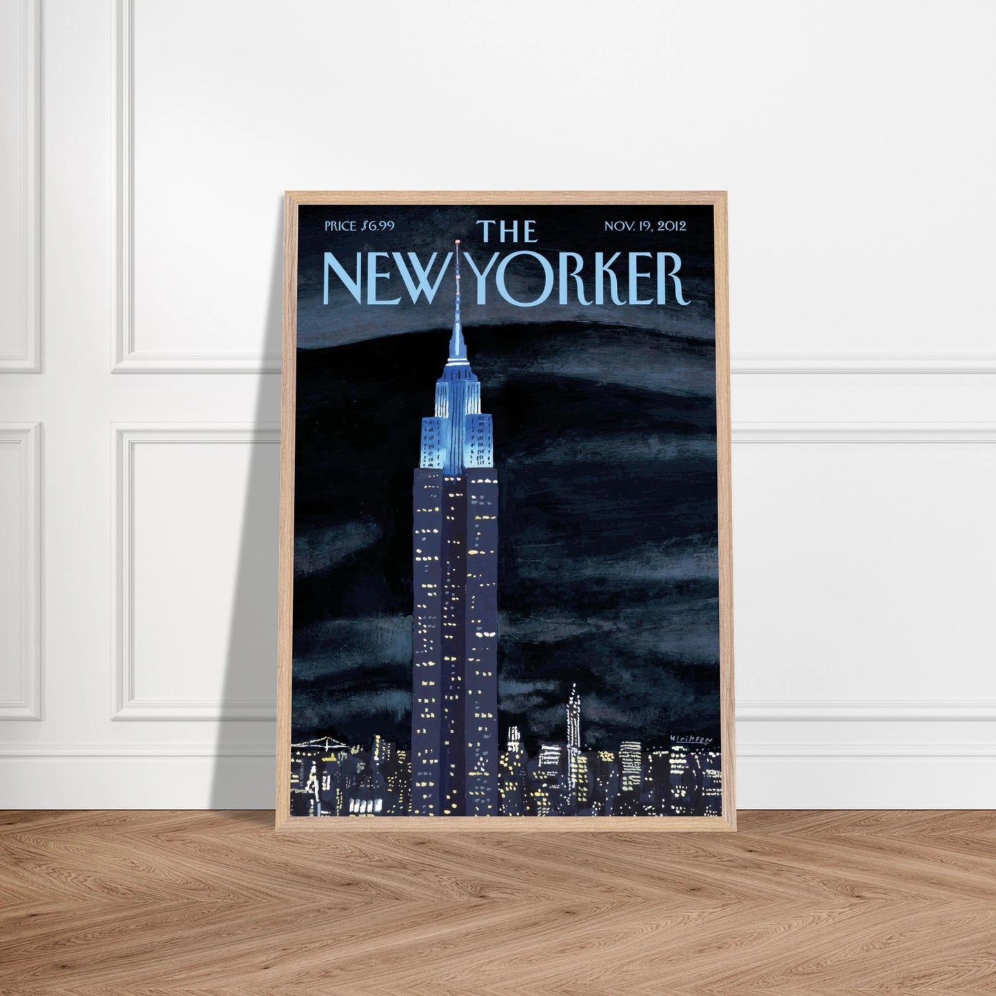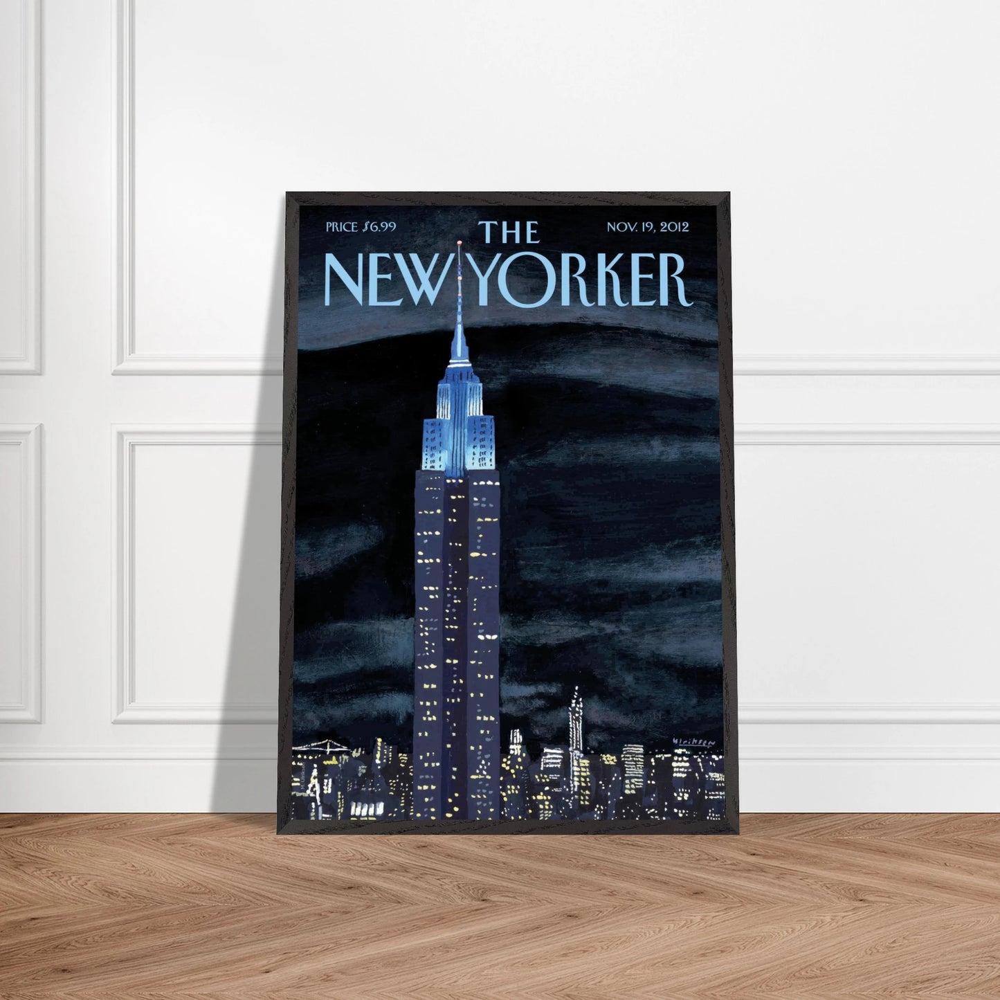 This cover for the November 19, 2012, issue of The New Yorker is titled "Rhapsody in Blue" and was created by artist Mark Ulriksen. The painting depicts the New York City skyline in the aftermath of Hurricane Sandy, which had struck the city just weeks earlier. It powerfully illustrates the resulting blackout, showing the Empire State Building and parts of Midtown illuminated against a dark, moody sky, while Lower Manhattan is almost entirely plunged into darkness.
