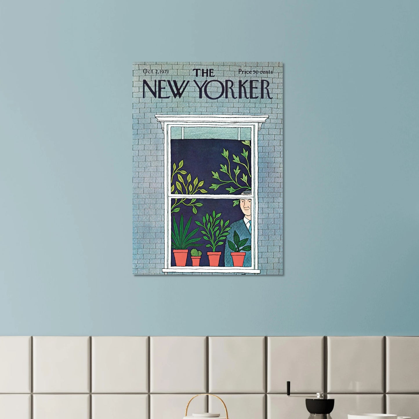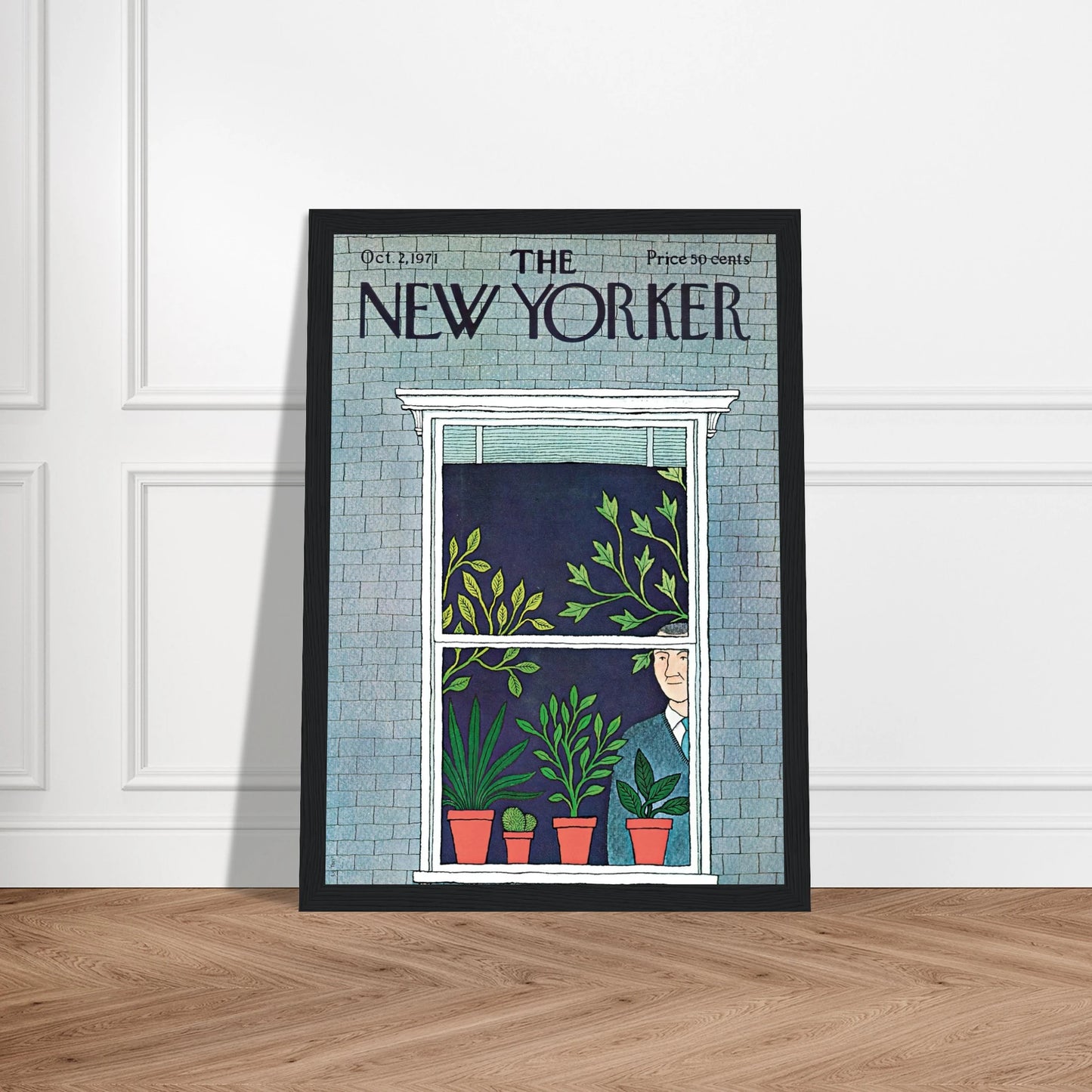 This New Yorker cover from October 2, 1971, offers a quiet glimpse into a home filled with life—of the leafy kind. Potted plants spill across a window sill, reaching toward the glass, while a well-dressed man gazes out, half-hidden among the greenery. The soft textures and subtle humor make this a perfect piece for plant lovers and introverts alike.