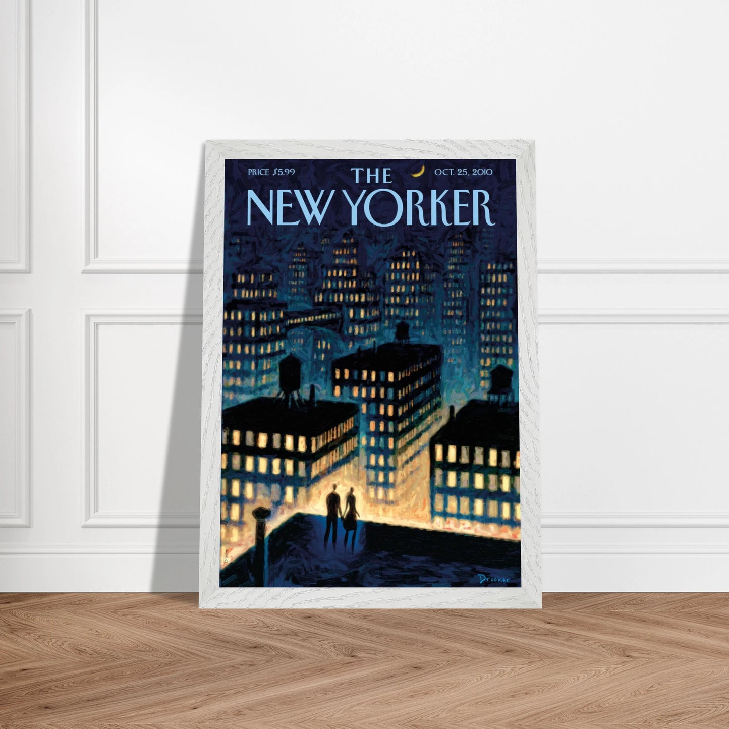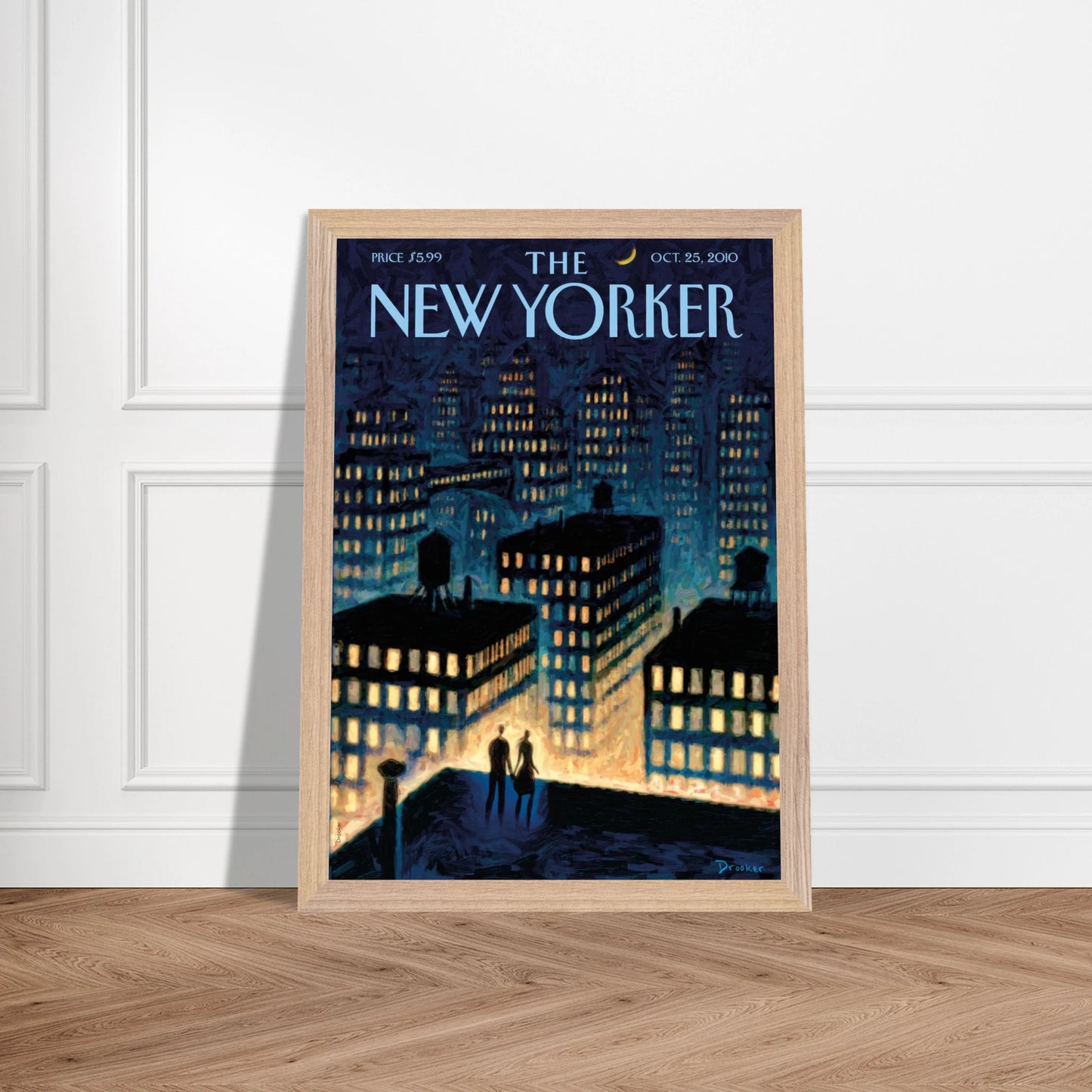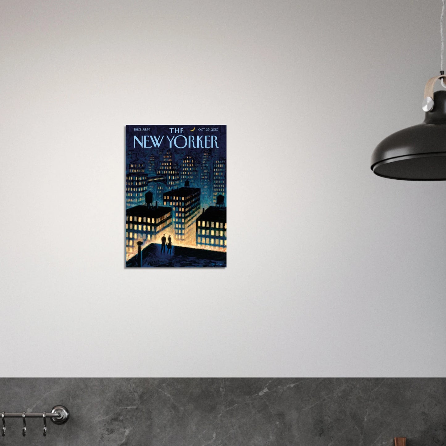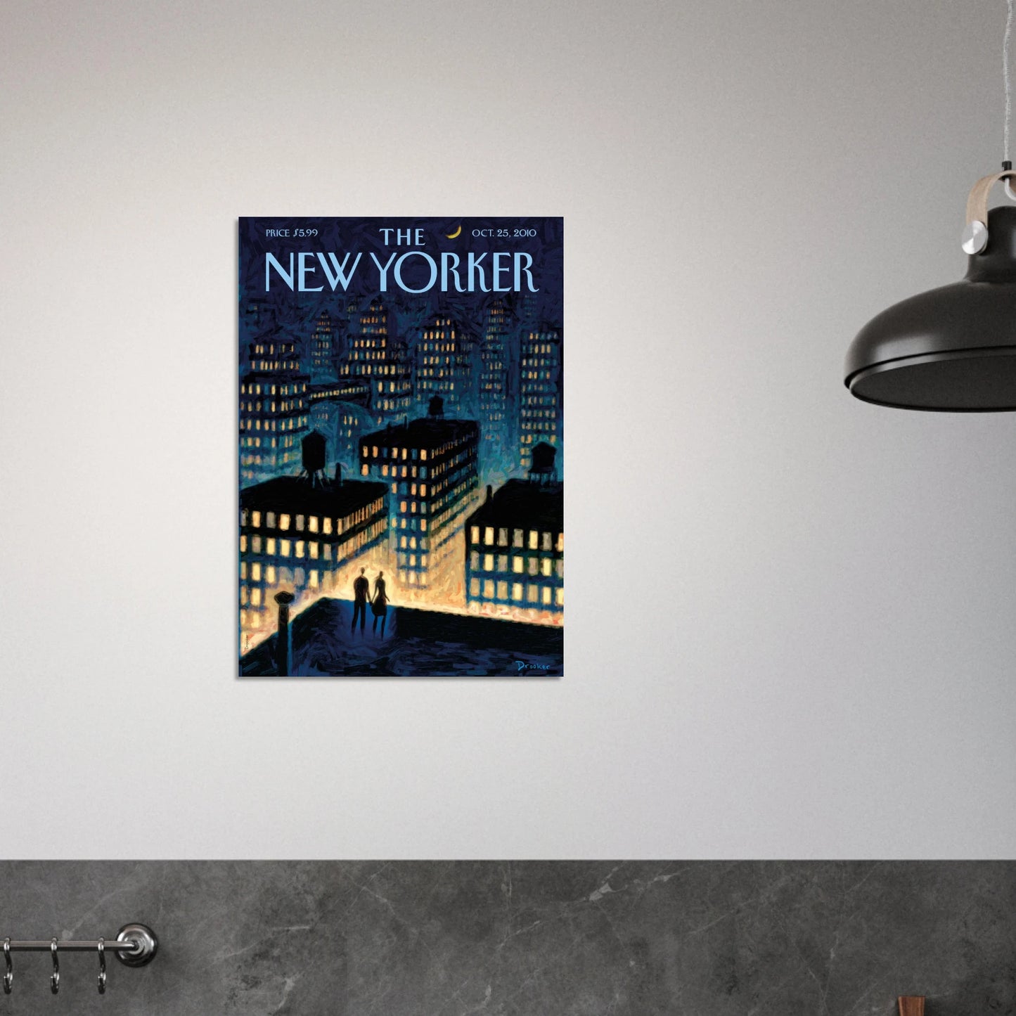 This cover for the October 25, 2010, issue of The New Yorker, titled "Rooftop," is by artist Eric Drooker. The illustration captures a deeply atmospheric and romantic nocturnal scene. A silhouetted couple stands hand-in-hand on a rooftop, looking out over a vast cityscape where countless windows glow with warm light against the deep blue of the night.
