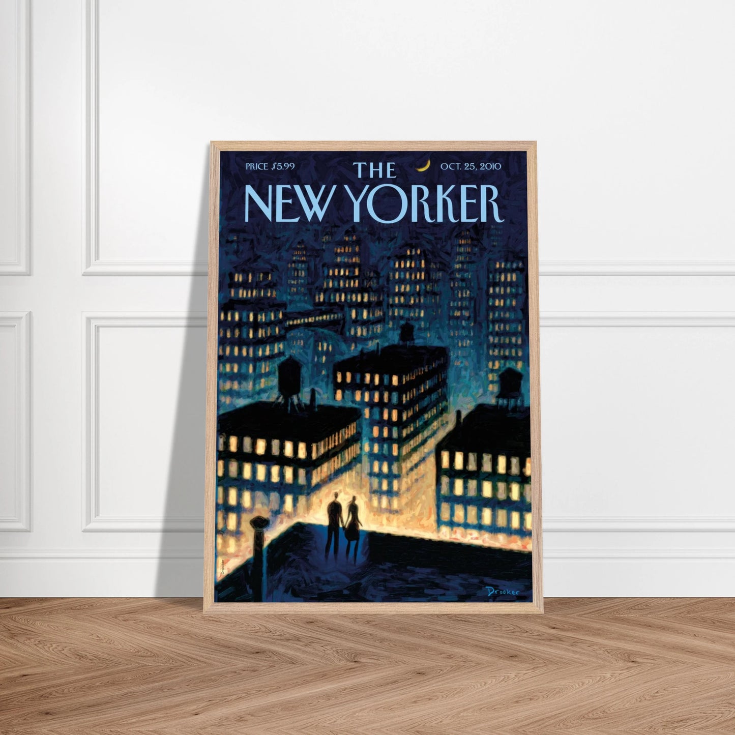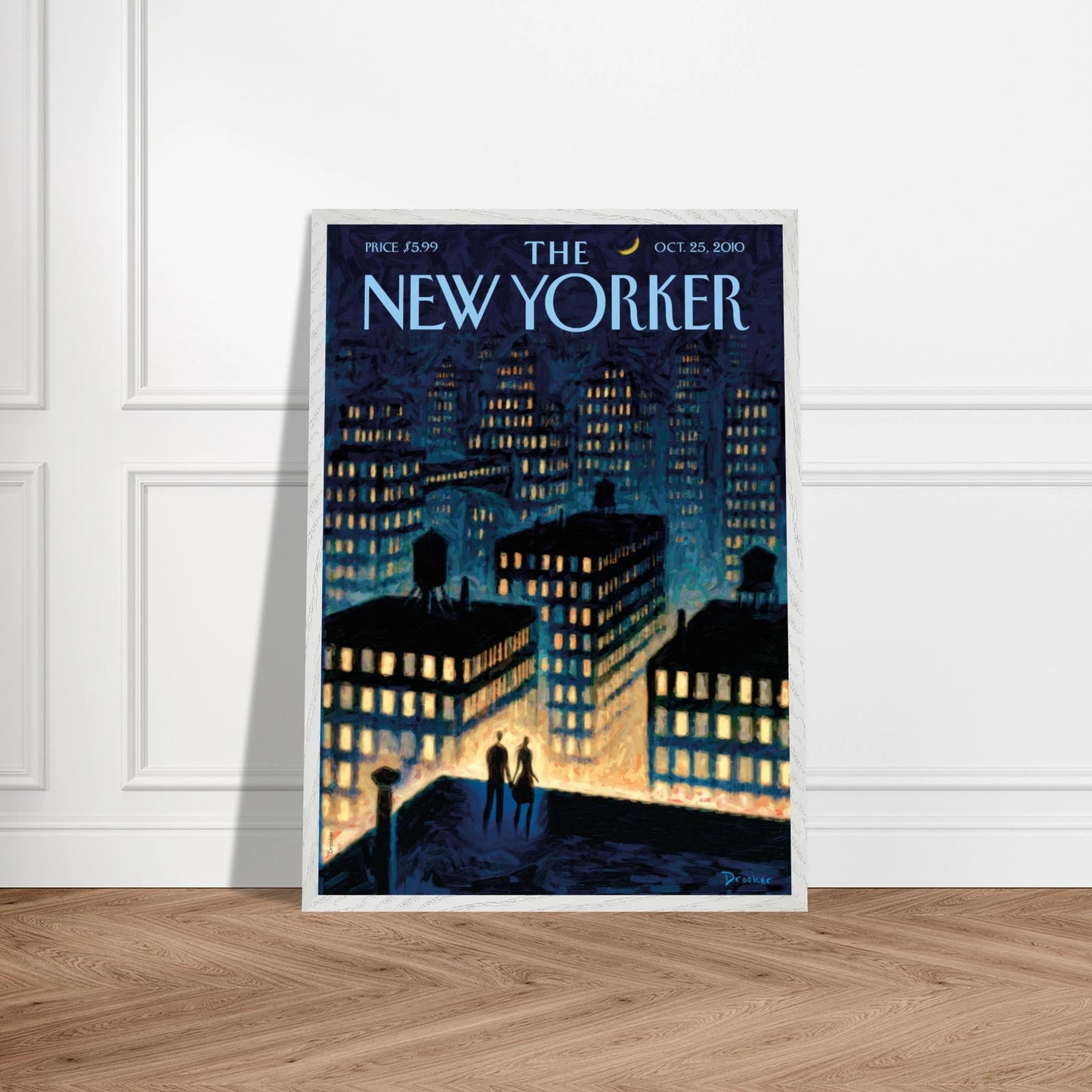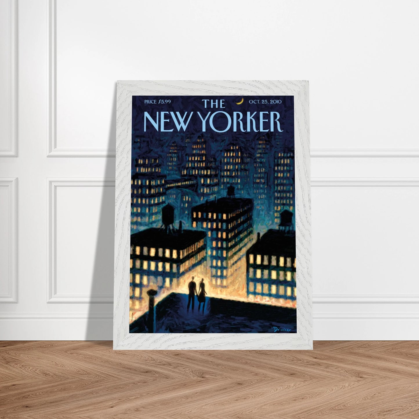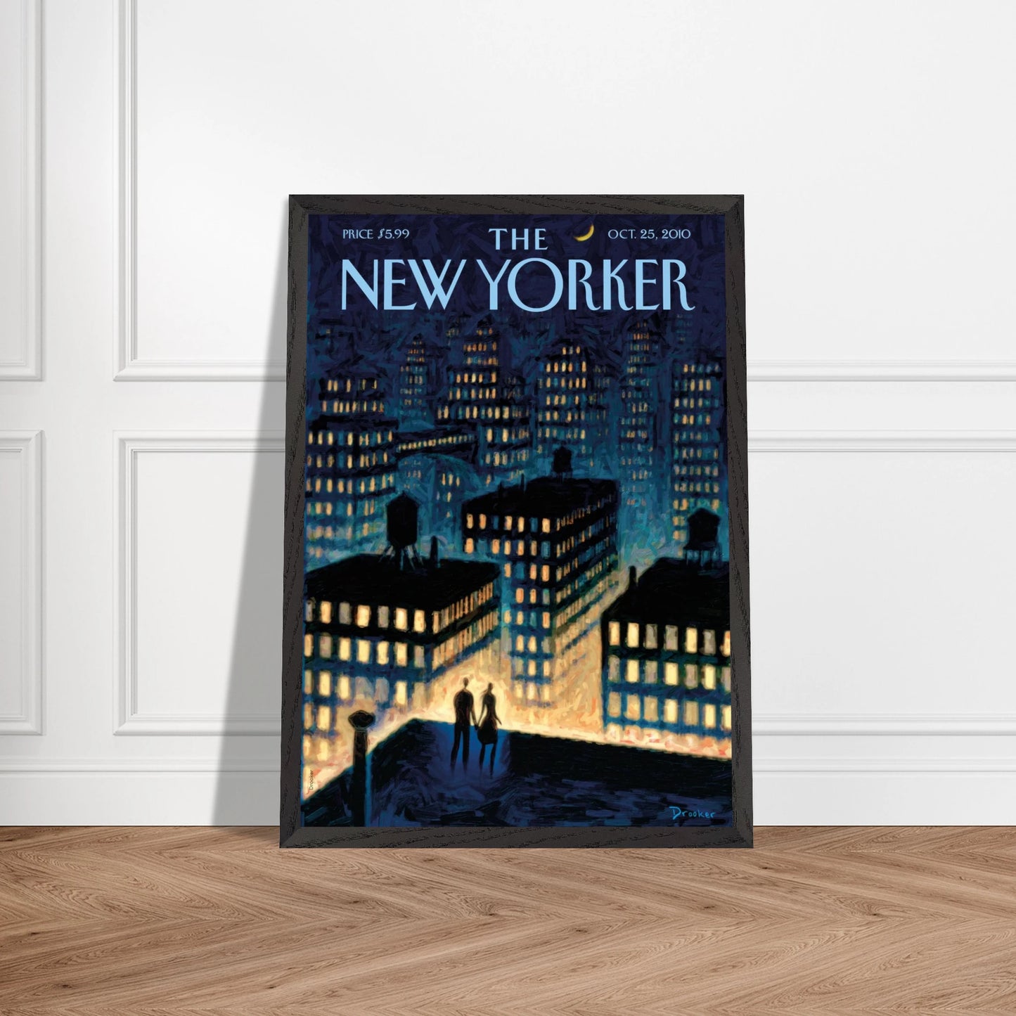 This cover for the October 25, 2010, issue of The New Yorker, titled "Rooftop," is by artist Eric Drooker. The illustration captures a deeply atmospheric and romantic nocturnal scene. A silhouetted couple stands hand-in-hand on a rooftop, looking out over a vast cityscape where countless windows glow with warm light against the deep blue of the night.