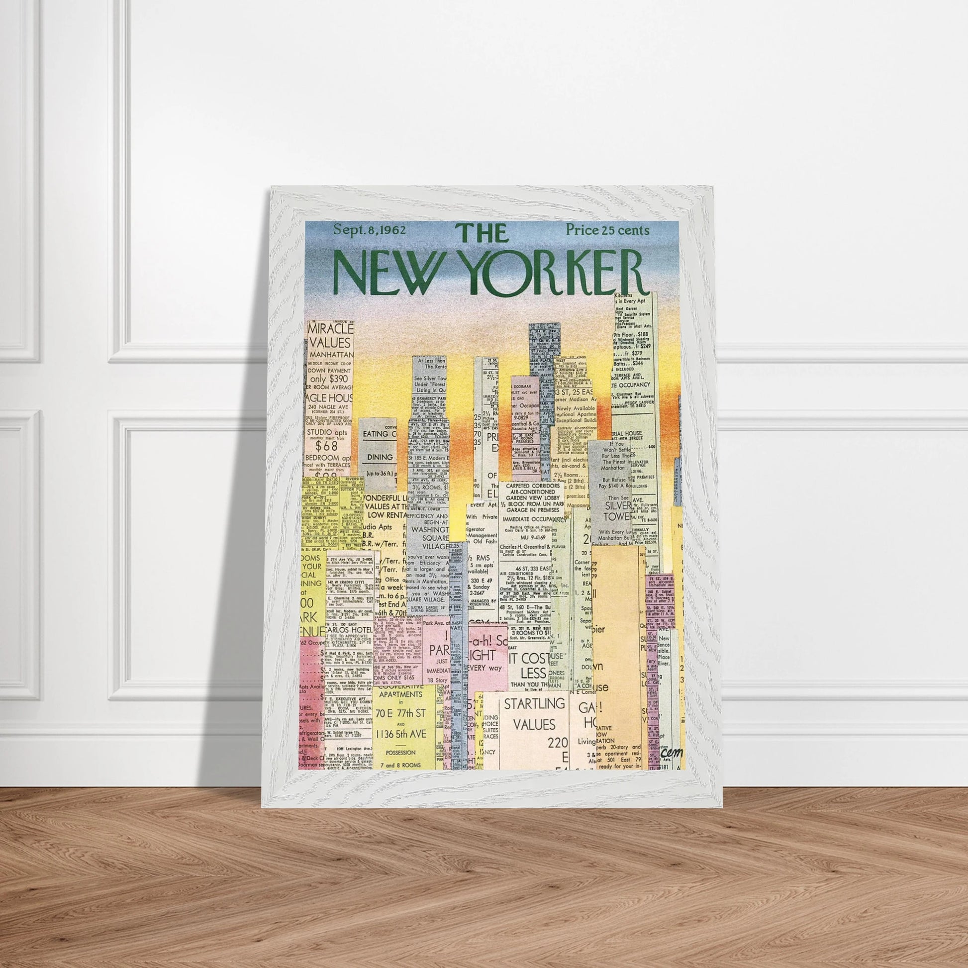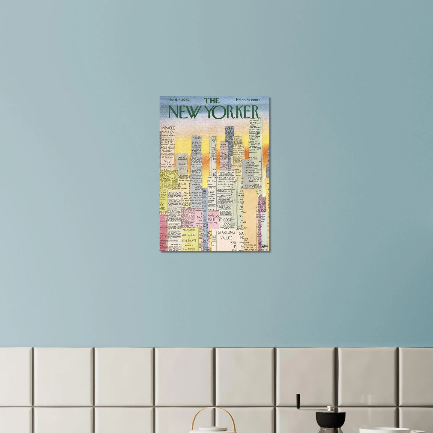 This cover for the September 8, 1962, issue of The New Yorker is a celebrated work by the influential American artist Romare Bearden. The artwork is a collage that cleverly depicts the New York City skyline, with the buildings constructed entirely from classified real estate advertisements clipped from newspapers.