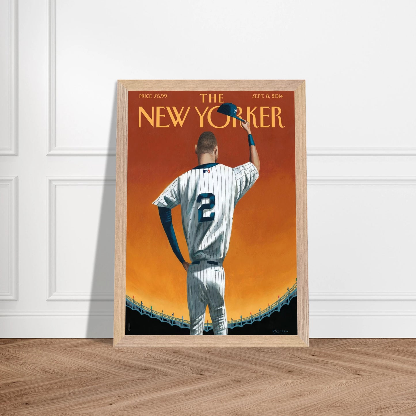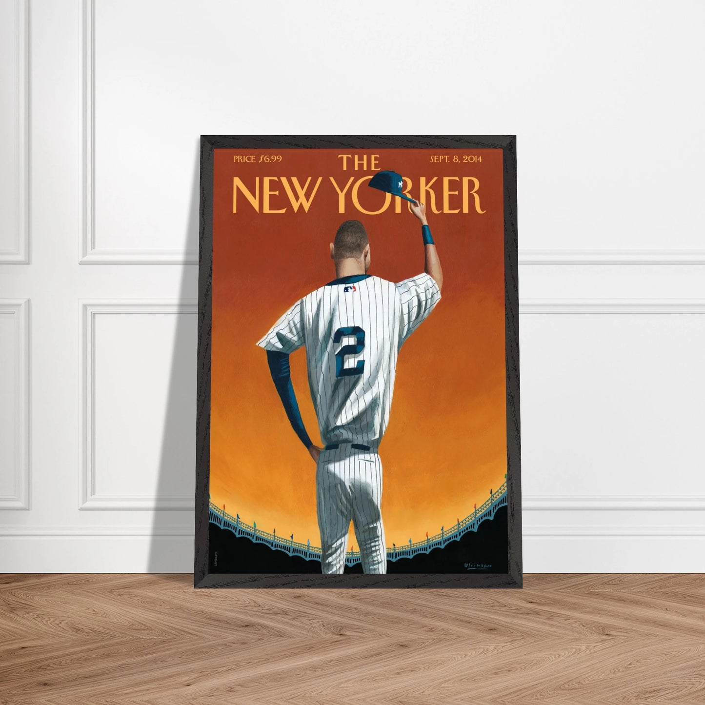 This cover for the September 8, 2014, issue of The New Yorker, titled "The Captain," is a tribute by artist Mark Ulriksen to the iconic New York Yankees shortstop Derek Jeter. The illustration was published near the end of Jeter's final season before his retirement. It depicts the beloved player from behind, wearing his legendary number 2 jersey and tipping his cap in a gesture of farewell against a glowing sunset.