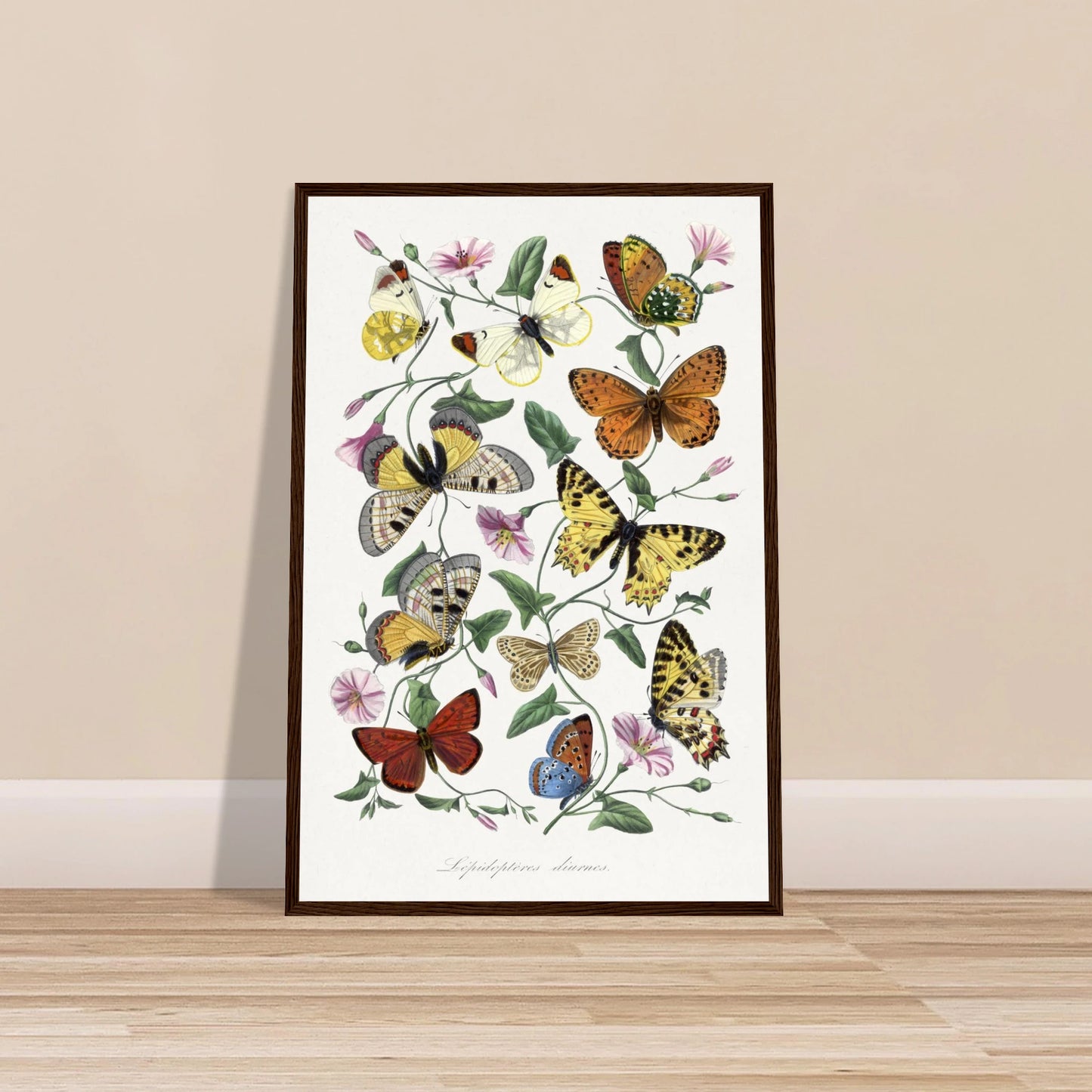 This is a classic 19th-century European natural history print by the French scientist Paul Gervais. The illustration, titled Lépidoptères diurnes (French for "diurnal Lepidoptera," or butterflies), features a beautiful arrangement of various butterfly species. They are depicted with scientific precision, resting on the delicate, winding vines of a flowering bindweed. The composition is both an educational plate for identifying species and a highly decorative work of art, showcasing the era's talent for blending scientific accuracy with aesthetic grace.