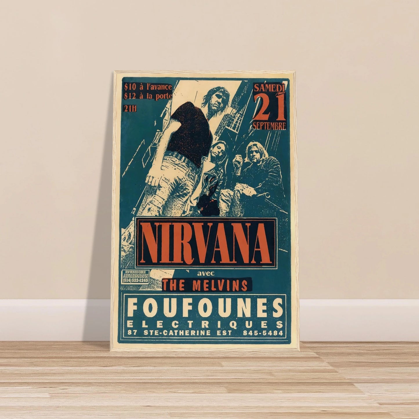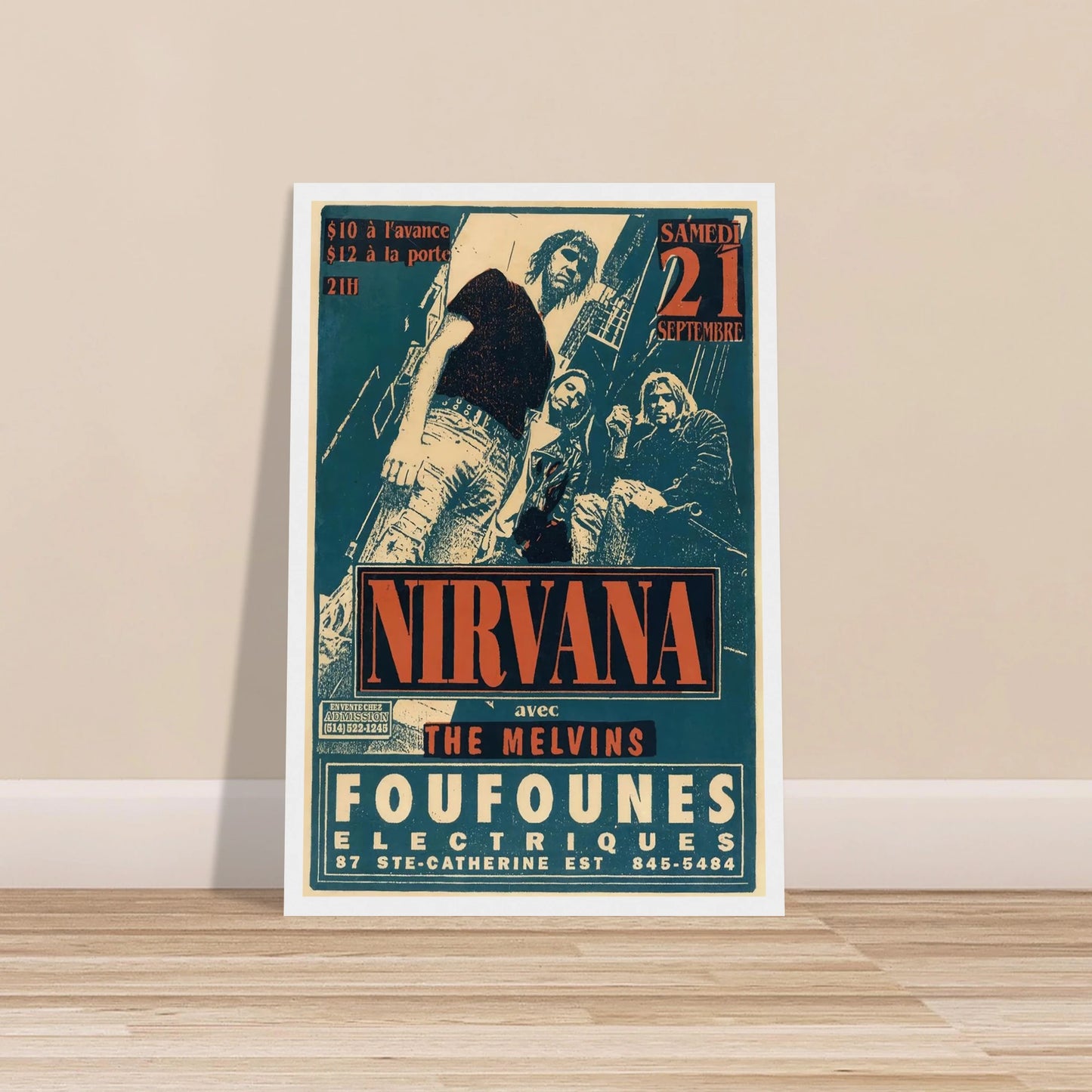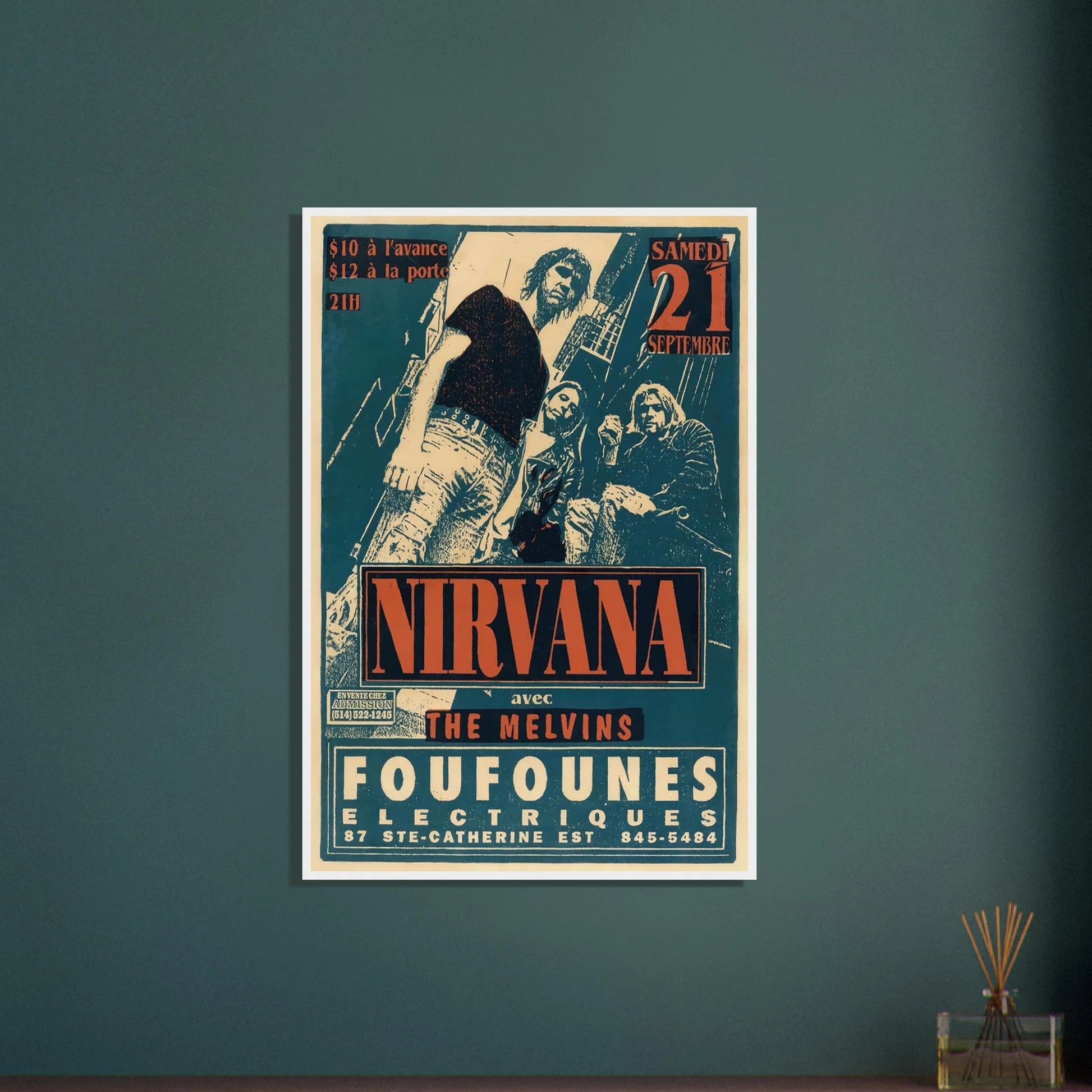 This is an authentic-style concert poster for the iconic American grunge band Nirvana, advertising a show on Saturday, September 21, 1991, at the Montreal club Foufounes Électriques, with fellow grunge pioneers The Melvins as the support act. The poster perfectly captures the raw, DIY (do-it-yourself) aesthetic of the early 90s alternative rock scene, featuring a gritty, high-contrast image of the band on stage and bold, functional typography. It is a snapshot of the band on the absolute cusp of international stardom.