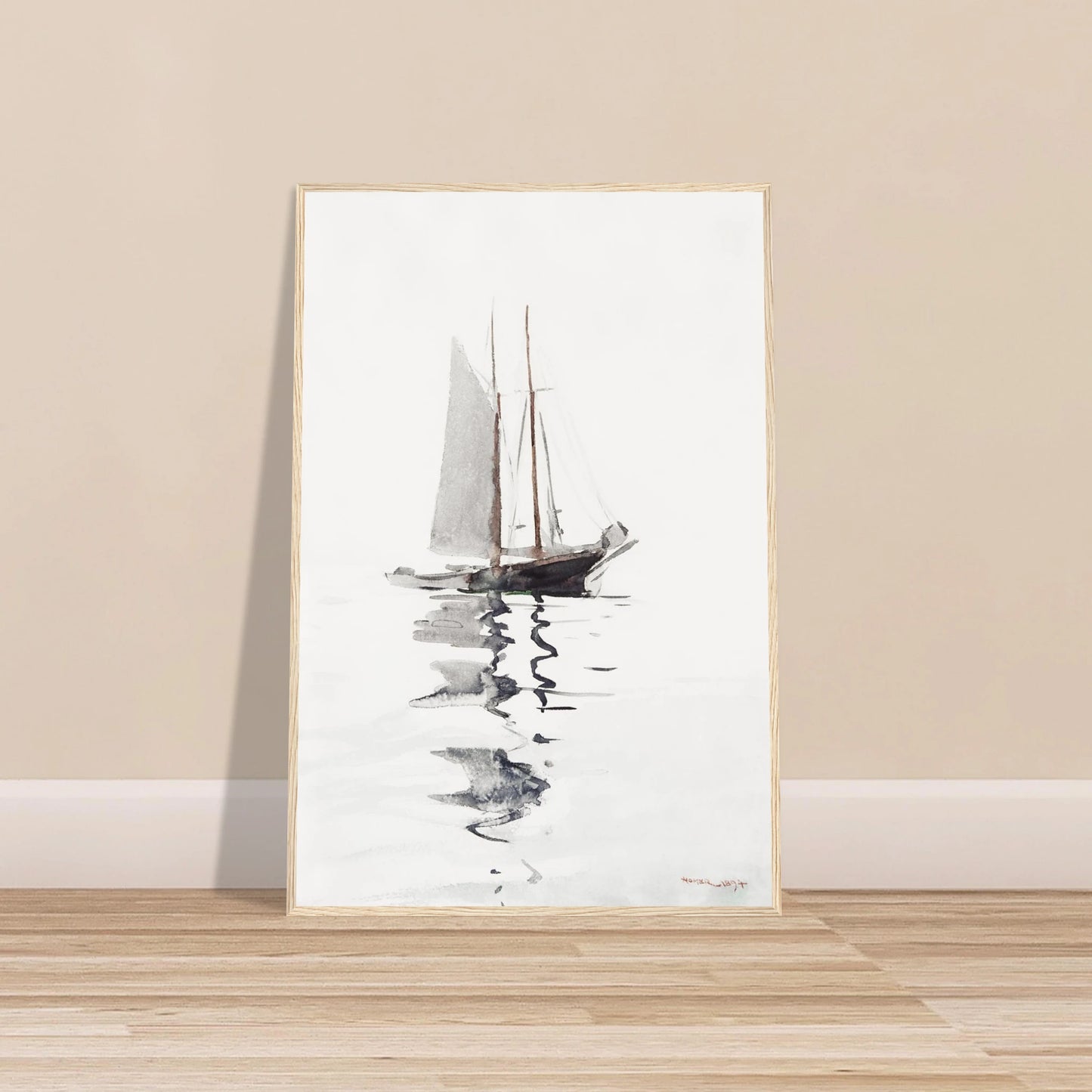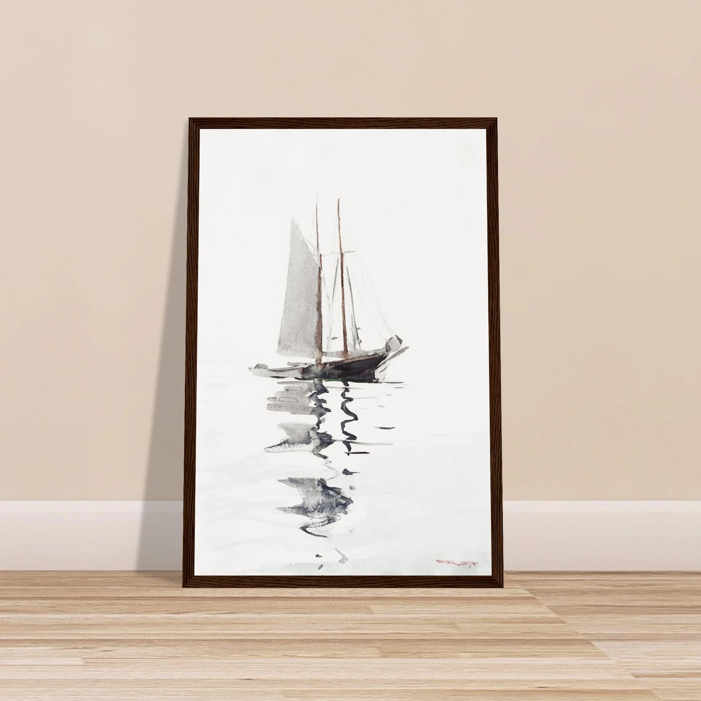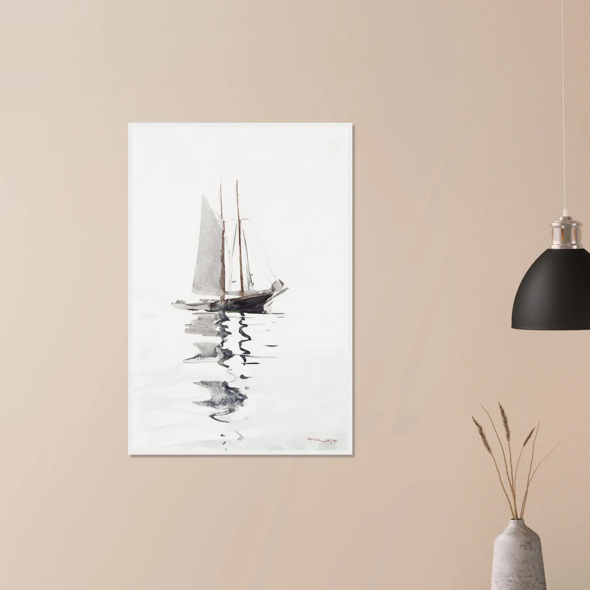This is a masterful and beautifully minimalist watercolor from 1894 by the celebrated American artist Winslow Homer, one of the 19th century's greatest painters. The artwork depicts a two-masted schooner at rest in calm waters, its form and reflection rendered with remarkable economy and grace. Using a limited palette of grey and brown washes, Homer expertly uses the white of the paper to convey both a bright, hazy atmosphere and the still surface of the water. It is a quiet, contemplative piece that showcases his absolute mastery of the watercolor medium.